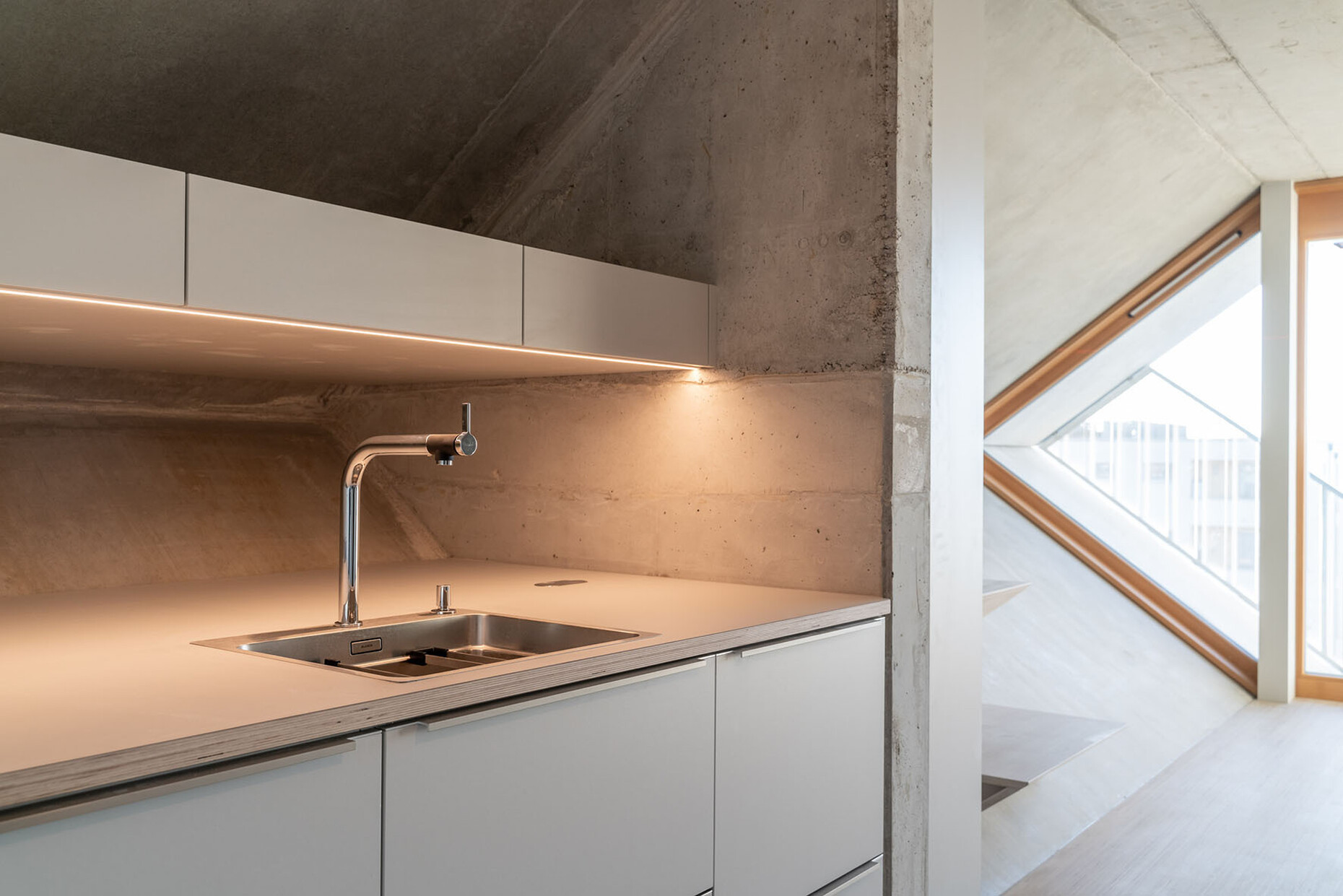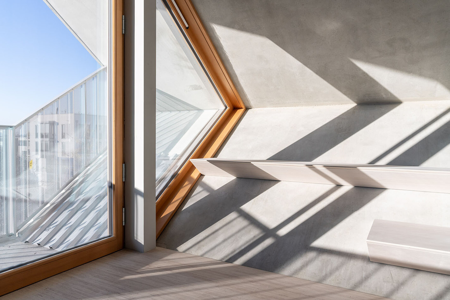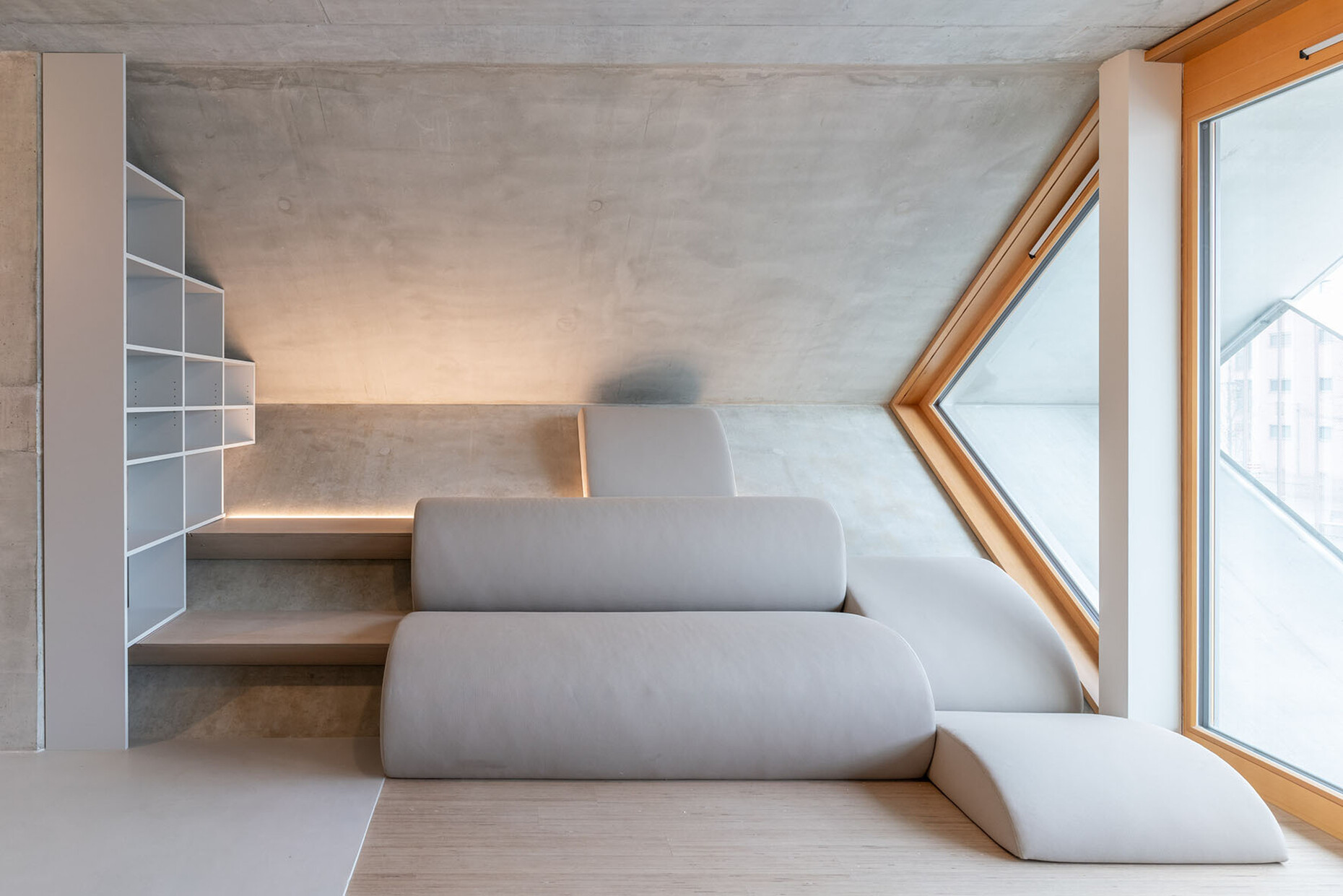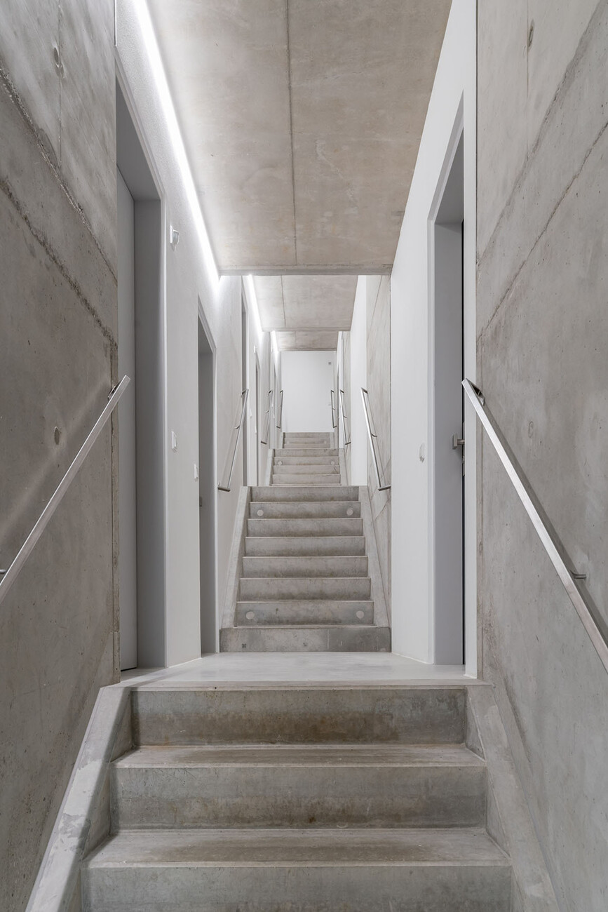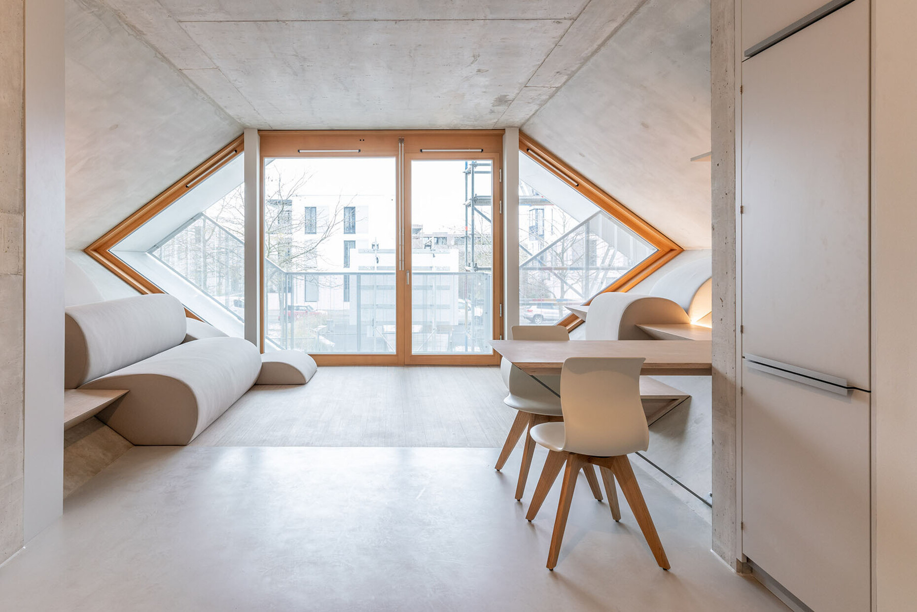 Architect Haimerl also calls for a rethink of living space itself. Living wall to wall, box to box is outdated. “With the slant, we have brought the third dimension into the floor plan,” he says. This interwoven living also generates a new sense of closeness to neighbors, a stronger sense of community.
