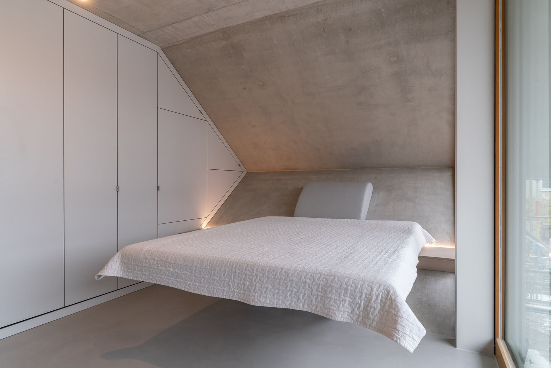 But it is not only the appearance that benefits from the honeycomb shape, says architect Haimerl, but also the functionality. For example, no more valuable space would be lost under tables, chairs and sofas. “In a honeycomb house, I can reduce this loss to zero,” he says. Together with a furniture maker, he has developed what he calls ‘semi-furniture’ that can be selected from a catalog before moving into a honeycomb – a bed, tables, chairs, benches. They project out from the sloping concrete walls or are piled up against them, so that the slants can also be used. This creates 30 percent more usable space. Reinhild Zenker assures us that the petrol-colored seat cushion in front of the window is really very comfortable. She didn't bring any of her own furniture, only her solid wood table top. Anyone who moves into the honeycomb house leaves their furniture behind. “People tell me how liberating it was to simply move into a fully furnished apartment and not have to think too hard about where to put which furniture and how to set it up,” reports Peter Haimerl. The built-in cupboards, which extend up to the ceiling and into the last corner of the sloping ceilings, are practical. “You need a certain amount of mobility to get at all your things,” says Reinhild Zenker, ”I use a small ladder for that. We'll see how long that lasts in view of old age.”