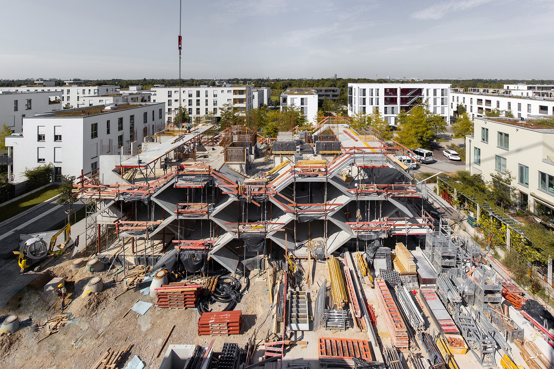 The honeycomb apartments are not barrier-free and are not cheap either. According to Wogeno, the construction costs are a good third higher than for a conventionally built residential building. Nevertheless, rents in the project, which is subsidized as a conceptual rental housing project (KMB), are only 12.10 euros per square meter – well below the Munich level. In order to reduce the construction costs of further honeycomb houses, the aim is to use serial production. The honeycombs consist of in-situ concrete ceilings and sloping semi-finished concrete elements. “We chose the hexagonal shape because it has proven itself in nature,” says Peter Haimerl. Its volume-to-perimeter ratio, i.e., the ratio of the volume of material used, is the most favorable. If the cross-sections of the honeycomb tubes are all the same, it comes quite close to modular construction.