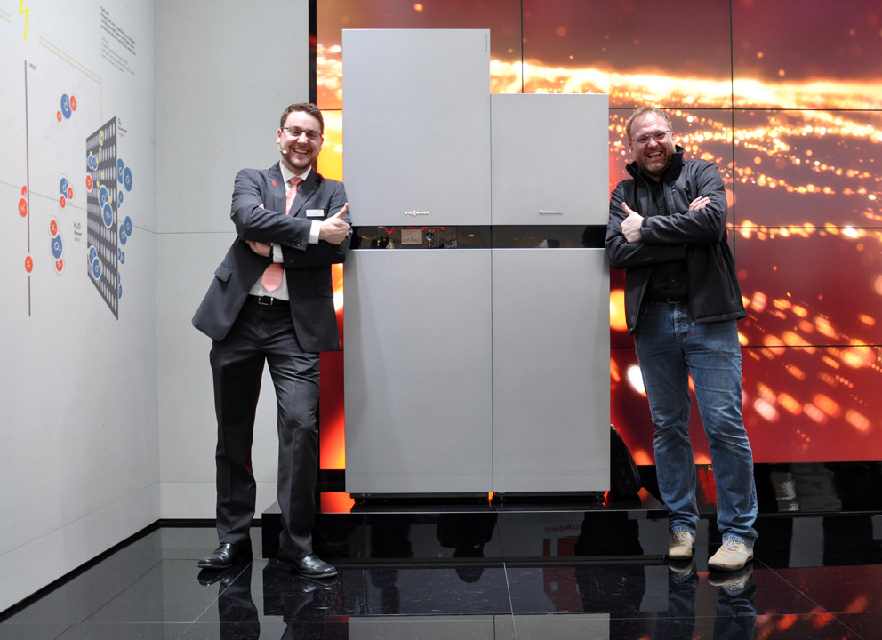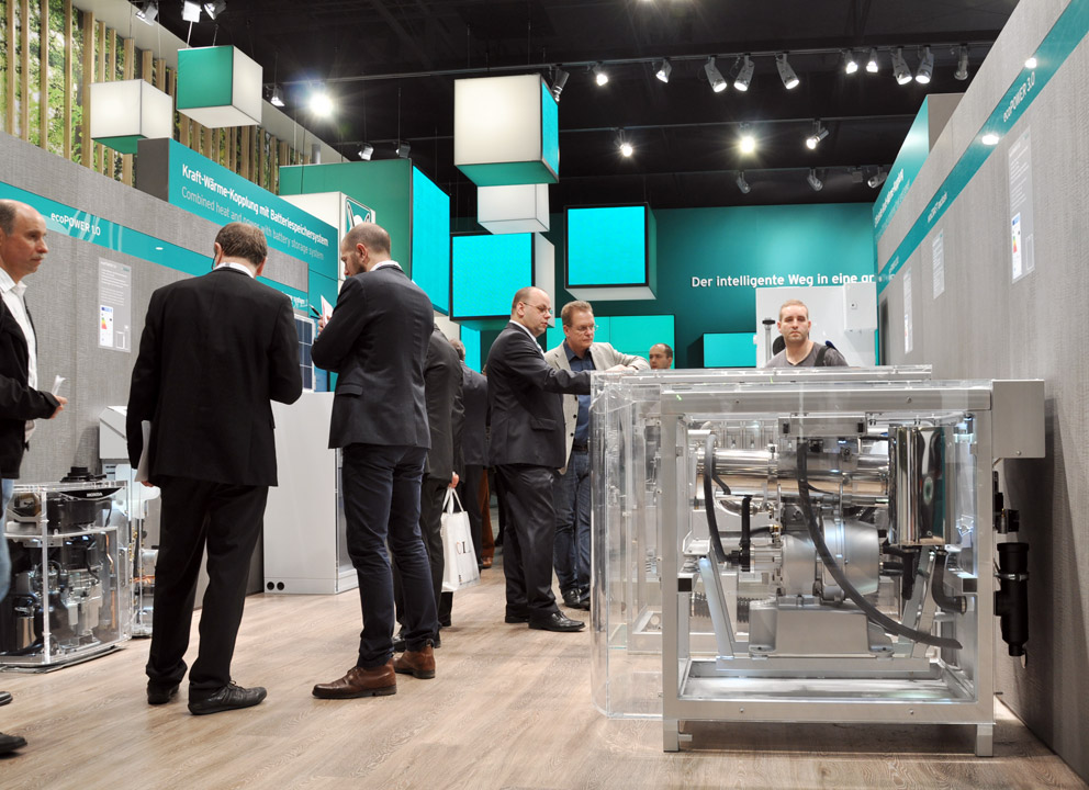 The current no. 3 among the German heating technology corporations is Viessmann and seems streets ahead of its rivals in design terms. With sales of EUR 2.2 billion and currently 11,500 employees, like Vaillant it remains family-owned and covers the entire spectrum of heating technology. Despite the related diversity, Viessmann focuses on three main themes: “Hybrid”, “Connect” and “Power”. The booth design corresponds perfectly with the trade-fair hall, designed back in 1967 by Rambald von Steinbüchel. Three towers, each eight meters high, create the trade-fair eye-catcher. “Hybrid” stands for heating plant that combine condensed heating and heat pump units, each fully automatically selects the most favorable operating setting depending on the outdoor temperature and energy price. Under the slogan of networking, the company spotlights building energy management per Touch display or App. The topic of “Power” highlights electricity generation, use and storage, with the cogeneration handled by a Stirling engine and a fuel cell from Panasonic.