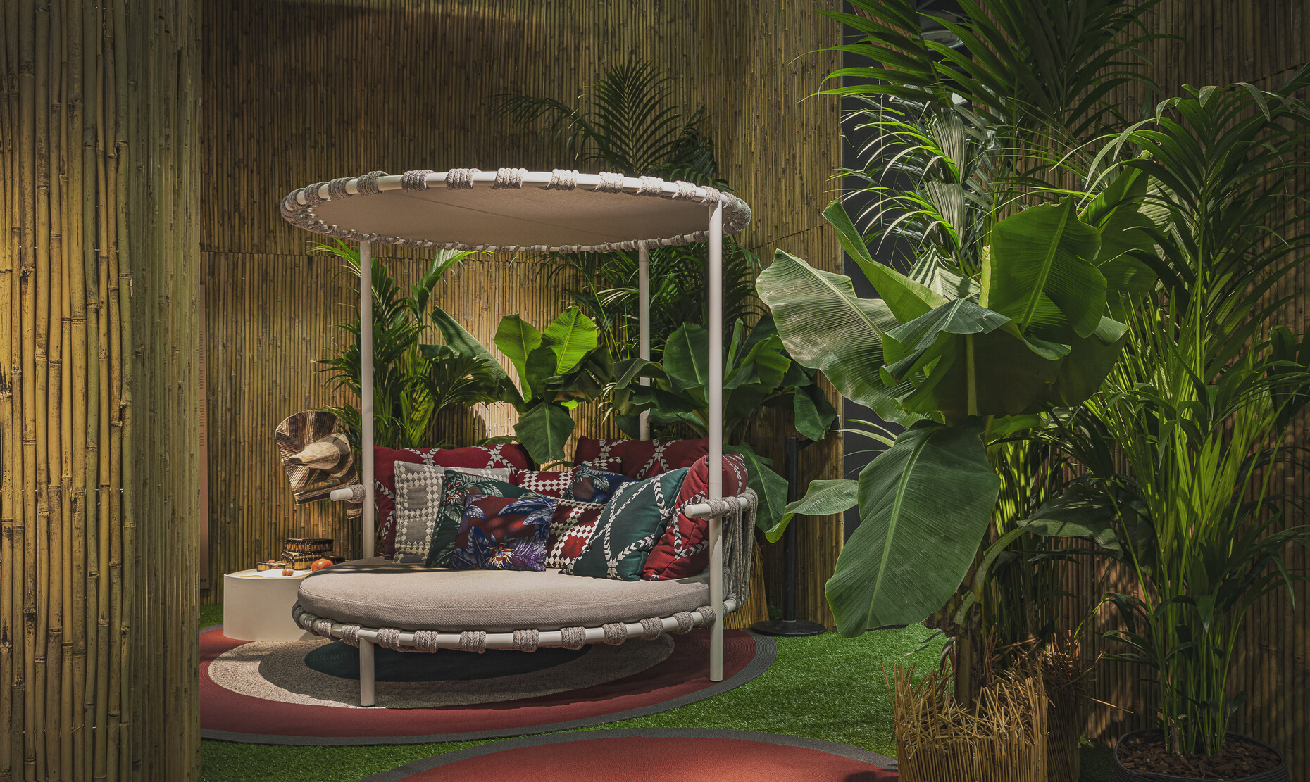 Despite this kind of technically intricate additional functions, the large manufacturers do prefer to leave the subject of “living in a small space”, something that truly is of great relevance, in view of the way that property prices keep soaring in our cities, either to specialists such as Müller Small Living or even to IKEA. Indeed, one could almost believe that many companies have reached the conclusion that living spaces must be getting smaller because gardens are getting larger. An increasing number of space-filling garden furniture items destined for patios the size of an average person’s home is flooding the market. And now Cassina has joined the fray, offering the garden lovers amongst the oligarchs and technology millionaires outdoor furniture by Rodolfo Dordoni, something known as a “love bed” with the dimensions of a small hall, by Patricia Urquiola and a furniture suite with a table dreamt up by Philippe Starck. The latter presented his design, a menacing-looking affair made of wood, steel and knitted textile, surrounded by hordes of fans, many of whom appeared to come from regions all over the world, regions where the target audience for “Fenc-e Nature” are to be found. Starck claims to have created a “sentimental product”, as he “always does”, and, having shouted this to his audience, simply disappeared from view.