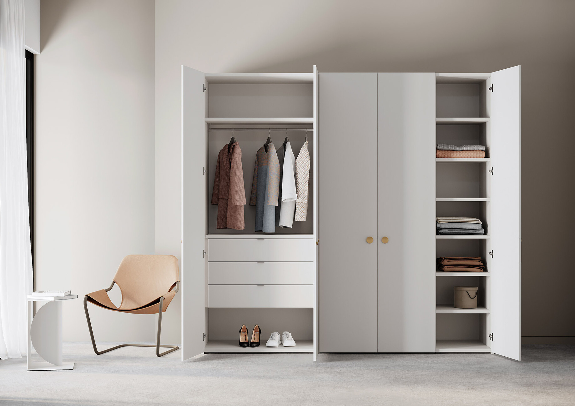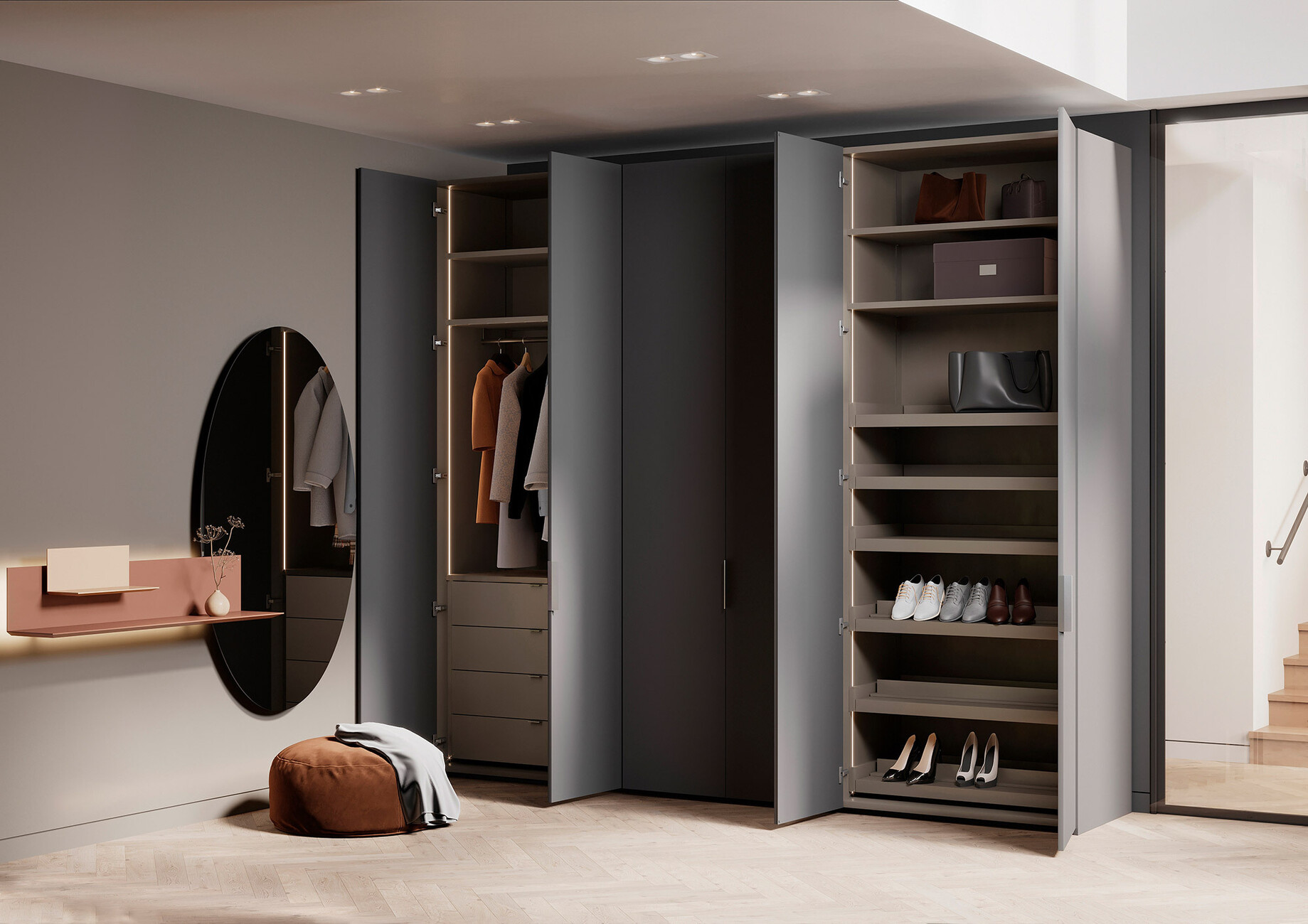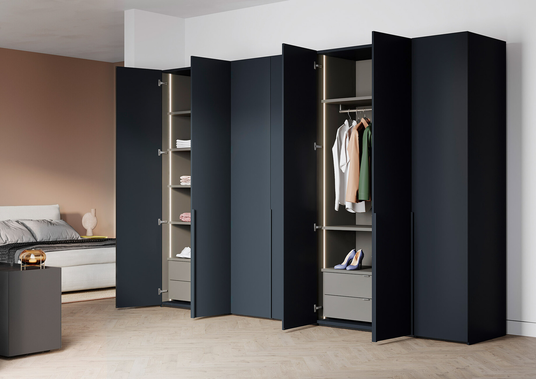 The "intaro" wardrobe system from interlübke is available in three heights, two widths and one depth and thus offers a variety of uses - from the hallway to the bedroom. The recessed plinth, which is only 2.5 centimetres high, gives the wardrobe a slightly floating look. The handles also offer freedom for your own ideas: There are three different variants to choose from, from the circular, diagonally attached "dot" from the design by Hanne Willmann, to L-shaped profile handles and the handle strip integrated into the front edge. Both the handles as well as the doors and exteriors can be lacquered in different or uniform shades, from classic snow white to rich burgundy to discreet metallic bronze. Clarity is the order of the day in the inside: one-piece back panels, invisible back panel fixings and perforated rails that offer flexibility in individual storage space design and avoid unsightly drill holes. Shelves, clothes rails, pull-out units and drawers can be easily fixed in the perforated rails and also easily moved or added to at a later time. (am)