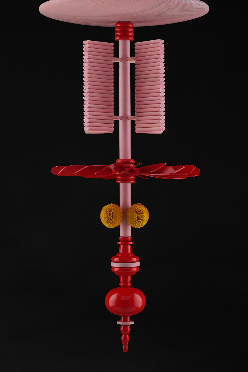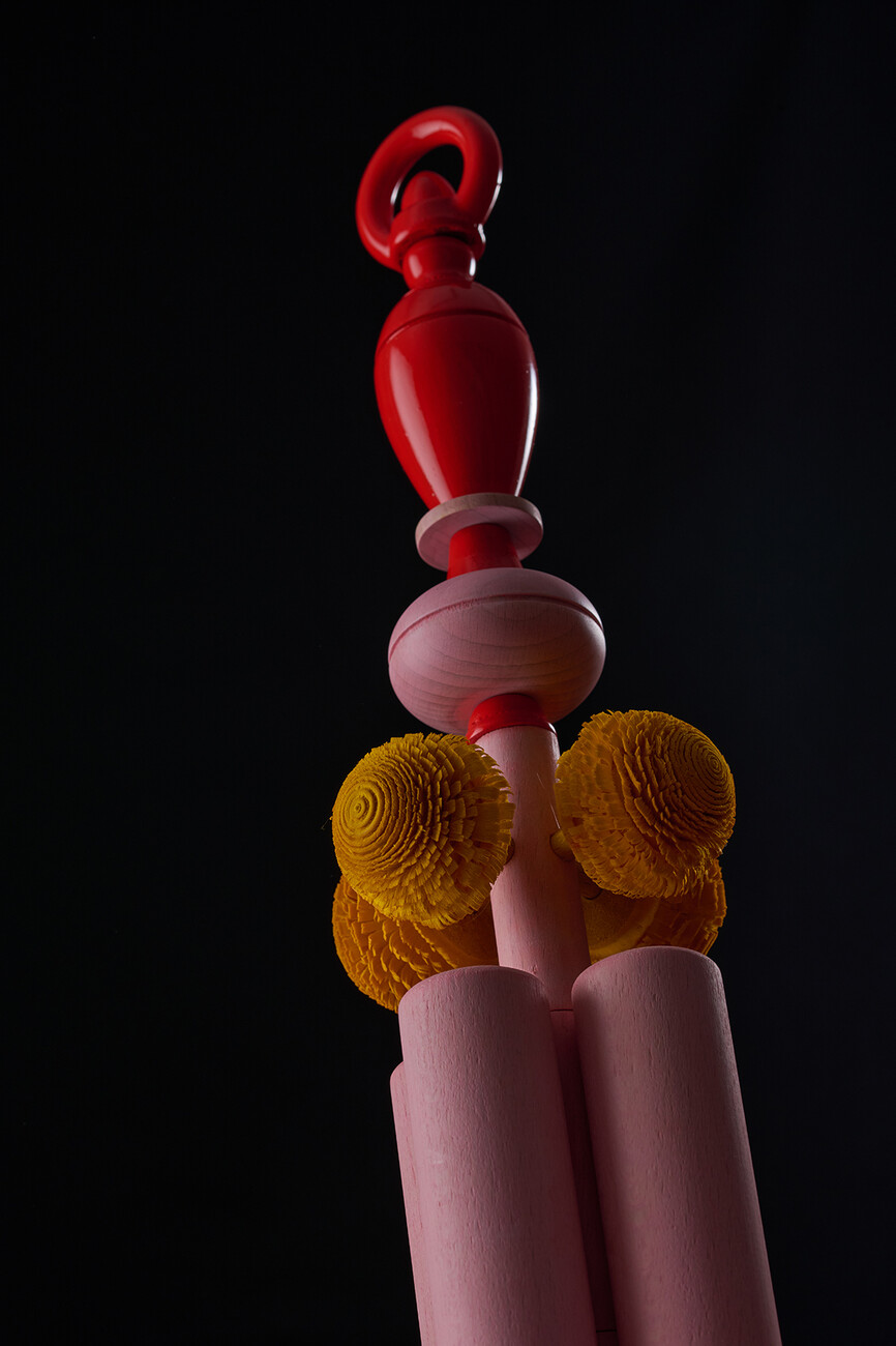 Johanna Seelemann: We are currently developing an object that will soon be shown in the "Wood Land" exhibition curated by Alice Stori Liechtenstein at Schloss Hollenegg for Design. The project with the woodturning co-operative gave rise to the idea of making a "Leuchterspinne" ("chandelier spider") together. Due to the history of mining, the Erzgebirge had a special relationship with light. In the 18th century, these chandelier spiders were created in an attempt to reproduce chandeliers or chandeliers with the means available, using wood. This gave rise to a separate object category that hardly exists today. Only a few people still produce them, and then in a simplified form, often for the Christmas context. Originally, the pendant lights were very complex; they were made for weddings, for example, or for special events. The design language was partly naïve, partly crazy, but really beautiful and very fascinating. We wanted to transfer the shapes into non-Christmas object typologies in order to reach a different market than the classic market for traditional wooden objects from the Erzgebirge. That's why we made a lamp that is very playful and looks more like a space station, but is still reminiscent of this Leuchterspinne. It's about translating traditional technology into new object typologies.