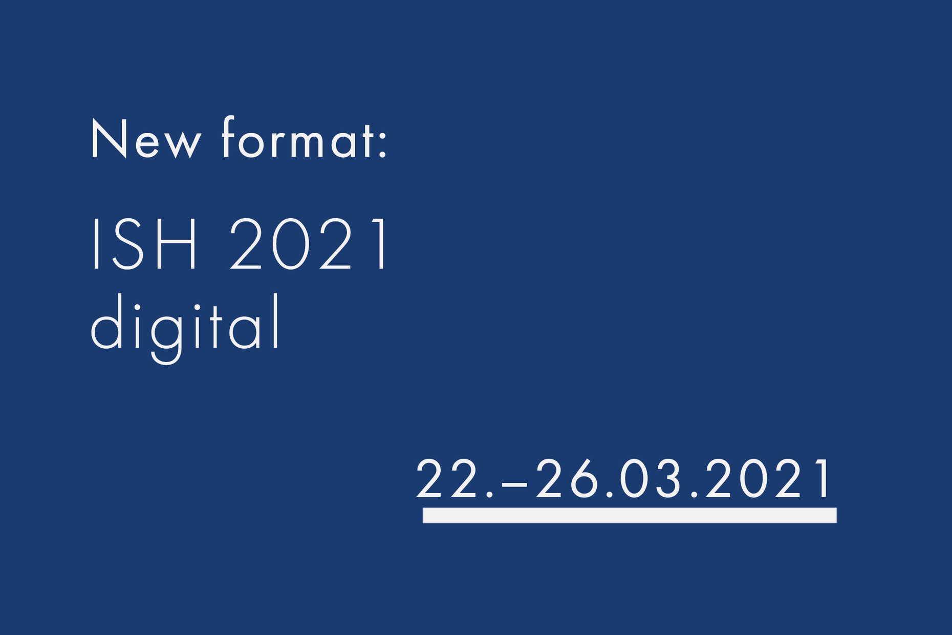 Due to the worldwide development of the Covid 19 pandemic and the associated travel restrictions, Messe Frankfurt and the conceptual sponsors of ISH have decided to hold ISH 2021 digitally.