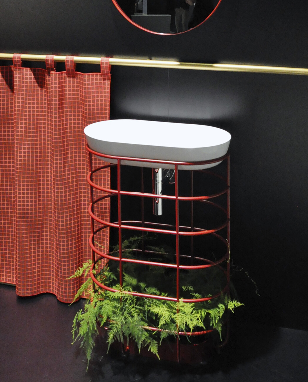 The Ancient Greeks and Romans come more to mind with the washbasins that look like high, narrow fountains or barrels and, because they stand firmly on the ground, require no stand, e.g. the egg-timer-shaped marble “Origin” created by Inbani.