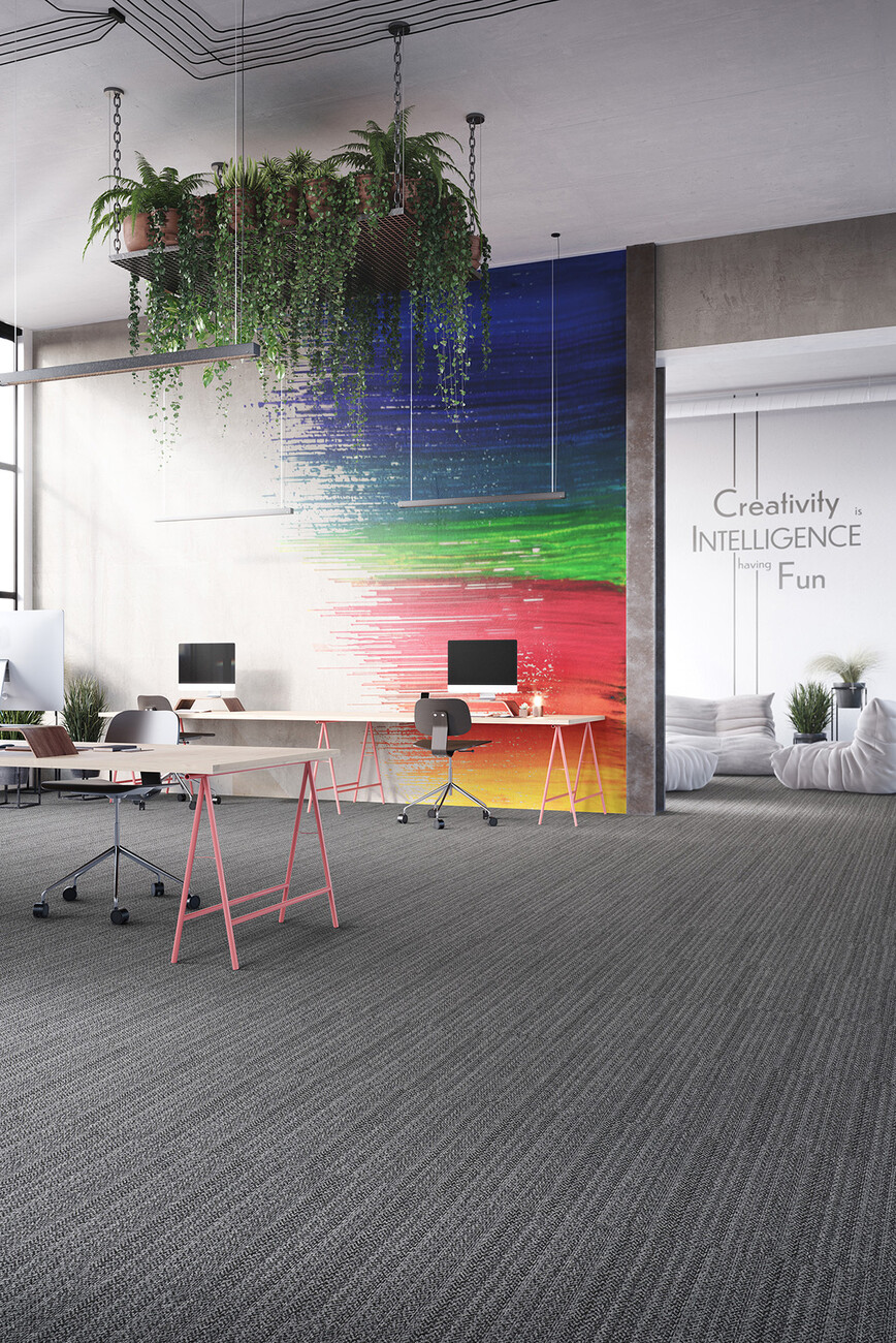 The Belgian brand IVC Commercial was founded in 1997 and is today one of the leading suppliers of Luxury Vinyl Tiles (LVT), Heterogeneous Vinyl, CV and carpet tiles. "Blurred Edge 854" is one of the latest novelties from IVC Commercial: made from 100 per cent solution-dyed fibres, the carpet tile is very robust, allergy-friendly and colourfast, as the pigments are already added during fibre production. This allows IVC Commercial to save on useful and waste water during the production of the dyed-through yarn. The textured, two-tone design with vertical lines can also be integrated into a variety of architectural settings, be it office space, hotel space or lounge. With a new colour spectrum ranging from natural earth tones to bold dark red, the Art Intervention collection "Blurred Edge" also makes it easy to set individual accents. (am)