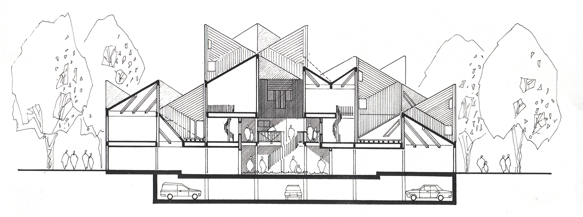 Iwona Buczkowska: As soon as I arrived in Paris, my class went to visit a construction site in Ivry. It turned out to be Les Étoiles d’Ivry, a social housing project designed by Jean Renaudie. It was a shock to me. I was very impressed by the freedom of the architect’s vocabulary, by the expressive force of the buildings, which avoided any of the orthogonality in which I still believed at the time, at least for housing. So I started to discover the freedom of architectural expression in the horizontal planes of the jagged geometries of Renaudie and Gailhoustet. Also I discovered the freedom of expression in the vertical oblique planes of Claude Parent and the importance of load-bearing systems in the space frames by Yona Friedman and in the tensegrity structures by David Emmerich. It seemed there were infinite possibilities. I tried to find my own path through the use of oblique constructive frames or supporting arches in connection with free floor plans.
