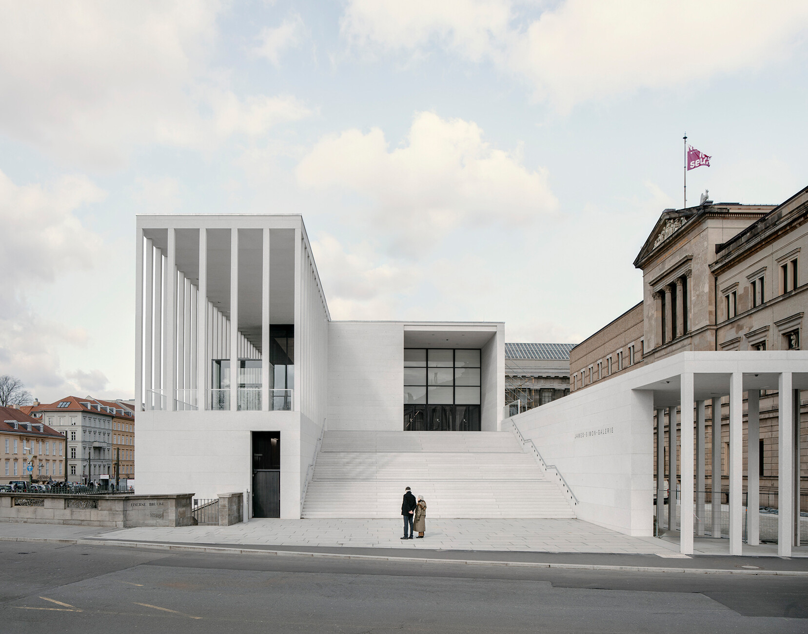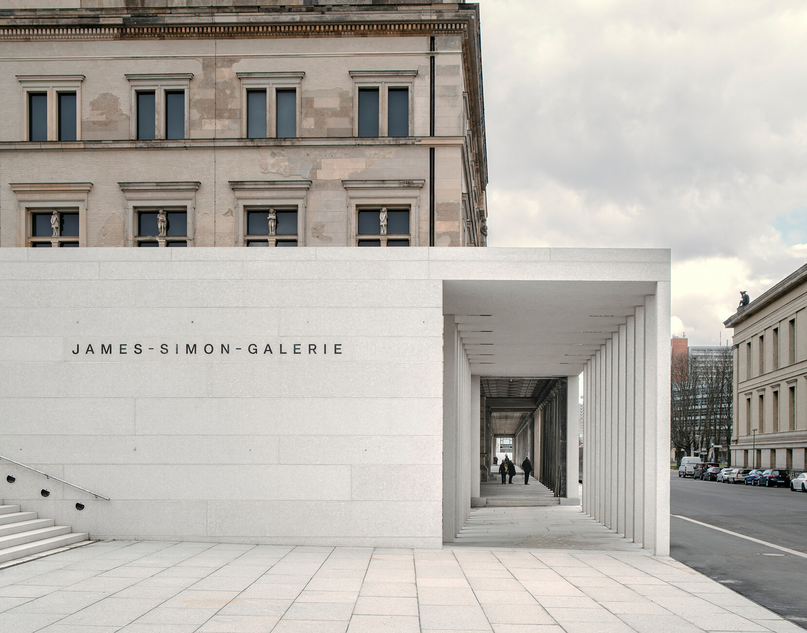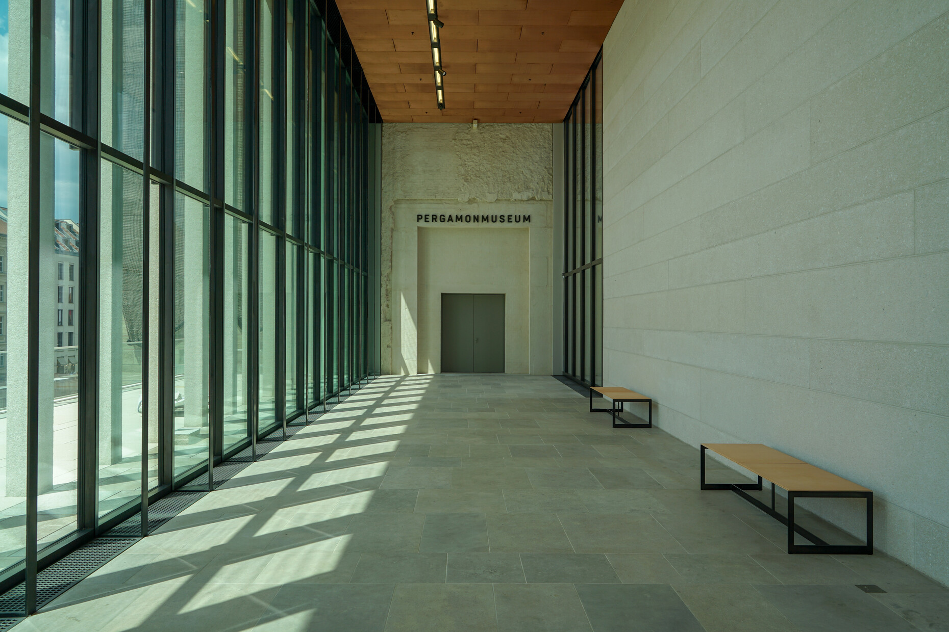 The addressing of German Neoclassicism in general and Schinkel in particular puts the James-Simon-Galerie in a tradition with the Neue Nationalgalerie at Berlin's Kulturforum and the Neue Staatsgalerie in Stuttgart. Like Mies van der Rohe and Sterling, Chipperfield and Schwarz are looking for the timeless in architecture, the synthesis of classical and modern shapes. The result is a reflection on the particular location on which this edifice is built and its function as an entrance structure. But it is just as much an attestation in stone of respect for the architects of the Museumsinsel.