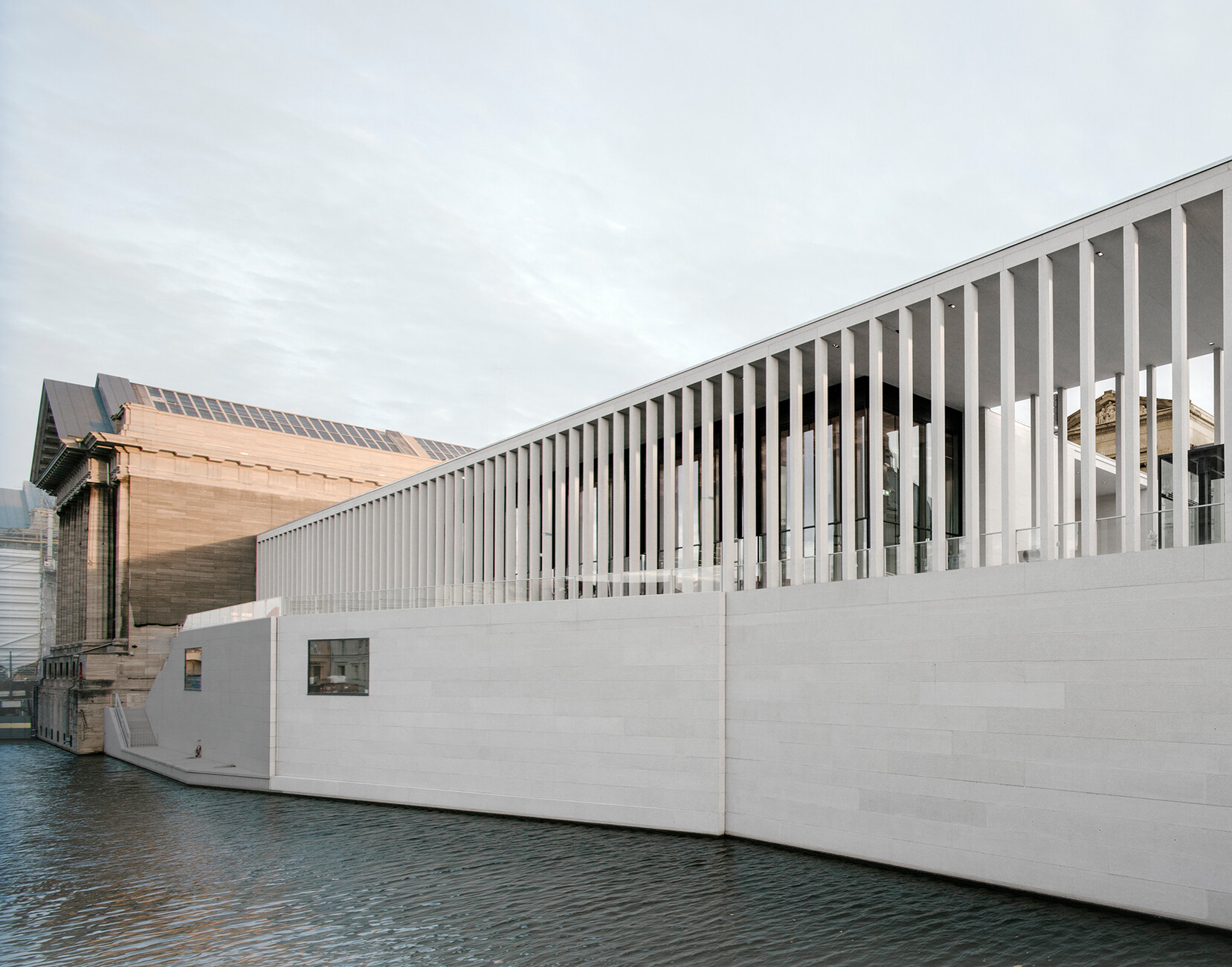In their museum building, David Chipperfield and Alexander Schwarz bring together the two motifs of belvedere temple and colonnades. The two typologies meld here. The pillared structure along the River Spree not only references the colonnades of the Stüler structures. Indeed, at its open end the architects round it out with six columns like a temple porticus. It is a colonnade and belvedere temple in equal measure. The vantage point and the path leading to it become an uninterrupted flow of movement. With their sensitive and knowledgeable design, Chipperfield and Schwarz adopt a clearly opposite stance to the approach pursued, for example, by Bjarke Ingels and his BIG studio. They oppose a concept that sees the design process as serving the maximization of benefit. The James-Simon-Galerie unmistakably represents an all-embracing artistic level that extends as far as the wonderful benches the studio designed for the structure.