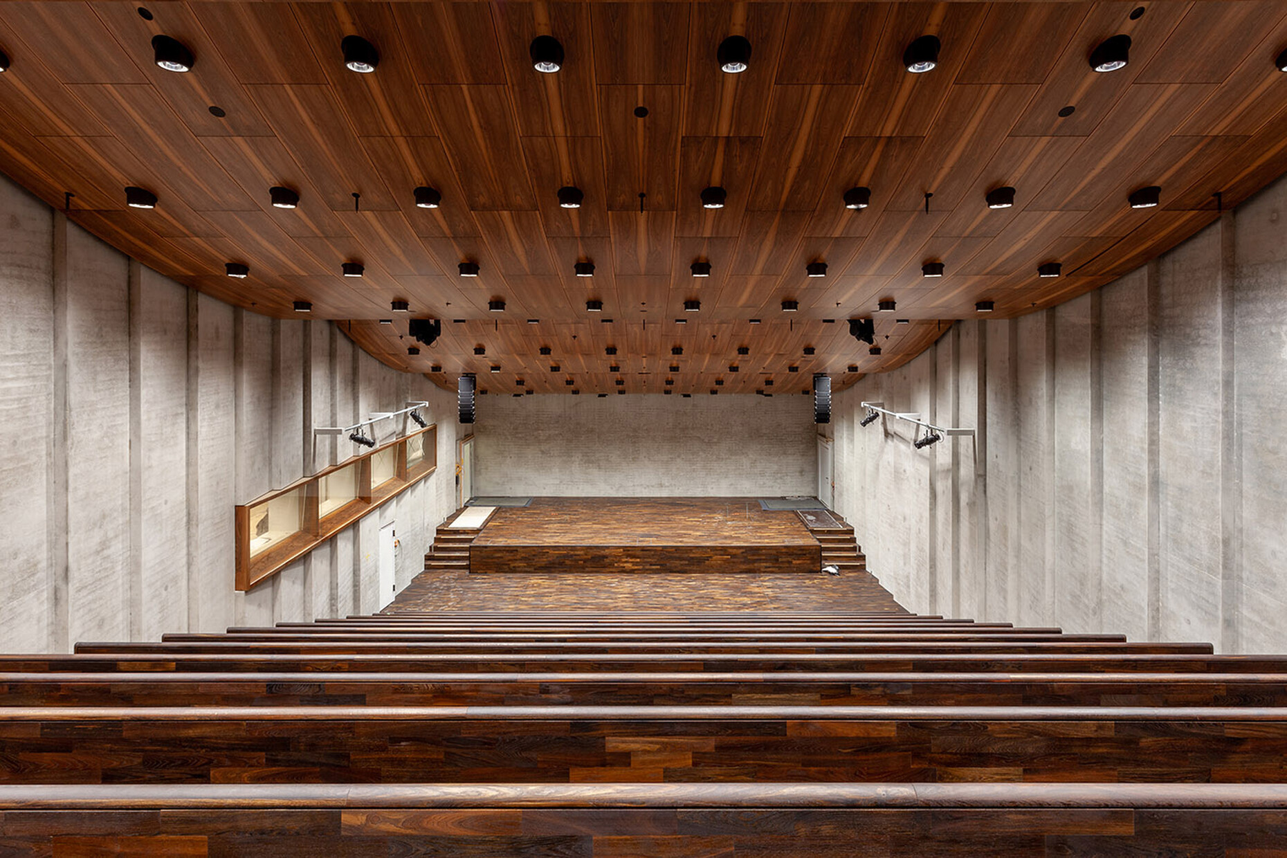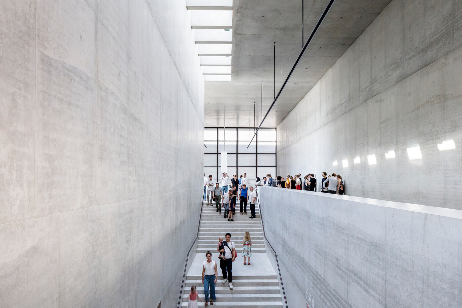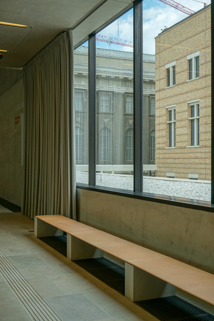 The interior features neither a large hall nor a monumental reception area. Instead there are two foyers – a lower one at street level and an upper one at the end of the large set of steps, both of them, in essence, passageways. The lower foyer, which is reached via a colonnaded courtyard between the James-Simon-Galerie and Neues Museum, leads visitors directly to the extended staircase, which forms the center of the structure and is a reprise of the steps outside. The inner structure of the building is geared to it. The upper entrance also immediately takes visitors to the top of this staircase.