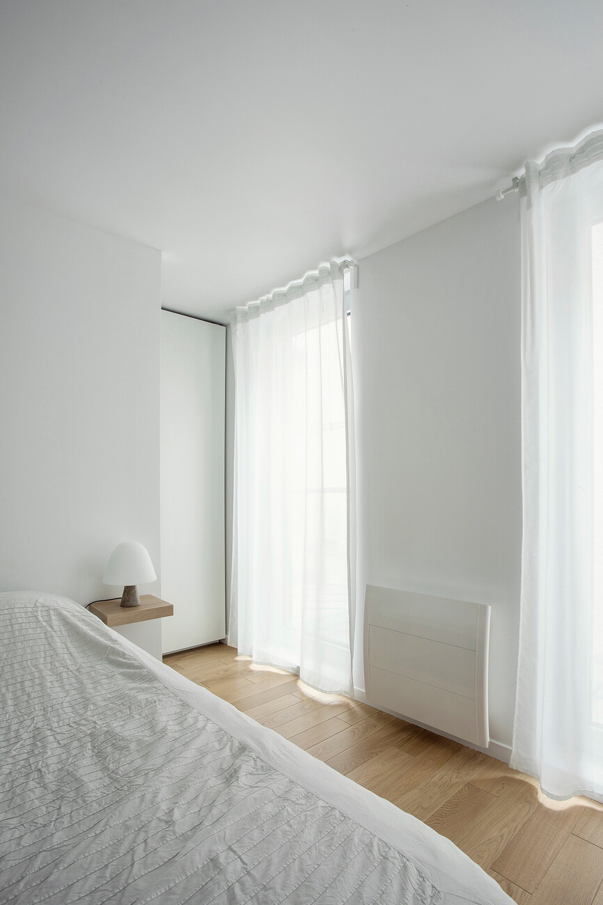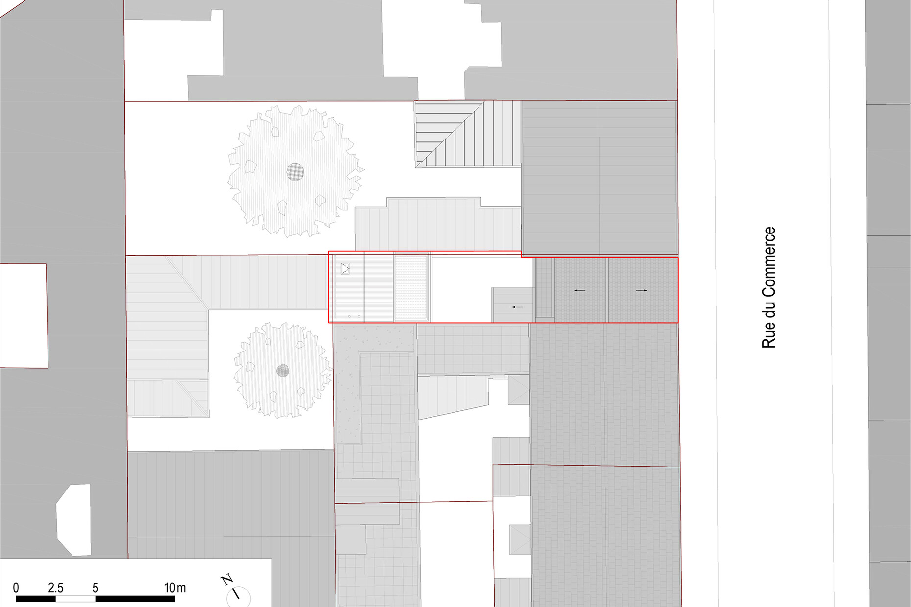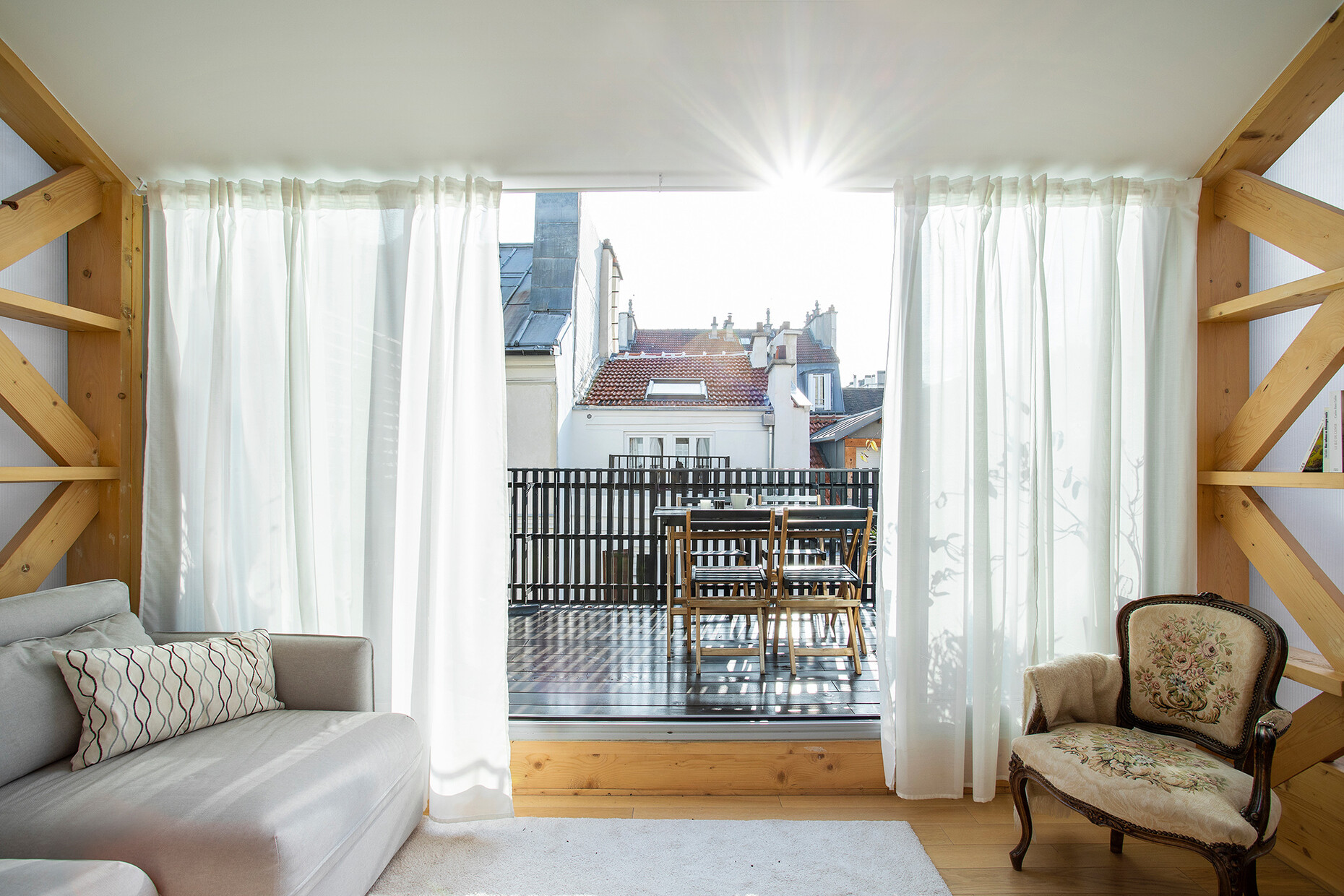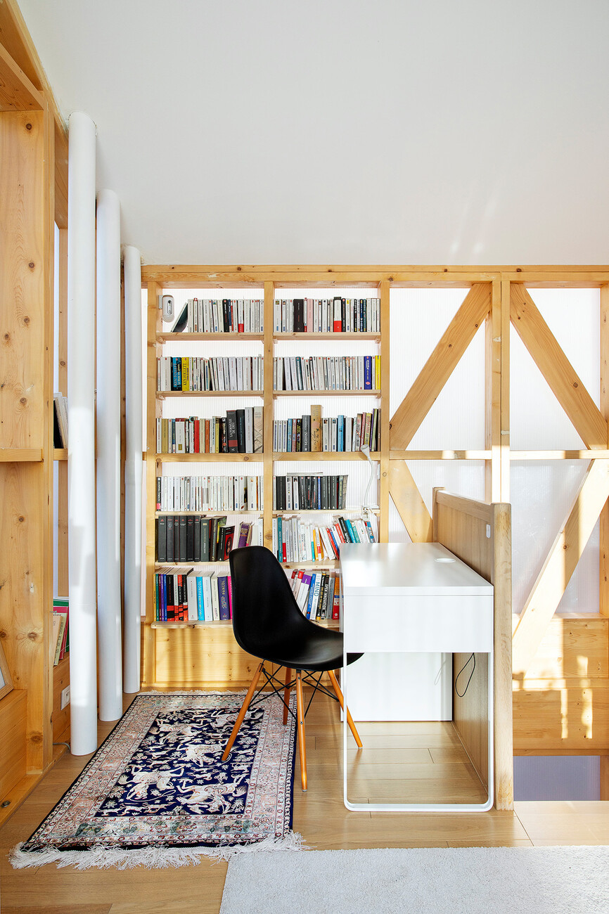 Building a single-family home in the middle of Paris despite a low budget – that sounds richly unrealistic. No wonder Java Architecture describes its clients as completely crazy or ingenious. The latter is probably true, because the wooden micro-residential tower that the Paris-based architecture firm was able to realize for those very clients required some visionary foresight – and luck, since it also required the approval of the neighbors and the planning authorities. That the process was not an easy one is shown by a previous refusal of planning permission, as well as the narrow acceptance of the project, which was achieved by a majority of just one vote. The site, which is a densely built-up backyard in the 15th arrondissement, is correspondingly cramped. There, the clients had bought a dilapidated house in the second row, which was now to be transformed into a single-family home. Surrounded by three neighboring buildings and with a small distance to the front house, the architects decided to go vertical as the only possible extension option and added three floors to the existing building. The result is a six-story tower, including a basement, with a footprint of six by four meters, which now offers 100 square meters of living space.