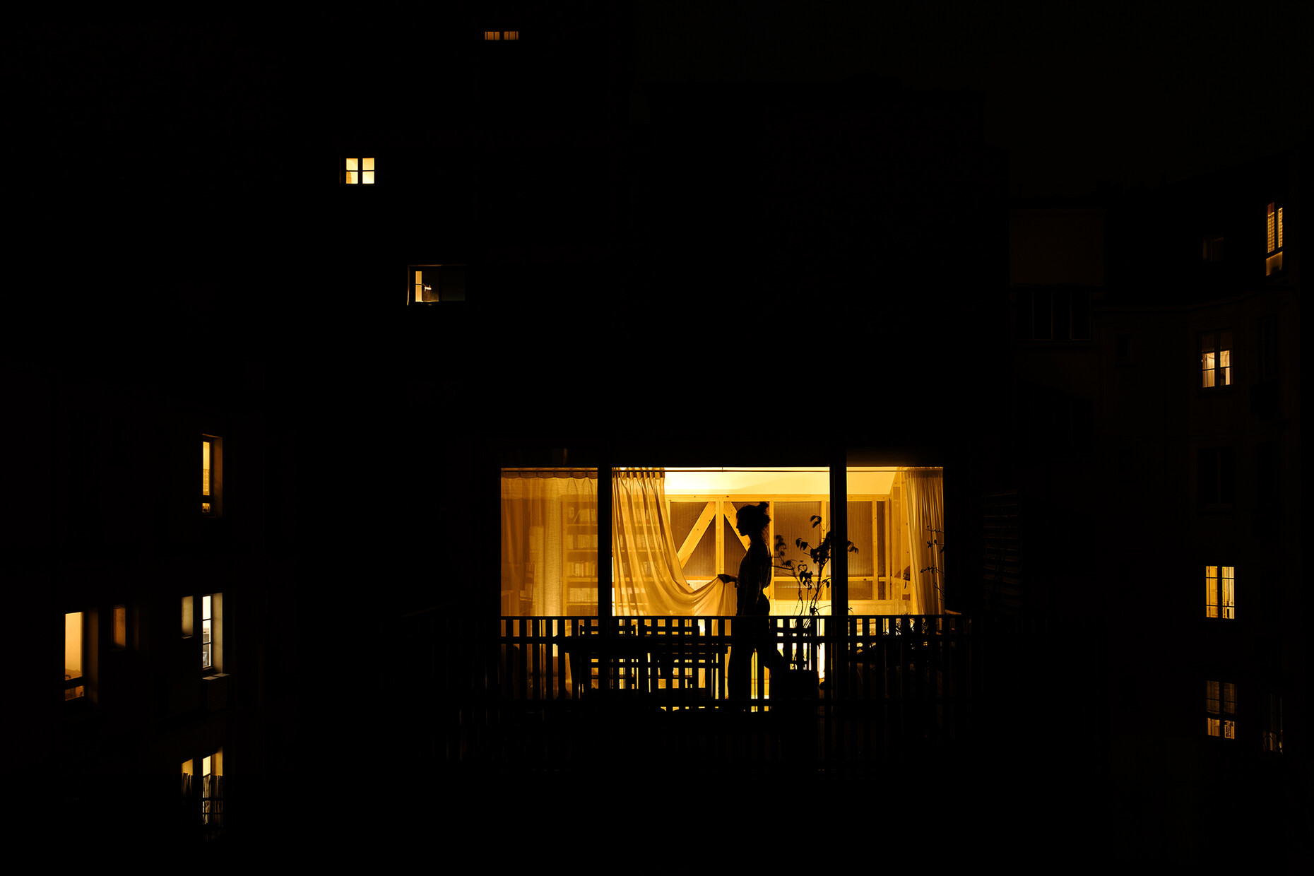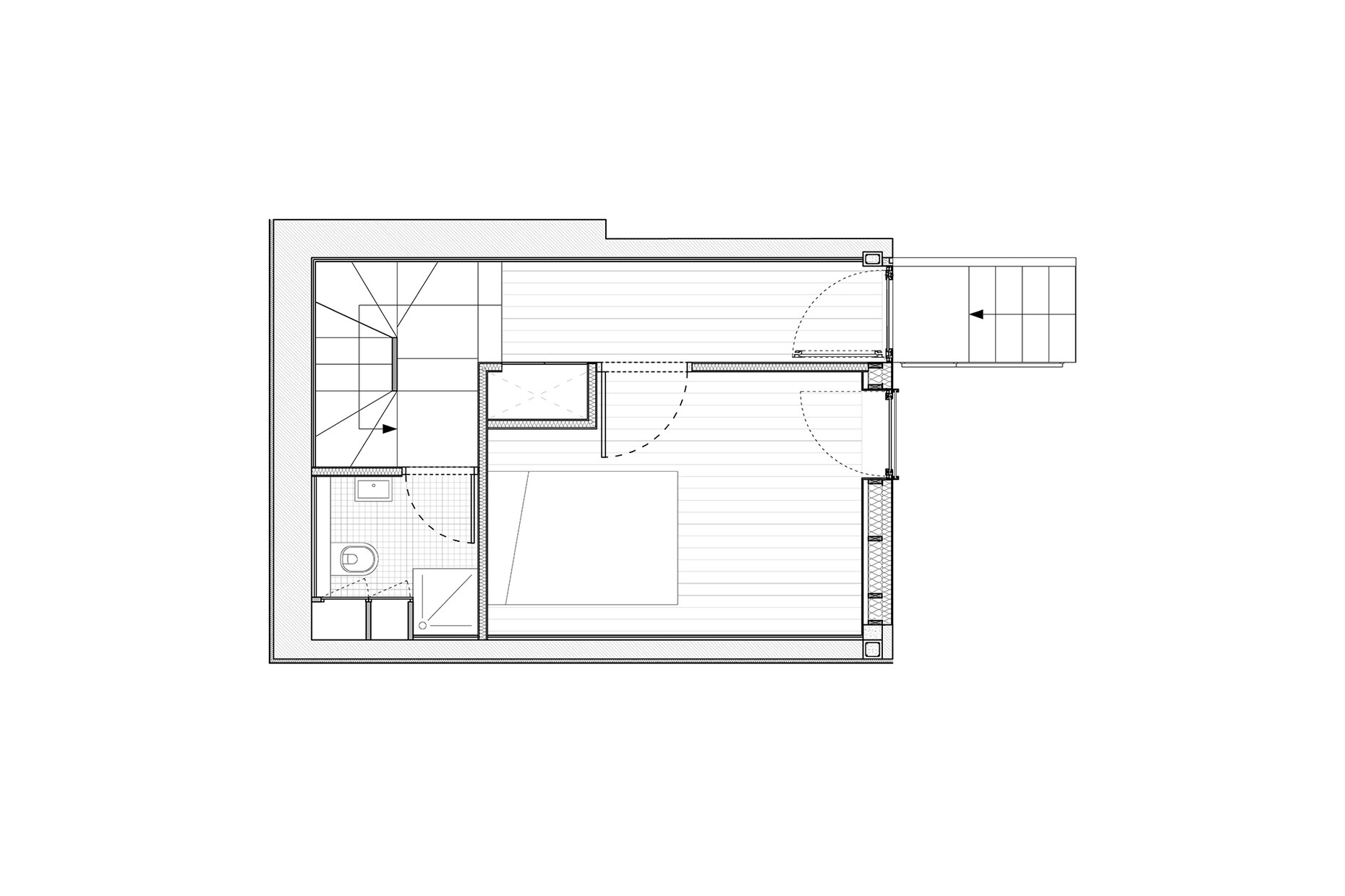 In order to save space and meet the structural requirements, the architects planned a wooden construction that docks onto the existing stone wall as a filigree structure as possible. It serves as a design template and can be read both in the interior spaces and on the facade. At the same time, the building has only one facade with a view, which opens to the east towards the front building and can be completely closed by means of large impact or sliding shutters made of wooden panels and slats. In order to nevertheless bring daylight into the interior from the other sides, the architects planned a translucent polycarbonate façade for the second to fourth floors of the west façade. It envelops the wooden structure and brings soft light into the interior spaces. The fourth floor is set back on the building volume like a greenhouse, creating additional space for a small roof terrace. It is completely clad in polycarbonate panels, creating a link between the west and east facades as it forms a translucent band over the existing walls. At dusk, the small residential building then literally transforms into a lighthouse, creating a poetic mood in the backyard and foreshadowing the life behind it.