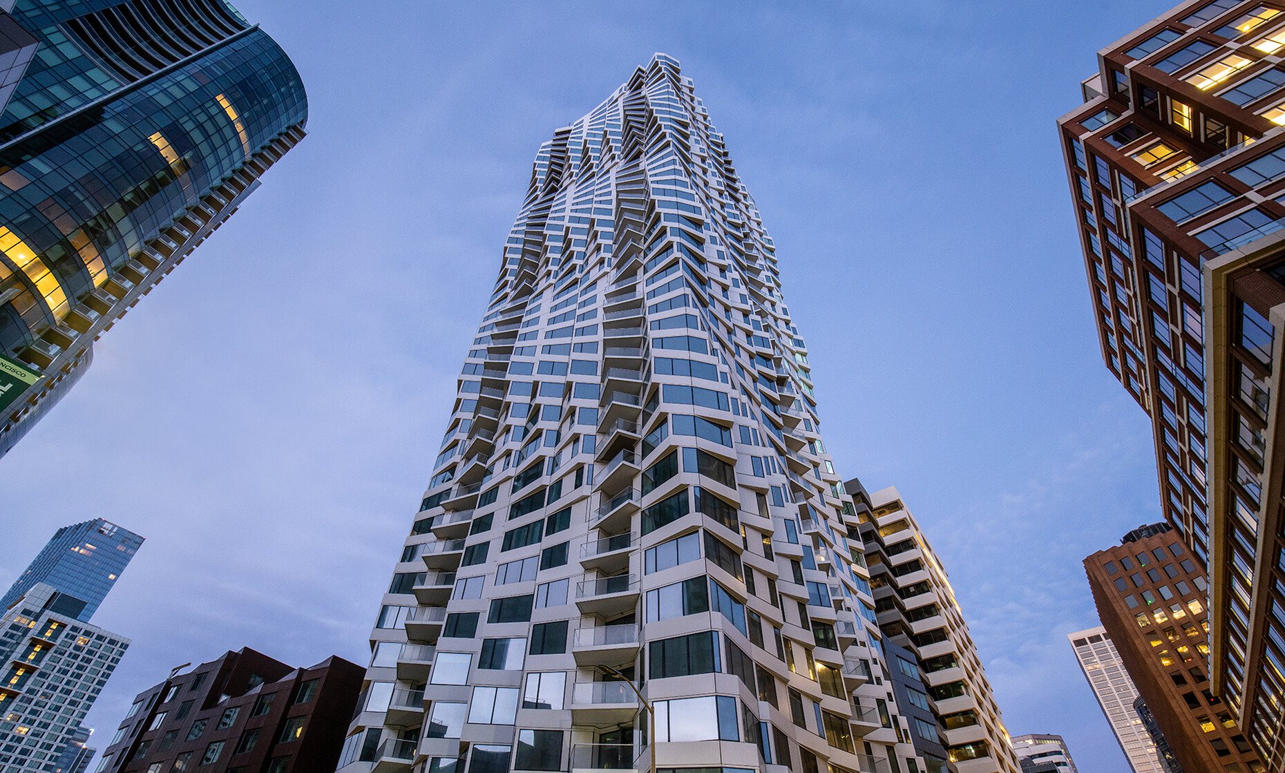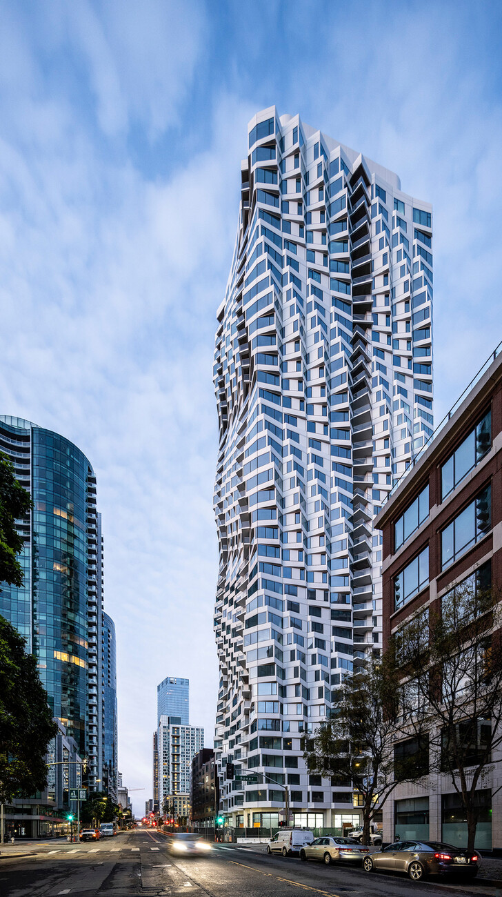 The investor Jim Lowenberg also knows her and invites her to take part in a small competition. He wants to build a skyscraper on a site on Lakeshore East Park that is visible from afar. Gang again has to deal with Mies van der Rohe, whose legendary high-rise apartment blocks on Lakeshore Drive are barely a mile away from the building site. Gang manages to convince the client with her first two sketches, even though she has never built a high-rise before. She and her team designed something that had never been done before: they pulled each floor slab outwards to form a second skin in front of the glass and steel façade, with small balconies and terraces on top. Each concrete slab is given its own gently curved shape. When viewed from below, the soft curves look like a dress or a swirling water surface: the Aqua Tower, the tallest building in the world designed by a woman. Many commentators see it as a lively ballerina, waves on the beach or a cliff face polished smooth by the sea. And almost everyone agrees that this is a very feminine skyscraper.
