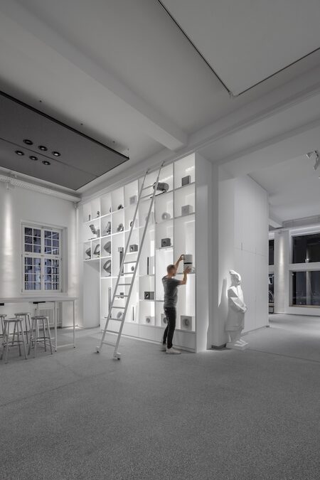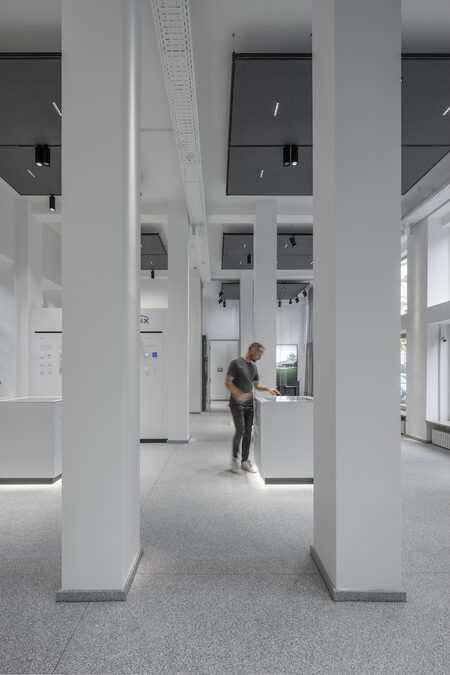 To achieve this, the original room size was restored. White plastered walls, understated fixtures and light grey terrazzo flooring create a subtle backdrop. The total area covers approximately 450 square metres. It is spread over the ground floor and a basement with access to one of the courtyards of the Ledigenheim. The entrance area is located on the ground floor and opens up to the city via large glass surfaces. Here there is a lounge with a café, which serves as a connecting element between the two brand areas. In addition, there are various presentation and meeting areas. In the Erco exhibition area, there is a slightly raised separate area that can be partitioned off with curtains, where the effects of different lighting moods can be tested. It can also be used as a stage for events. Some of the products are displayed here in specially designed shelving units, giving them an almost museum-like appearance. The Jung exhibition area, on the other hand, offers tidy consultation and sampling zones where the switch series and control systems are demonstrated.