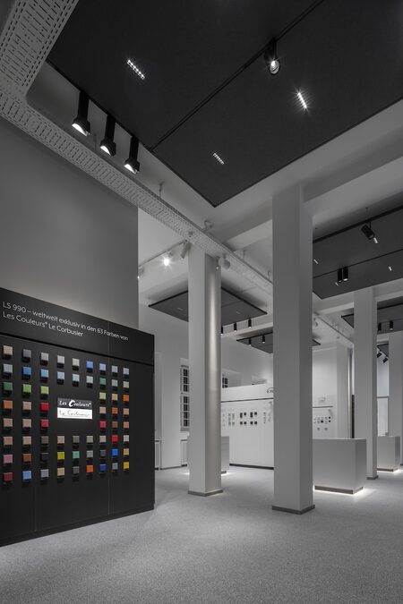 A shared highlight is the basement, where the lockers of the bank branch's former vault have been transformed into display cases. In future, these will house the Jung switches from the ‘Les Couleurs® Le Corbusier®’ series in all 63 colours, illuminated by Erco luminaires. In contrast to the bright ground floor, everything here is kept in dark colours. The only exception are the white pictograms by Otl Aicher, which serve as a guidance system. The legendary graphic designer created the corporate design for the 1972 Olympic Games in Munich and is also responsible for Erco's brand identity.