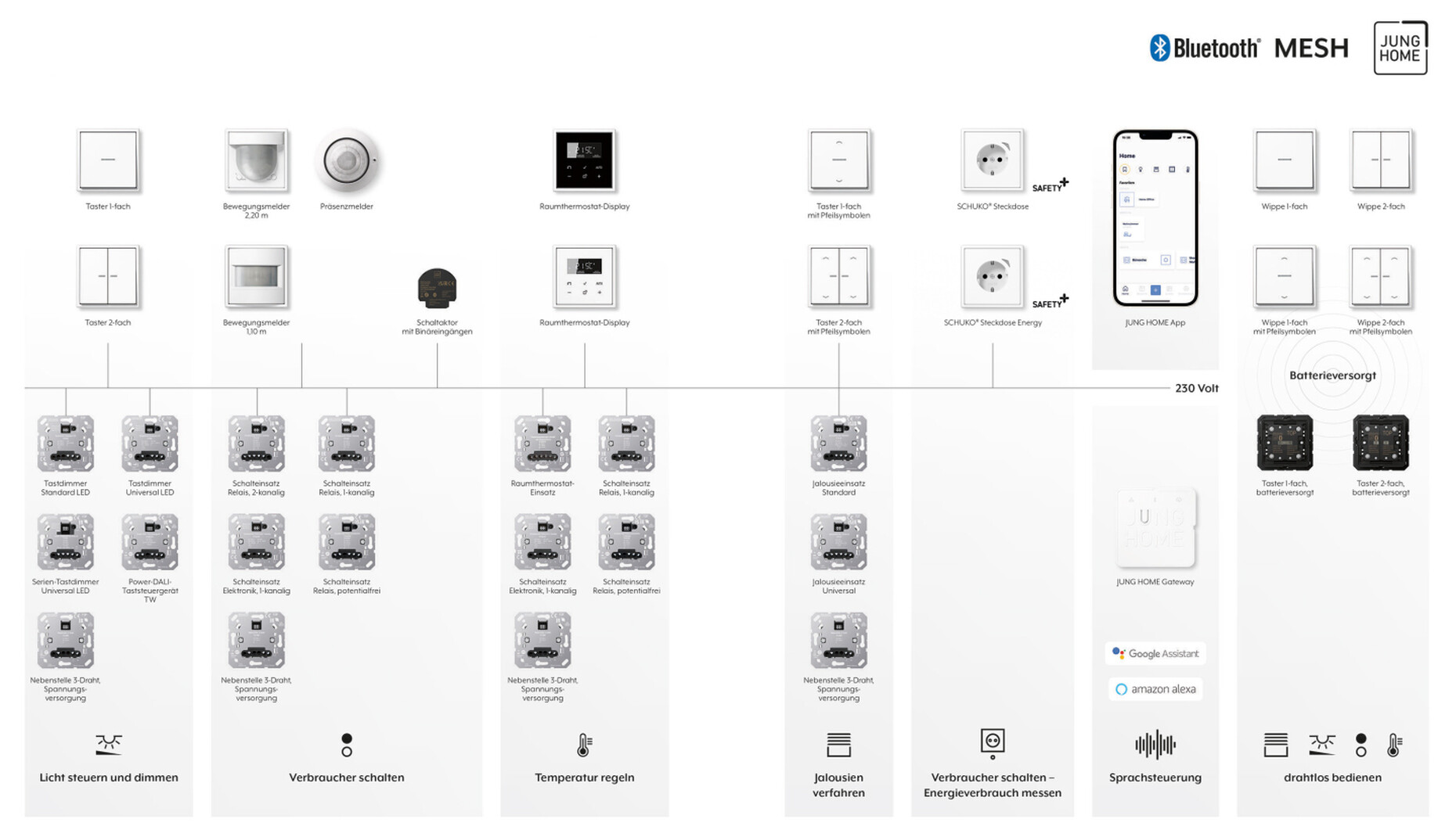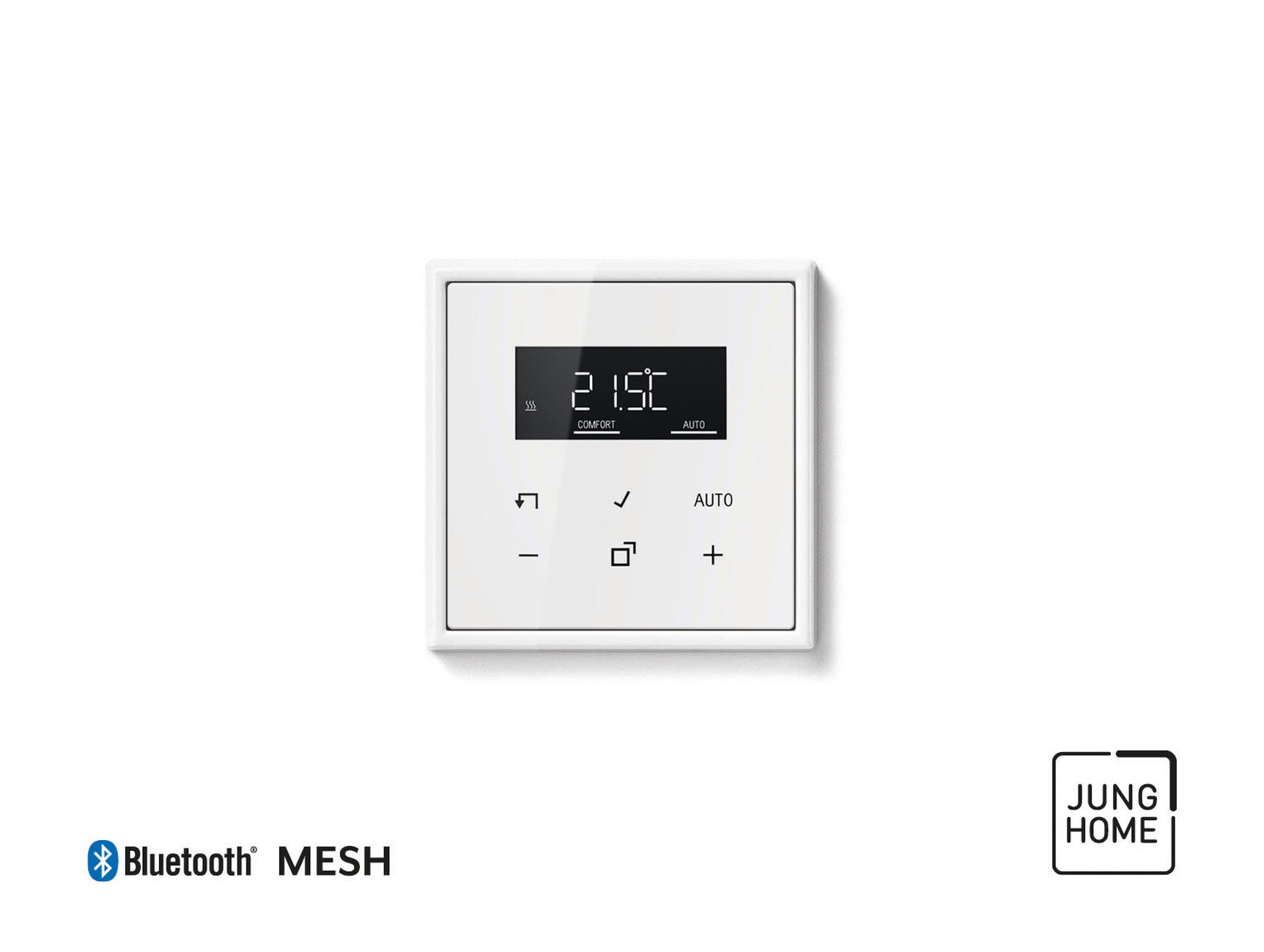 Beyond the manual control and programmed scenarios, Jung Home presence and motion detectors automatically help save electricity and heat: “They only switch on the light or heating when someone is actually in the room,” says Tkacz. Jung Home is even capable of dealing with unforeseen events. If, for example, a window remains open for a longer period of time, the Jung Home room thermostat display recognizes the drop in temperature and sets the heating to frost protection mode. If required, the smart functions can also be controlled remotely: With the help of the Jung Home Gateway (certified by the VDE Testing and Certification Institute), a connection can be established between the Bluetooth Mesh network in the building and the Jung Cloud. This enables communication with cloud-based Internet services such as Google Home or Amazon Alexa. Samsung’s SmartThings will also be available shortly. Moreover, it is possible to link IoT-capable products and control them with Jung Home when the system is integrated into the manufacturer network WORKS WITH mediola®.