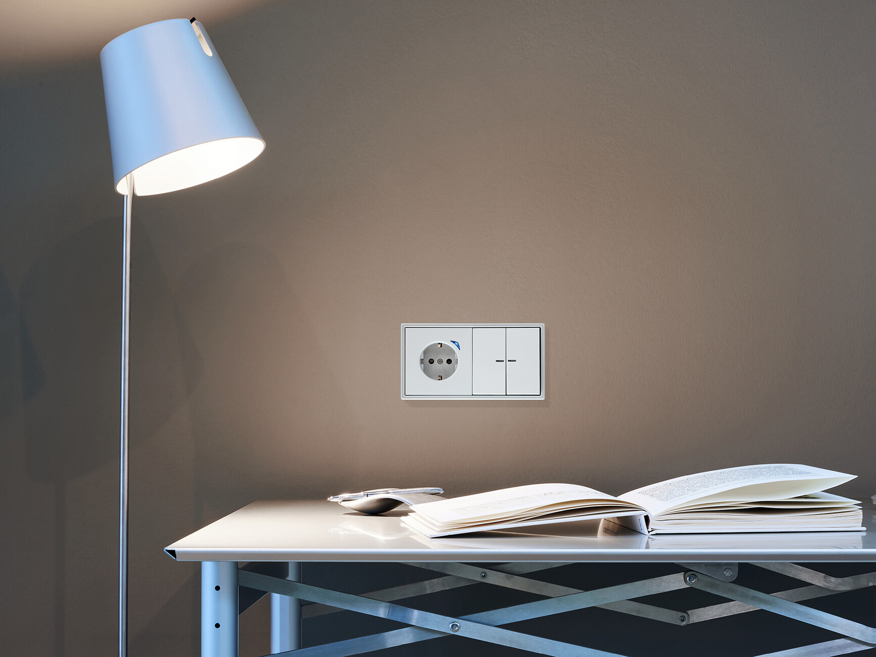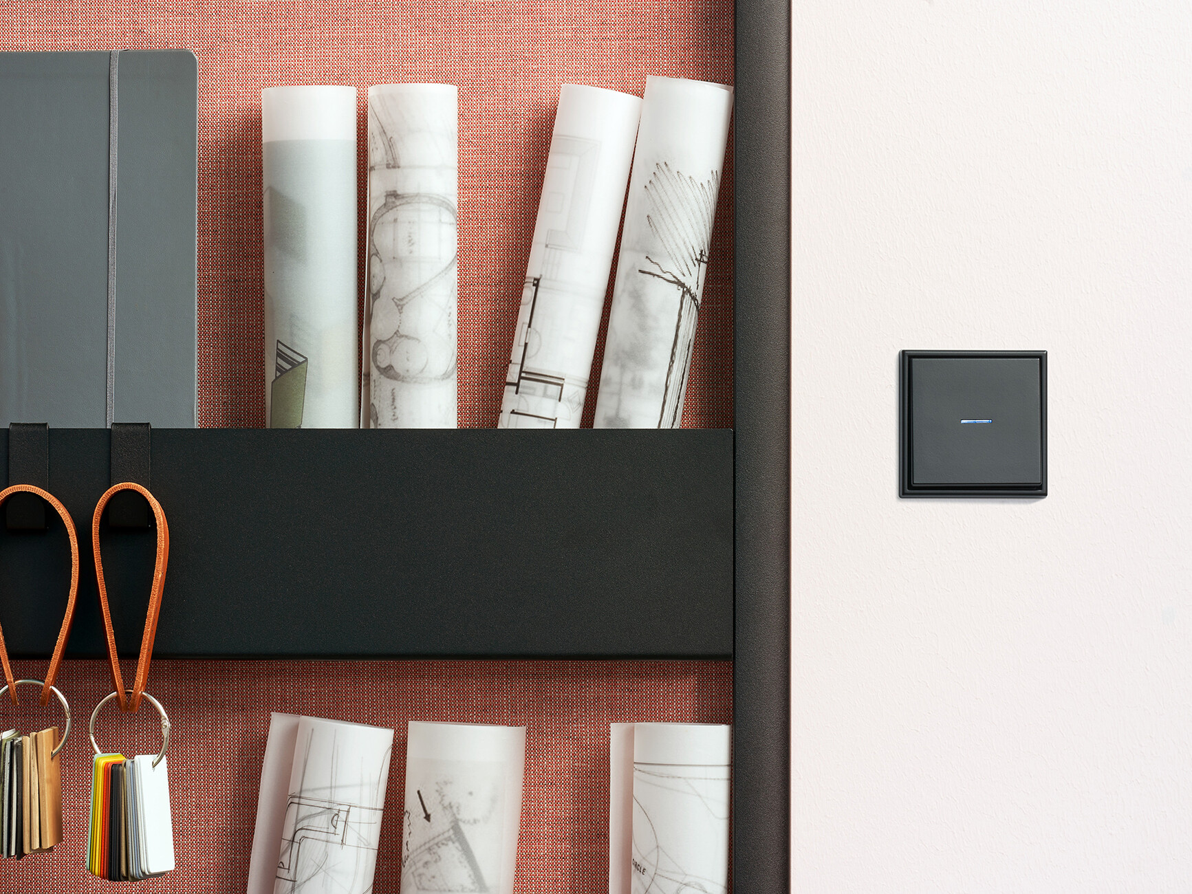 An especially practical aspect is that every device in the Jung Home system transmits and receives data simultaneously. “This not only extends the range with each additionally networked device, but also creates a stable network. Should a device be removed or even fail, the remaining networked appliances within the home system step in and forward the information instead,” explains Raphael Tkacz. There are no restrictions on how many elements can be included in the network: “In principle, several thousand devices can be linked in one network using Bluetooth Mesh.” The Jung Home app groups appliances according to room or application, meaning they can be simply selected and controlled. “One click is enough to simultaneously switch off all the power sockets in an entire home system,” says Tkacz. With scenarios such as “Leave home,” it is possible to ensure that none of the technical installations use electricity unnecessarily when the rooms are not occupied. Moreover, the app can be used to set up programs instructing individual devices to, say, dim the light at certain times. Equally, temperature and shading can be regulated depending on how the rooms are being used. The smart push-buttons are available in many different designs, and as such they suit every setting.