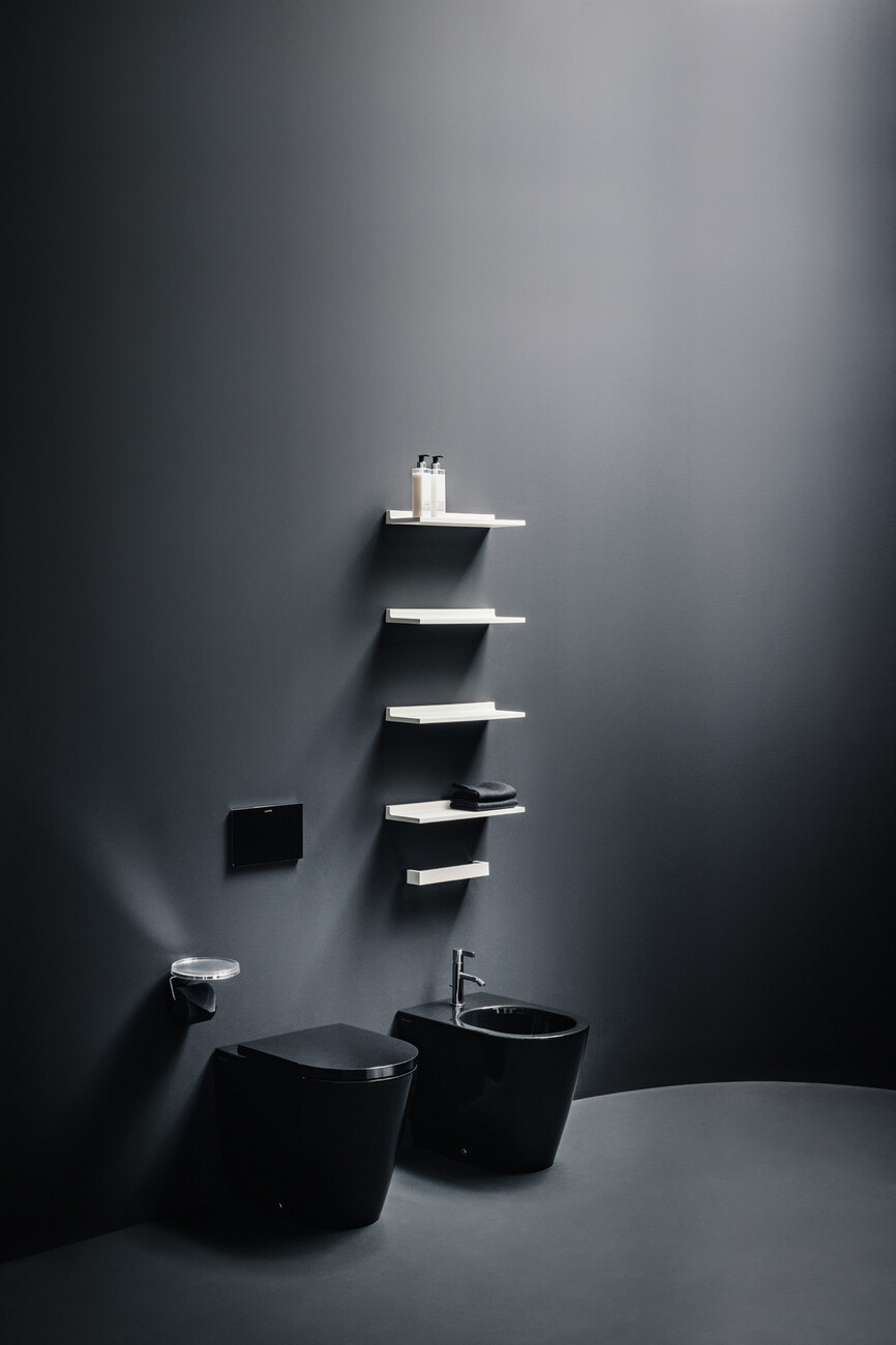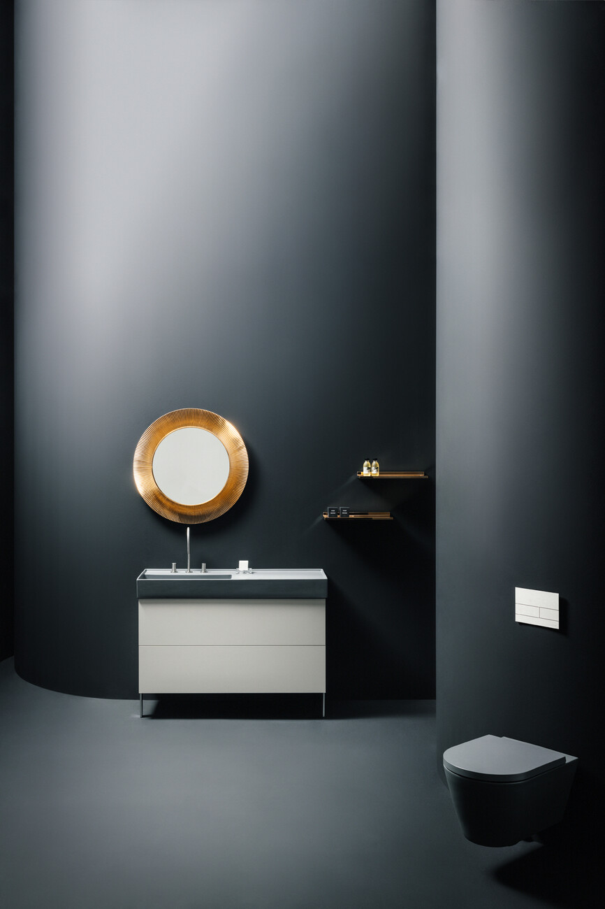 Both these stories make it clear just how much freedom “Kartell by Laufen” gives you, by presenting two different scenarios featuring the line. To make even more of the flexibility associated with the products, Laufen and Kartell have added new colors, surfaces and furniture to the collection – and these are reflected in the photographers’ narratives. Accordingly, black and slate gray now complement the existing white and pebble gray. For the cabinets, the new colors are: mustard yellow, gray blue and ocher brown. What’s more, with their minimalist stylistic vocabulary, the faucets allow for many different combinations with the bathroom ceramics. With the line’s eclectic play of colors and the way it represents a mixture of furniture typically associated with both bathrooms and living rooms, it opens up completely new possibilities for designers. The shelves, stools, mirrors and accessories are an invitation to rethink the bathroom, to transform it into a sensual place. With this in mind, “Kartell by Laufen” once again proves itself to be one of those collections with an intrinsic sense of freedom which demonstrates just how multilayered bathroom worlds can be today.