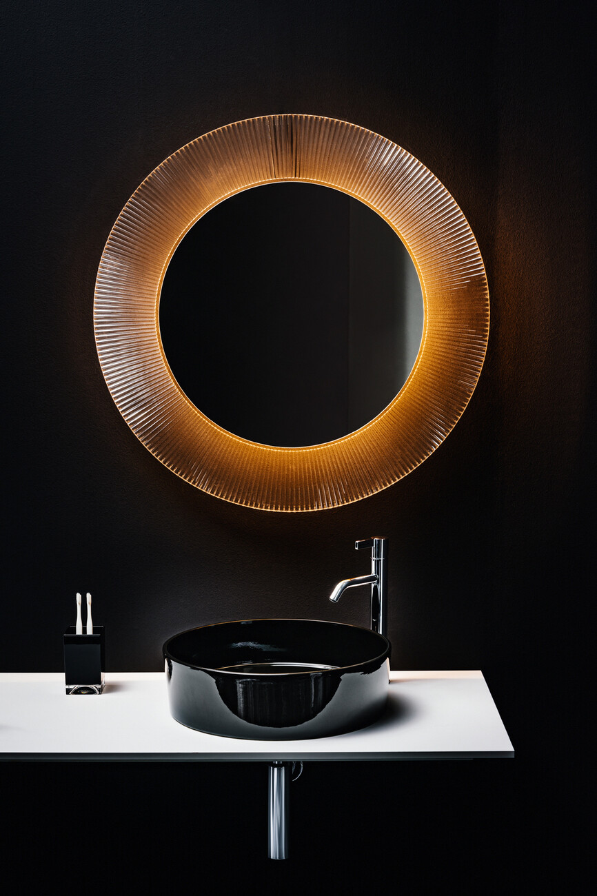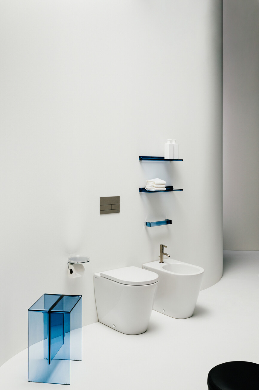 With this in mind, “Kartell by Laufen” plays with the kind of contrasts that, taken together, complement each other. While both the bathroom ceramics, consisting of washstands, bathtubs, bidets and toilets, and the cabinets have a vivid presence, the transparent shelves, stools, trays, luminaires and mirrors come together to form light, flexible units which really add something to a room. The design of the two different types is linked by their clear lines, a result of their refined appearance and their delicate edges. The material at the heart of all this is a ceramic which not only allows for slender radii but is also sparing with materials, thus making a contribution to the sustainability of the production process. Moreover, a precisely-coordinated color scheme means that the bathroom ceramics form a background, allowing the other furniture to fill the room with splotches of transparently radiant hues.