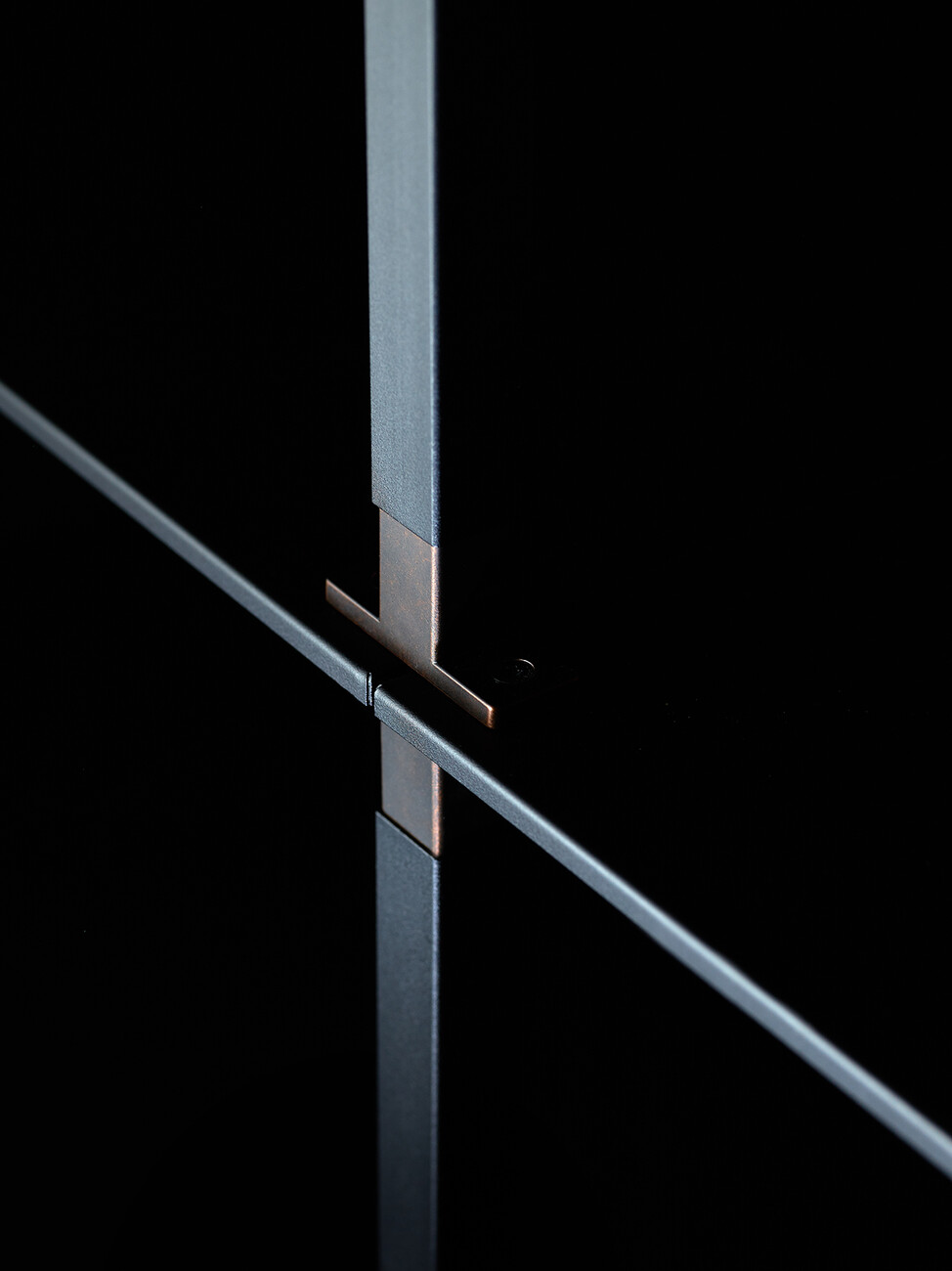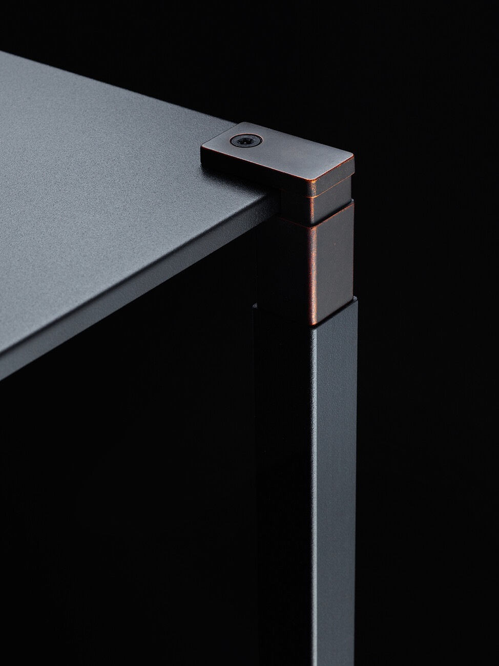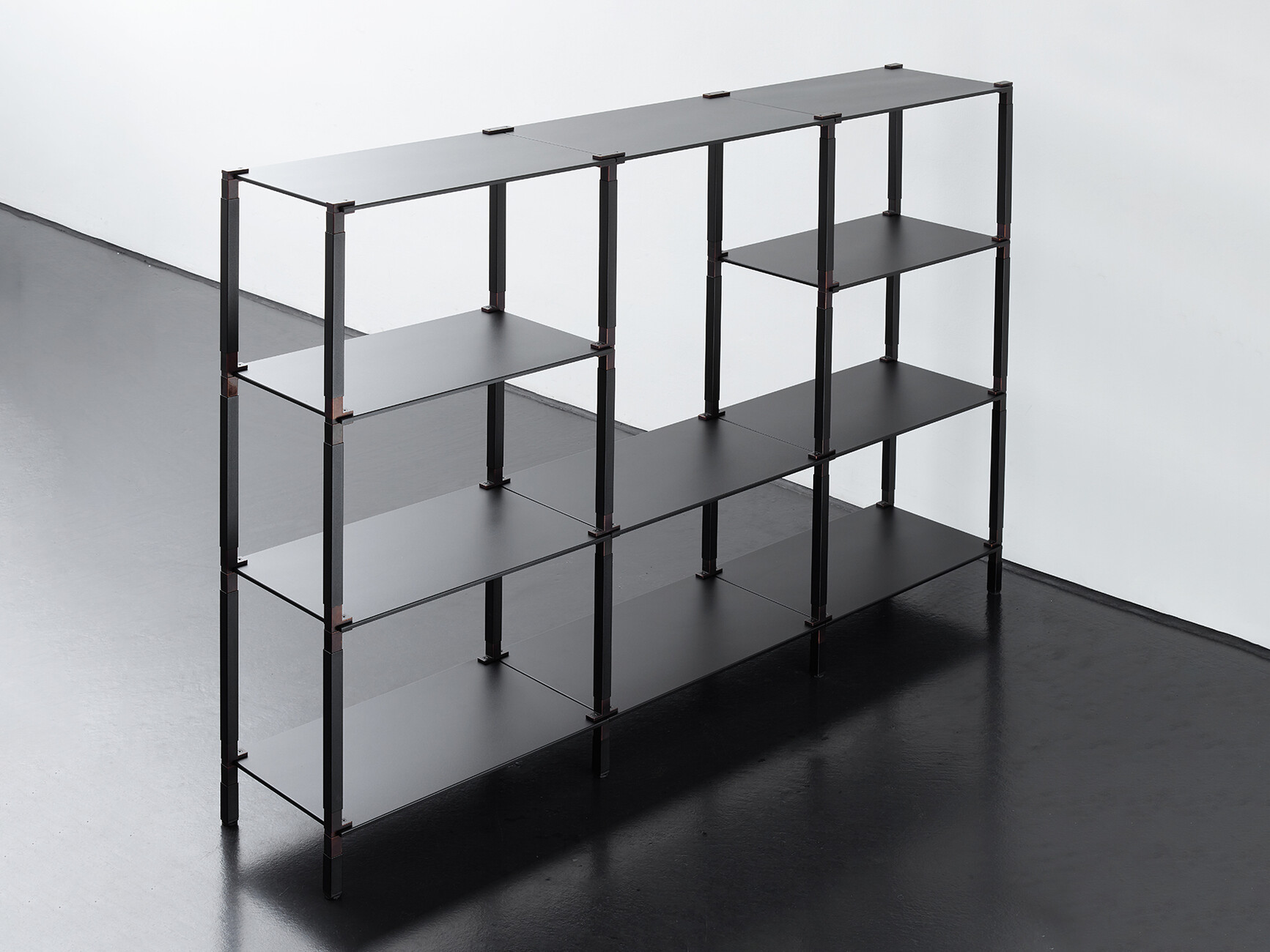 An open shelf that is modular in character and has clear highlights: At the beginning of the year “tRACK” by Volume K by Kesseböhmer publicly premiered at imm cologne. Featuring an adjustable grid layout and different surface finishes, the system offers numerous possibilities for individualization: The finishes of the frame, the T-shapes connectors, and the steel shelves can be selected individually and combined. The color spectrum ranges from brilliant chrome luster to the warm copper hue “Sunset”. The metal elements are treated and processed in Kesseböhmer’s in-house electroplating and powder-coating facility. This is a luxury that ensures quality, as every step in the production can thus be precisely implemented and monitored.