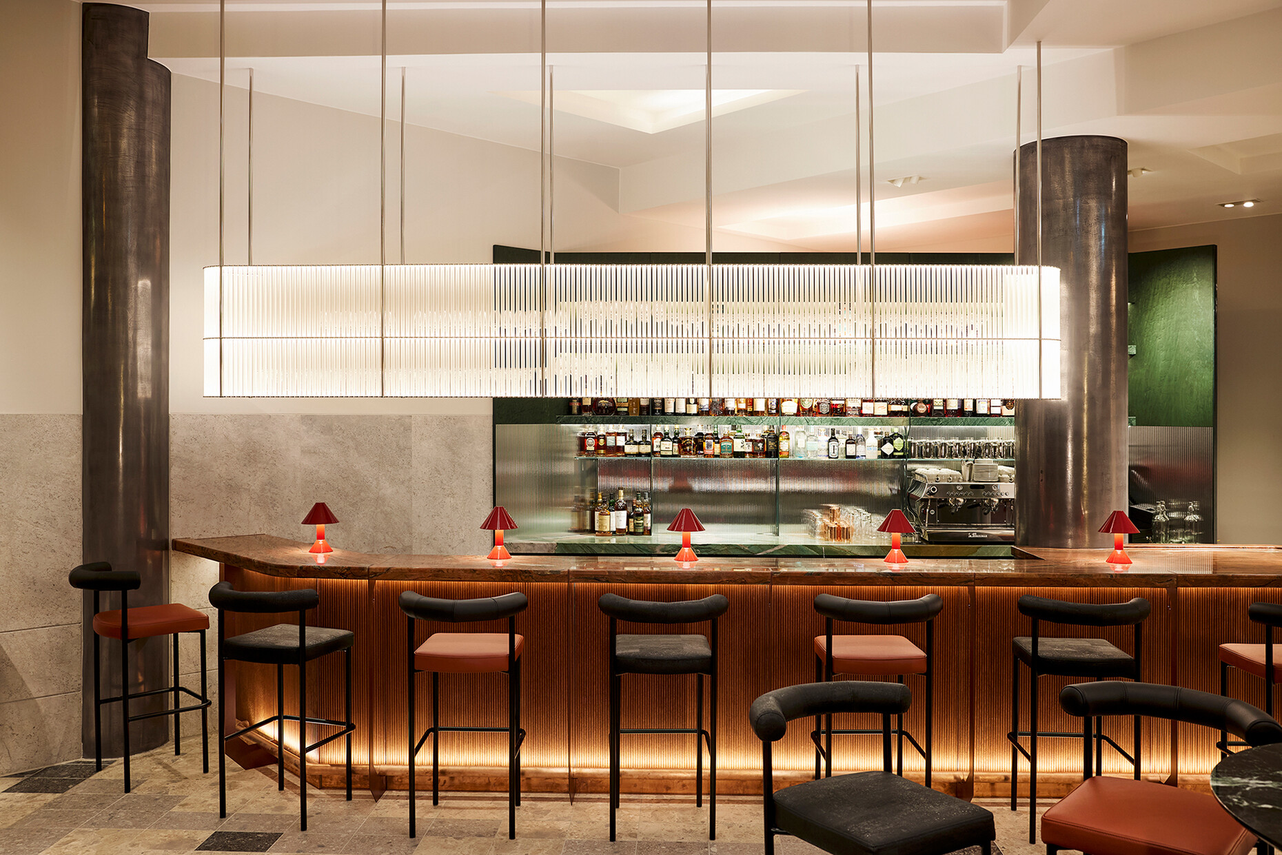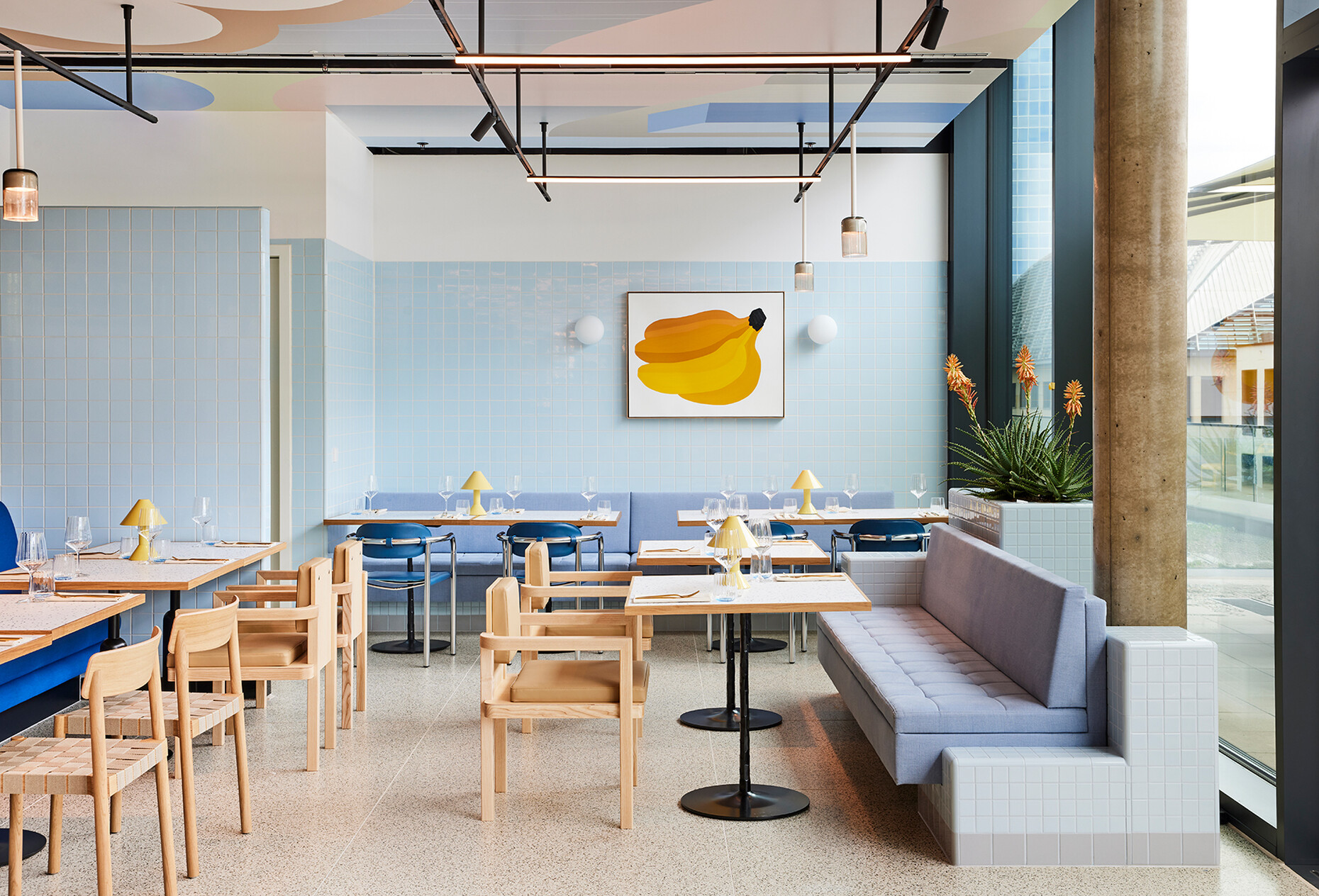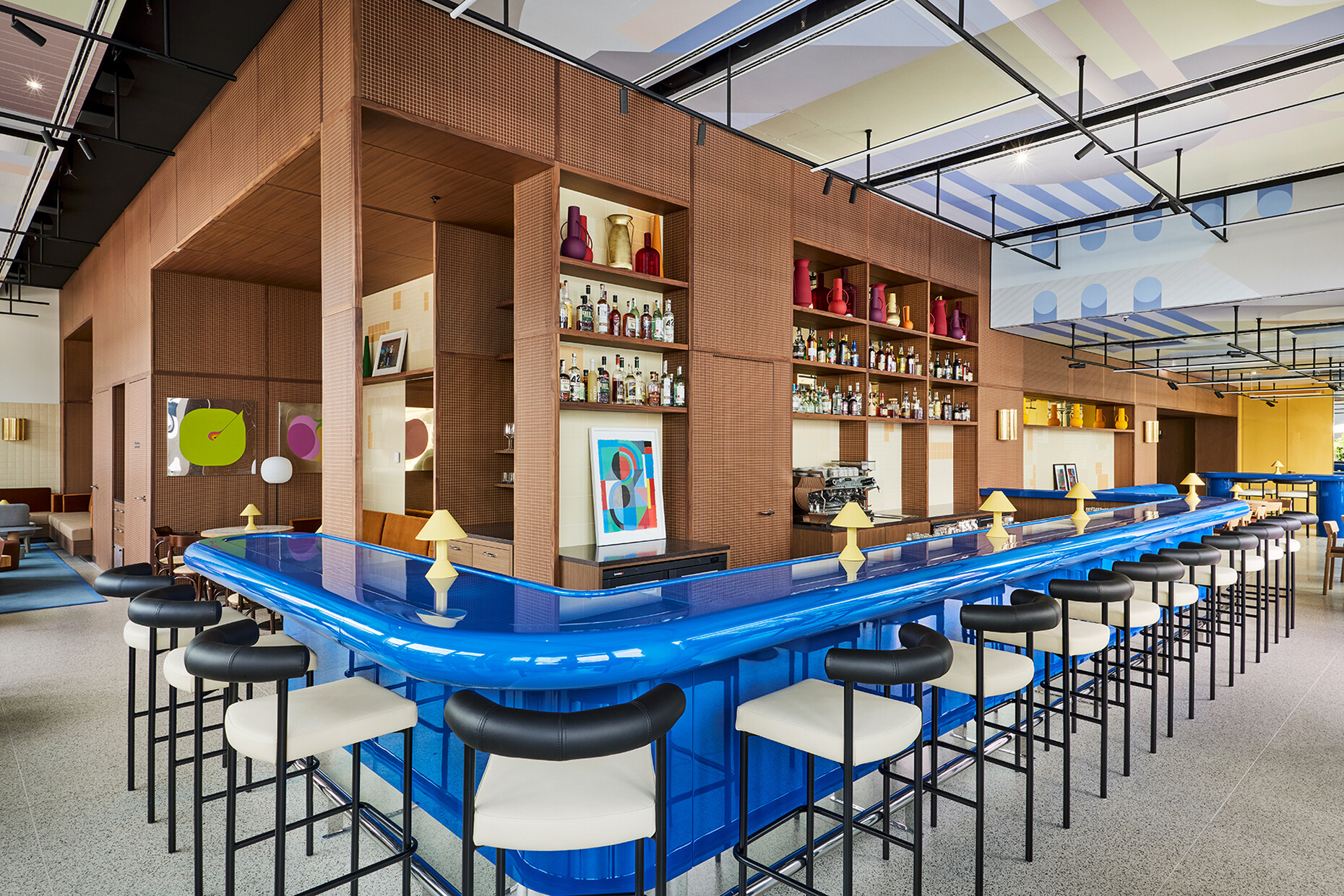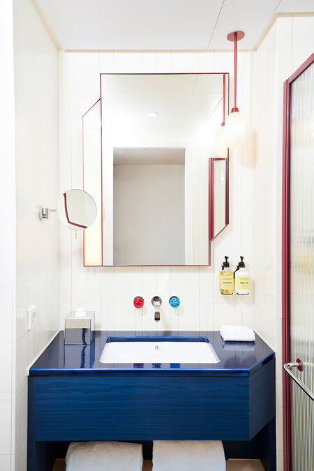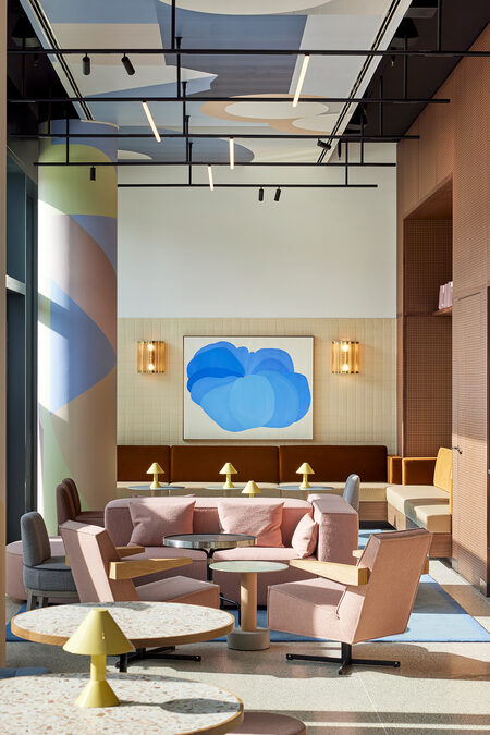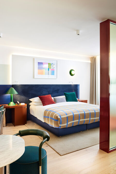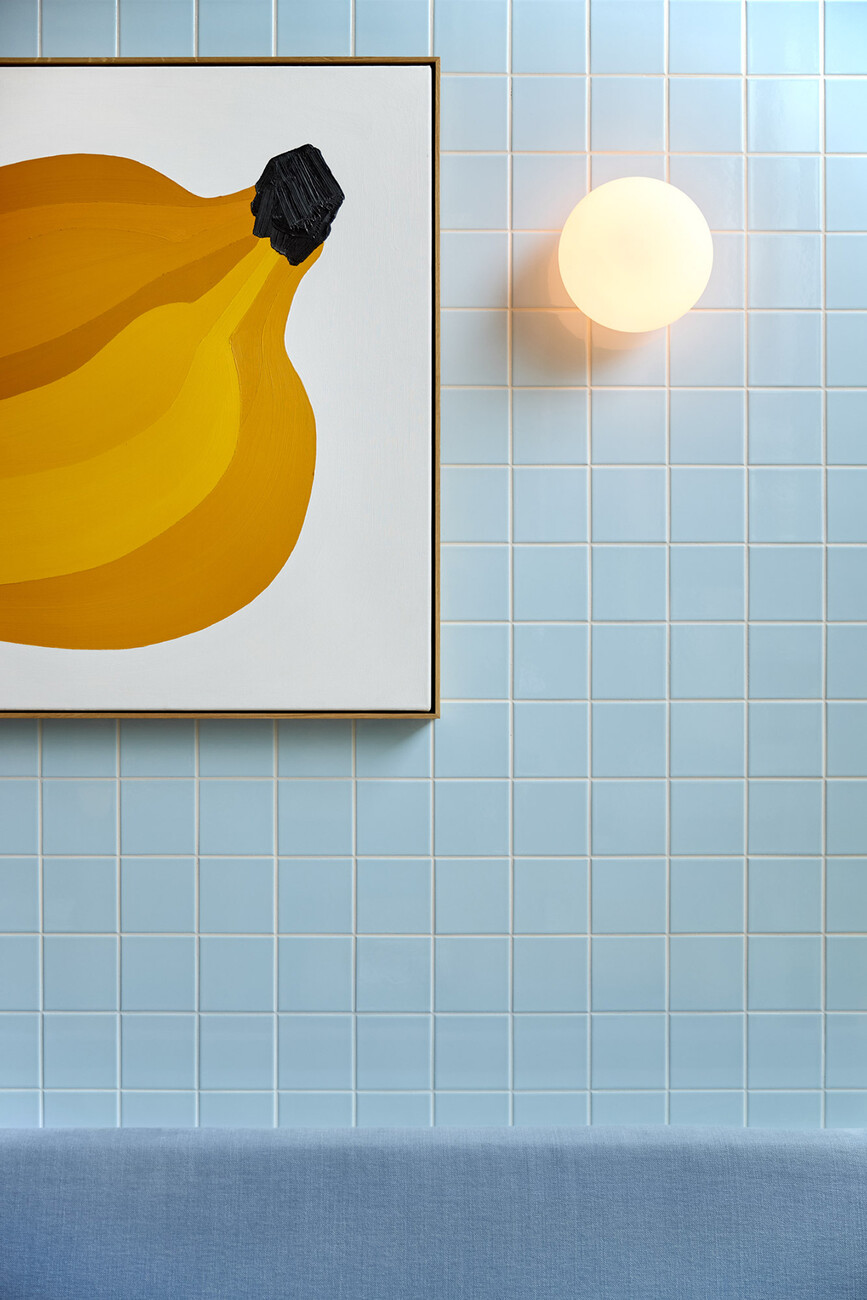 Tom Bartlett: The context led us to look at post-World War II modernism for the Kimpton Hotel in Frankfurt am Main – how Germany looked back at the glory days of the inter war Bauhaus in the 1950s and 1960s. Another inspiration was the United Nations building in New York City with its generous expanses of green marble, as it was once built for a world order that felt better and more future-oriented. We did a lot of research and also looked at the interiors of banks in the 1950s and 1960s, which were quite glamorous institutions at the time. The Brasserie "Anni" in the Kimpton Hotel is named after textile designer Annie Albers and is also a kind of homage to the Central European cafés, whose concept I love. The colour palette and forms of post-war artists such as Dan Flavin and Donald Judd were also an inspiration. For the design of the guest rooms, we generally took our cue from the Bauhaus and mixed in the rebellious elements of the Memphis Group to keep things from getting too cold. For the "Lazuli" bar, which hovers over Frankfurt like a cruise ship, we thought of a kind of Mediterranean Bauhaus, a modernism in pastel tones bordering on Art Deco. The bar runs through the middle of the room like a blue Cadillac, and the atmosphere of Lazuli is based on influences from Miami Beach to Tel Aviv. We wanted the interior design of the Kimpton Hotel to clearly distinguish it from other guesthouses in the city, a lot of which I have stayed in over the time of this project..