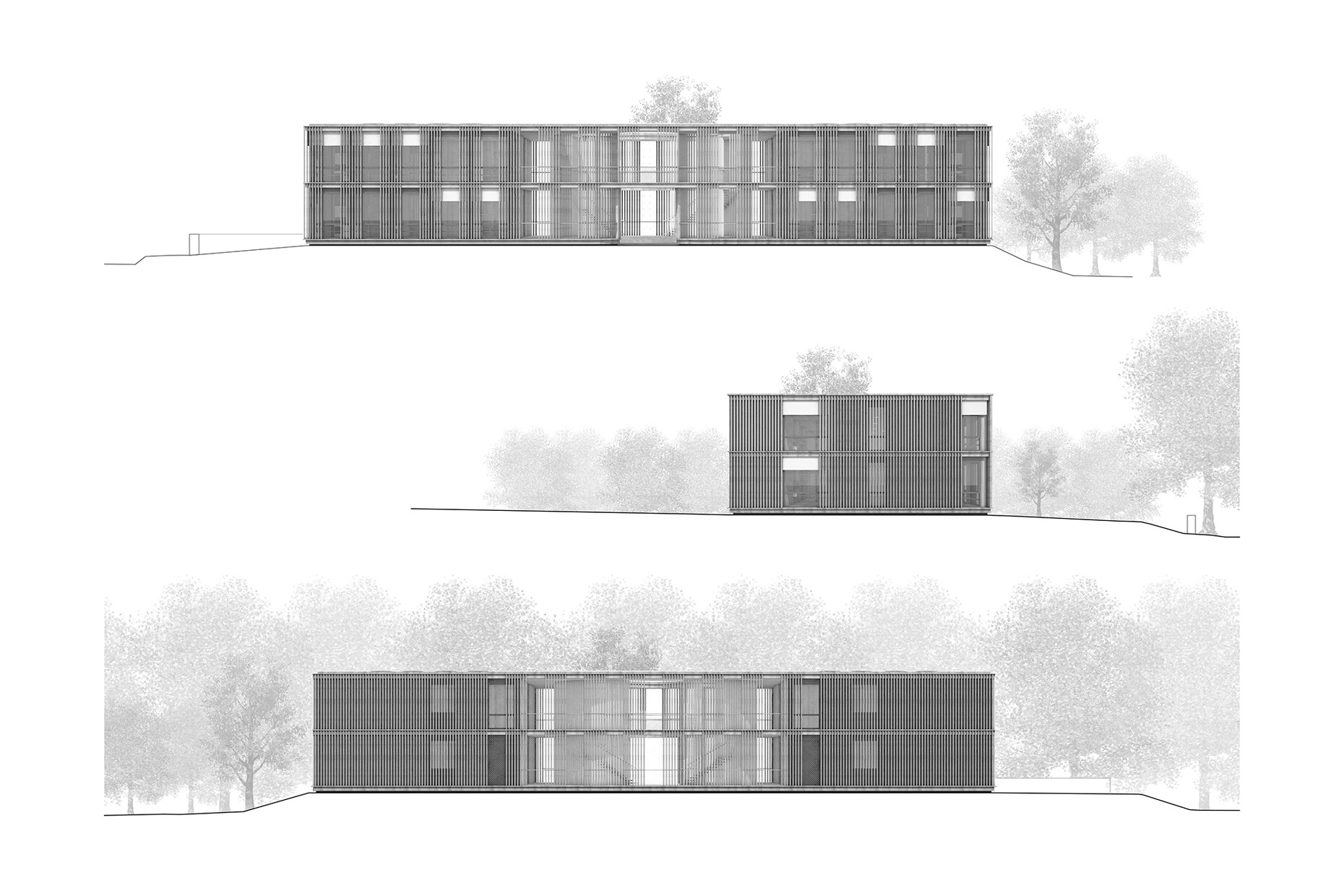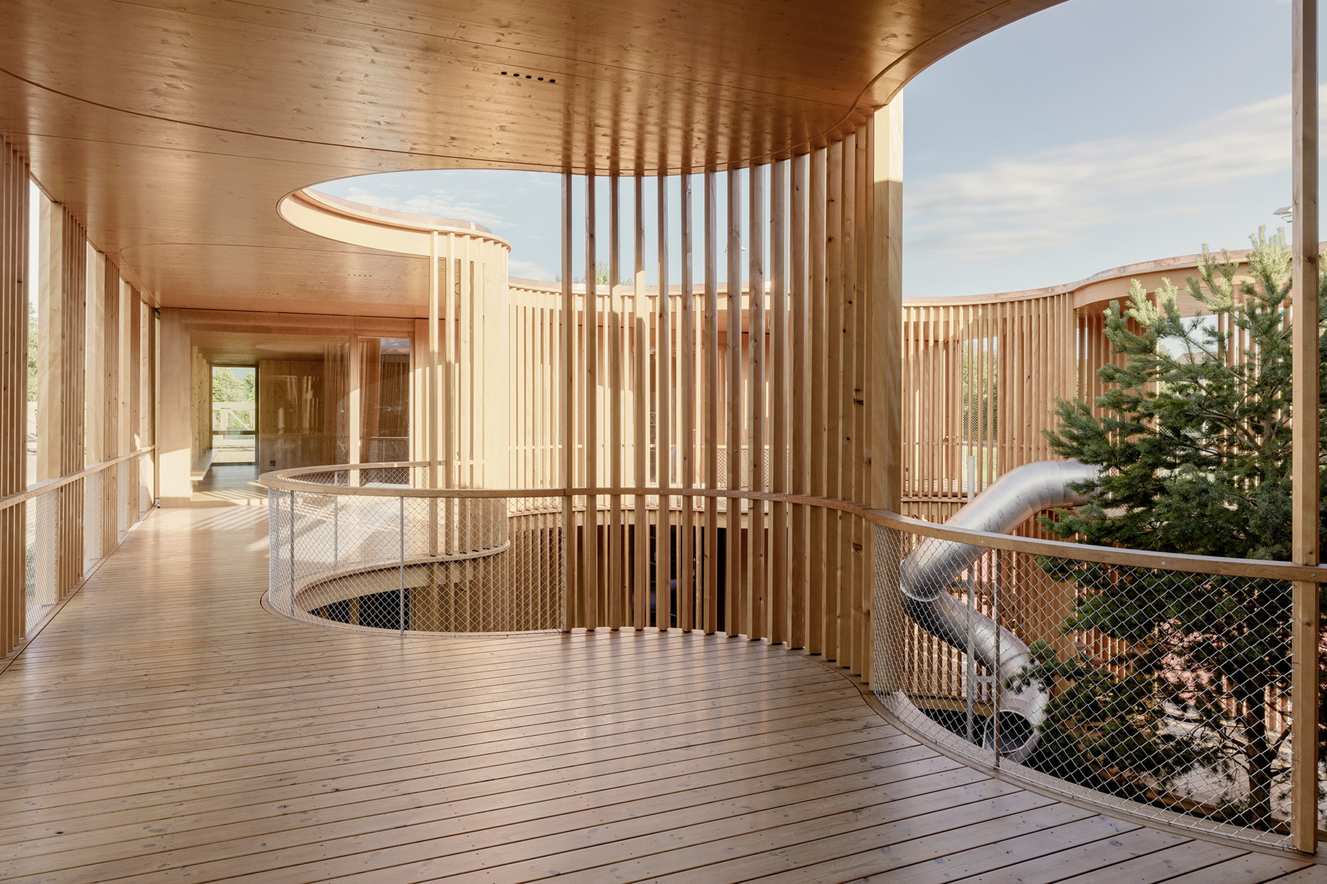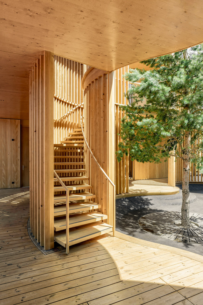 Spatially, the kindergarten consists of two two-story pavilions. They house one group unit per floor, which is accessed from the inner courtyard. Circumferential terraces mediate between indoors and outdoors and continue the play of spatial layers. In addition, two spiral staircases and a slide pick up on the organic flow of movement and create diverse play zones by connecting the individual terraces. Inside, the main room of each group is oriented to the south, while the serving areas such as WCs and technical rooms are located to the north. The architects' goal was to design flexible floor plans that allow different uses for the kindergarten, but also for school classes, basic grades or day schools. To this end, the building opens up on all sides to the surrounding landscape, which thanks to the hilly topography seems to flow into the interior and exterior spaces. In addition, there is an adjacent avenue of trees that makes the kindergarten on the upper floor look like a tree house, depending on the view. The wooden slats of the façade act as a filter that, despite the generous glazing, provides privacy while simultaneously offering a view to the outside. In addition, the wooden slats connect the individual parts of the building with each other and trace the organic shape of the inner courtyard as a spatial boundary on the terraces.