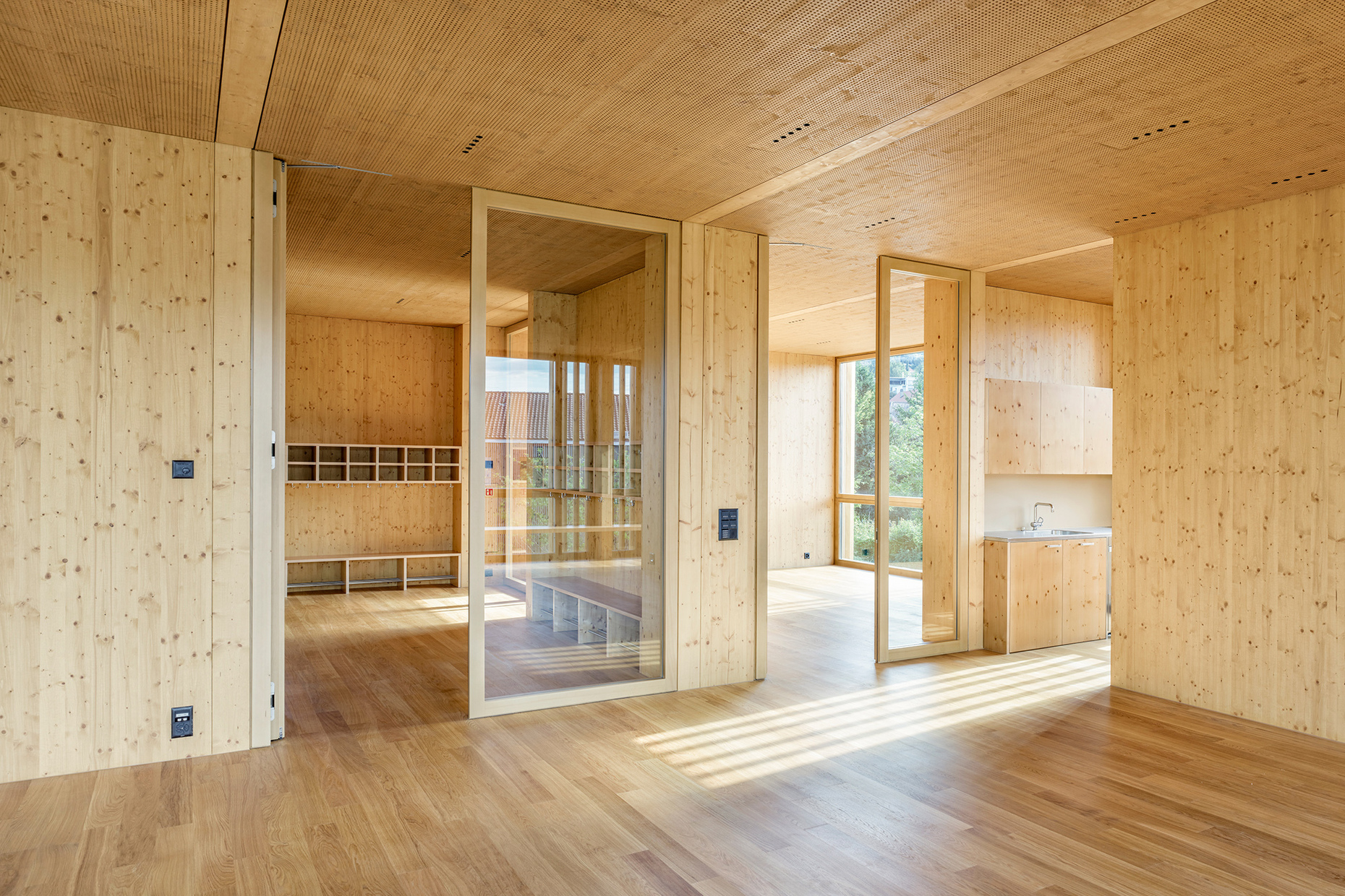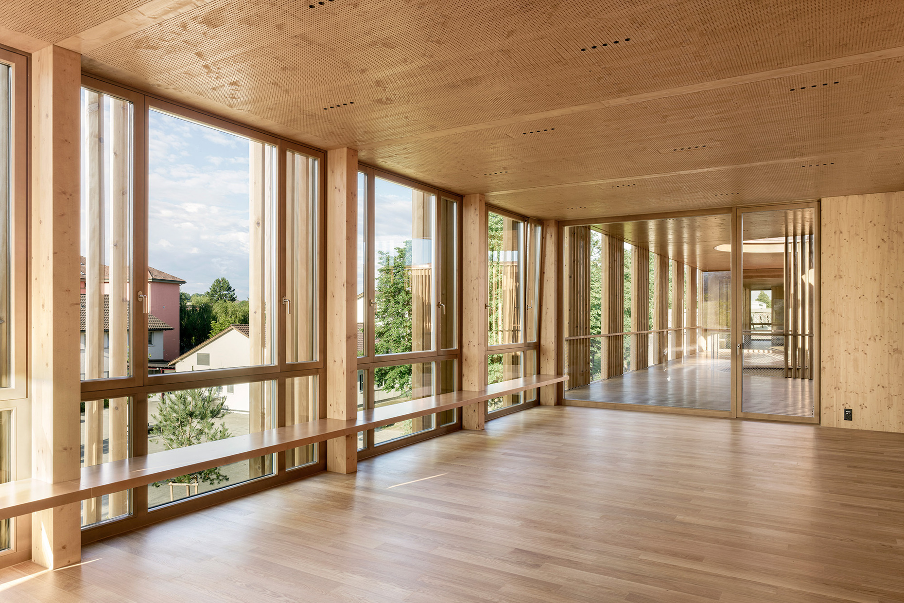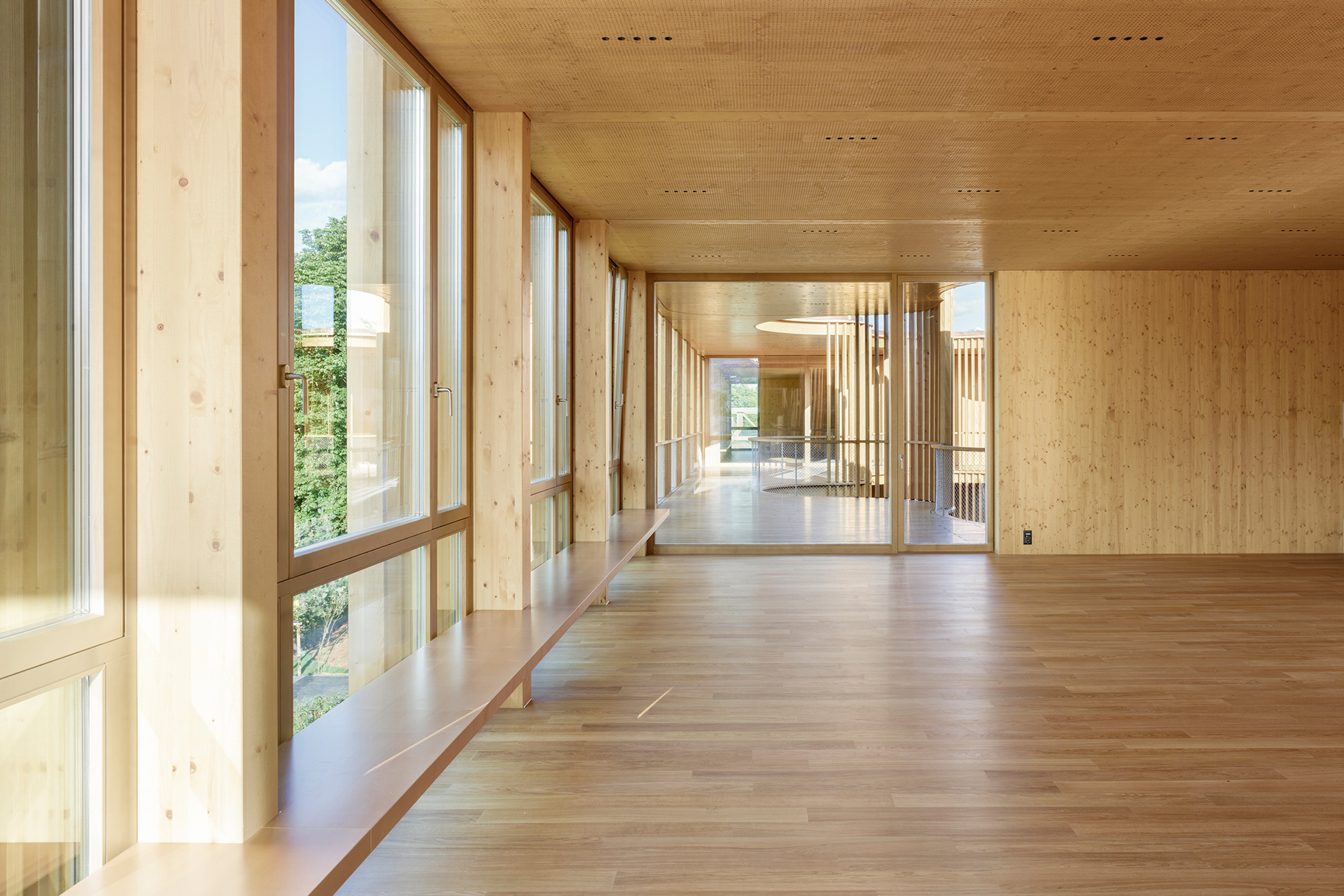 The pure wood construction of the building is also reflected in its surfaces: Windows, facade elements as well as the floors, walls, doors, ceilings and even the surrounding railings of the terraces are made of wood. The color scheme was matched using pressure-impregnated and lightly oiled wood in the exterior and a correspondingly pigmented oil in the interior to create flowing transitions. Strips of dot-shaped LED lights are embedded in the ceilings, which, together with the acoustic panels inside, provide finely tuned details. This is complemented by restrained built-in furniture on a scale suitable for children, such as storage spaces, shelves or various benches, some of which are arranged directly on the glass façade and thus become part of the architecture. The all-round glazing and the reduced formal language of the façade and interior counteract the overly rustic wooden character of the kindergarten. Instead, the architects staged it as a light-flooded wooden box that looks like a miniature version of the "Green Belt", where different layers of space meet and diverse play landscapes are created.
