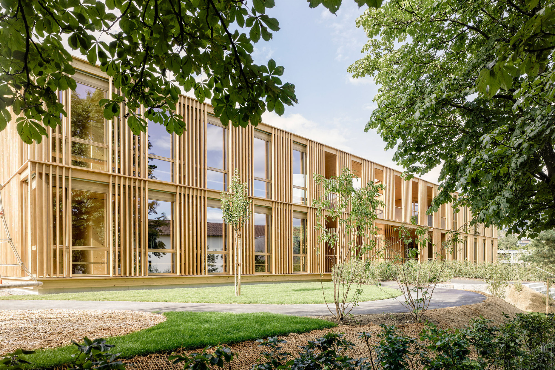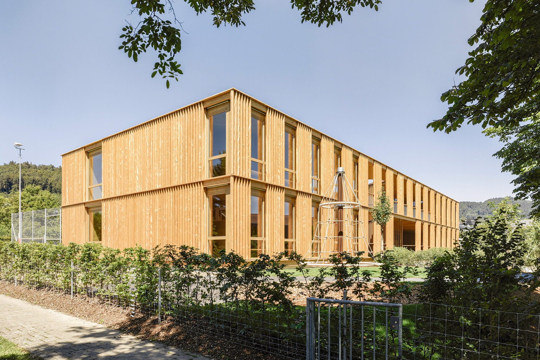 "Urban sprawl" is one of the first words that come to mind about the Swiss landscape. The agglomeration area around Bern therefore follows the idea of sustainable spatial development, which should moderate the transition between urban and natural space. One example is the project "Grünes Band" (Green Belt), which aims to harmoniously combine natural, cultural and settlement landscapes. The municipality of Ittigen, located northeast of Bern, is also part of this concept. In new construction projects, it therefore provides for inward settlement development in the form of redensification – as in the case of the new four-group Rain kindergarten, for which Büro B Architekten from Bern expanded an existing school facility.