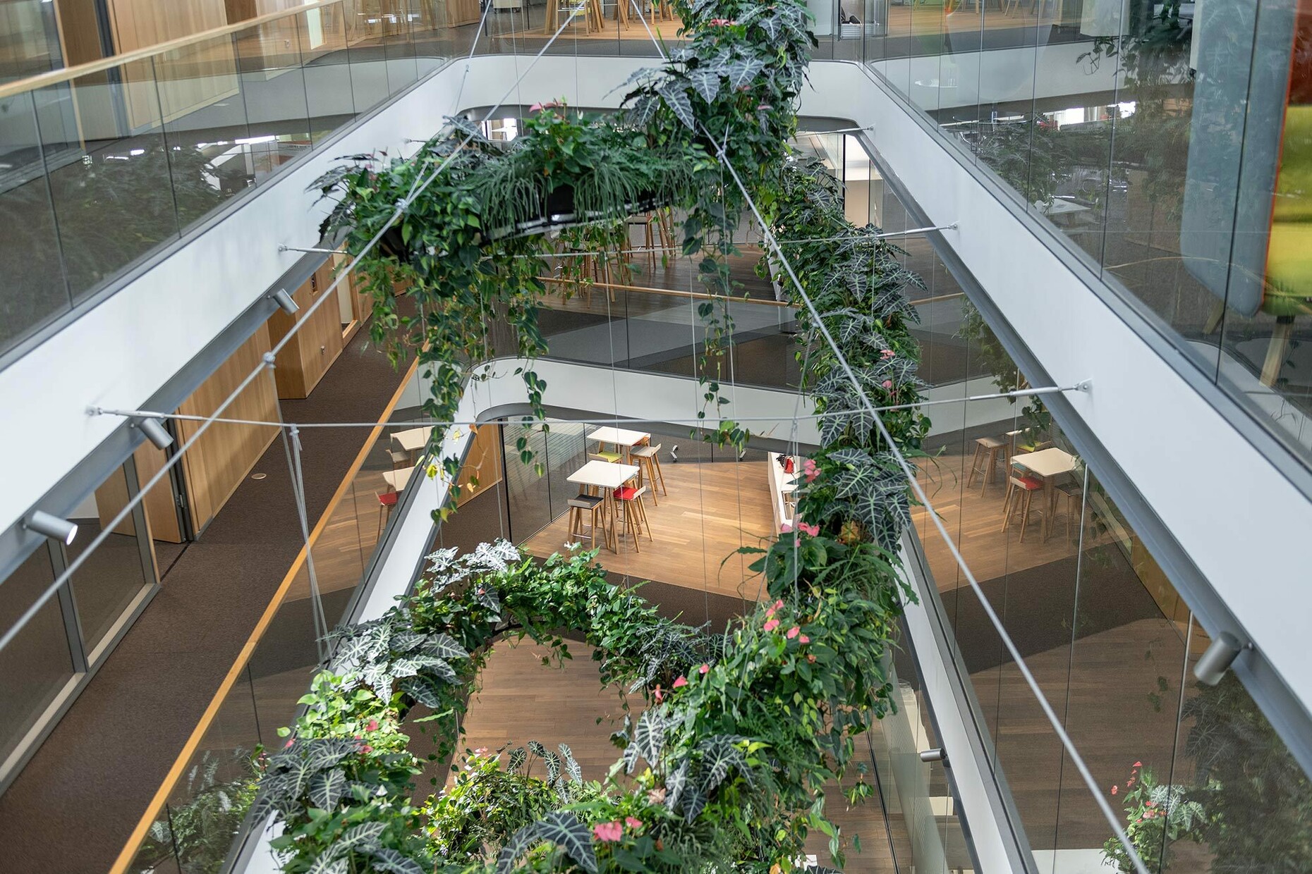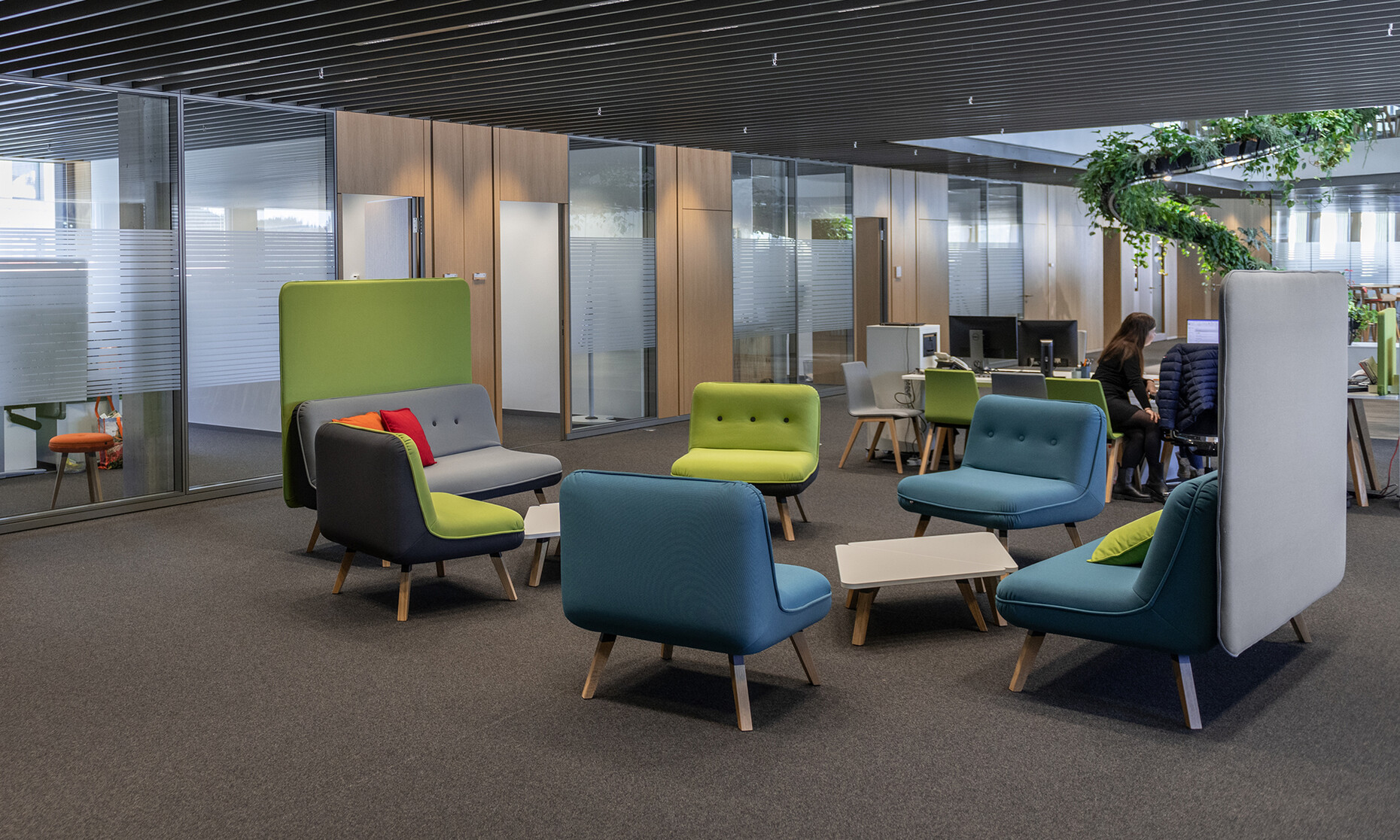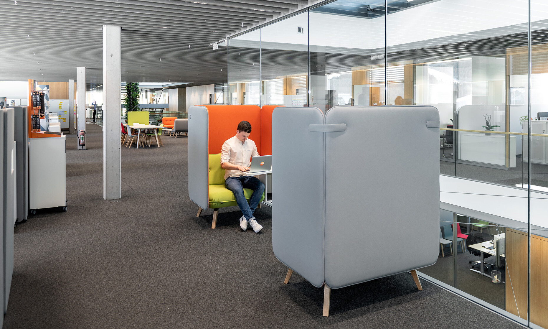 The color selection for the upholstery textiles is an elegant reference to the Black Forest: Subdued natural hues harmonize smoothly with dynamic accents in green, blue, red or orange. A nod to the magnificent landscape around the Titisee lake can also be found in the plants introduced throughout the working areas and the sustainable construction of the two modern buildings designed by architecture office Sacker for Testo SE & Co. KGaA.
