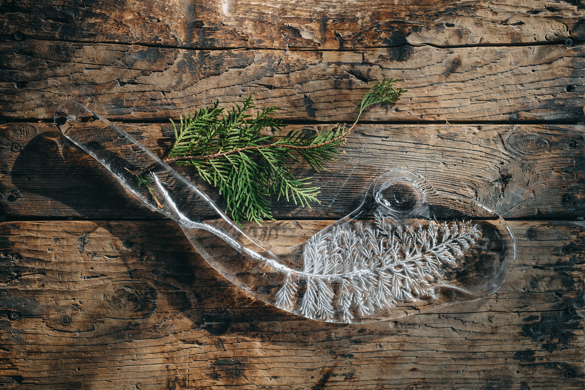 Looking over the shoulders of creative people, visiting studios, craft businesses and factories - no longer a matter of course in times of the Corona pandemic. Insight into the heart of production is missing. The Czech glass and lighting manufacturer Lasvit is well aware of this void: Creative Director Maxim Velčovský is currently presenting "The Nature of Glass" with artistic shots, a virtual journey through the glassworks, the Bohemian nature and to the current light installation "Herbarium" by LASVIT. "Even though we are currently unable to take anyone personally into our world of glass and light, we can still present a virtual excerpt of our craftsmanship and innovations", says Velčovský. For "Herbarium" LASVIT preserves nature - branches, flowers and leafs create a unique imprint in the molten glass poured over them.