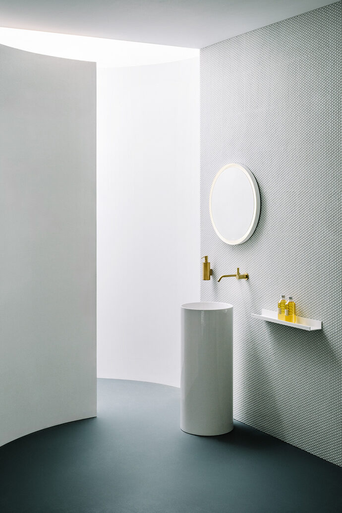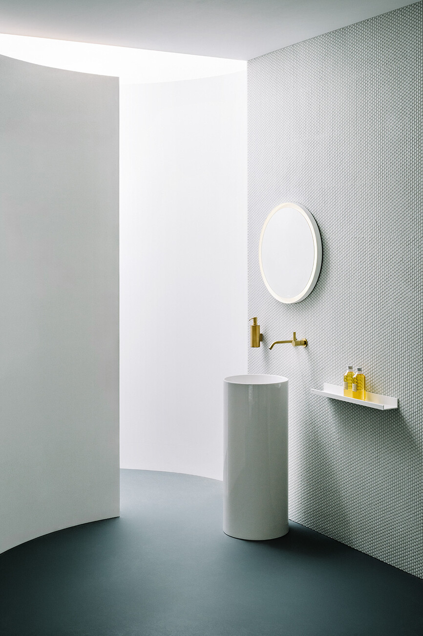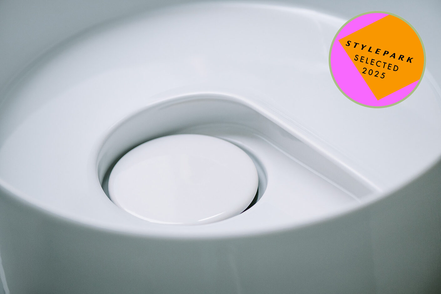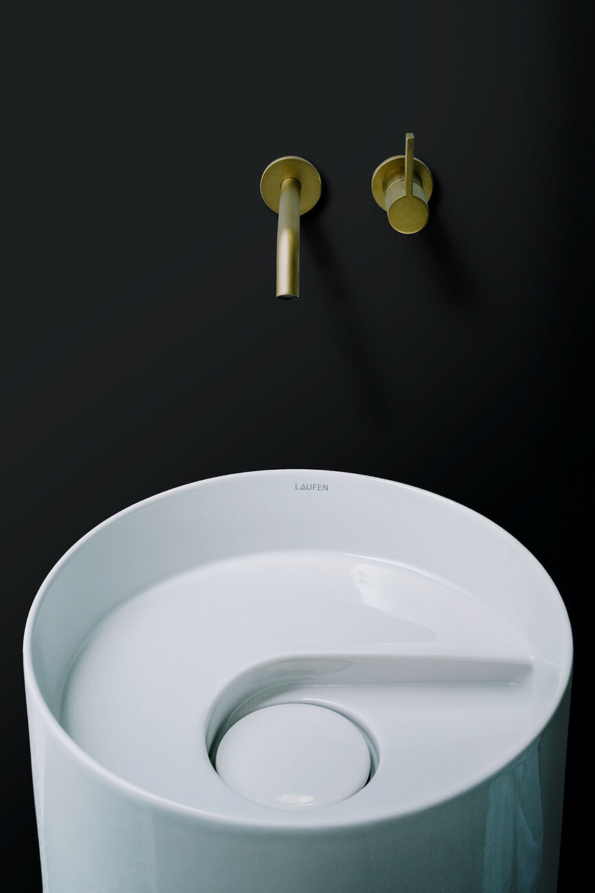 The unusual shape of the basin is the result of intensive research into movement and rhythm: the gently sloping inner surfaces of the round washbasin create a gentle whirlpool – a vortex – that allows the water to be enjoyed for longer, thus promoting awareness of the need to use this precious resource sustainably. At the same time, the controlled movement of the water through the basin makes cleaning easier. At its center is a drain that is accessible from above, thus opening up additional space below the basin. Thanks to the large opening, a classic siphon is not absolutely necessary. Since the water flow can also be directed from an opening at the top of the ramp, the minimalist aesthetics can be impressively showcased.