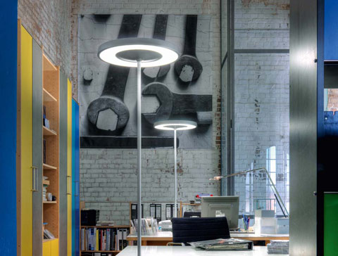 The luminaire Disk follows the same ecological approach. With its energy-saving lamp, it meets the high standards of the Swiss certificate "Minergie", which is to be included in an expanded EU standard. The Light+Building competition for energy-saving luminaires awarded the innovative disk the title "Light of the Future 2008" - over eighteen other competing entries. No wonder. Apart from its energy efficiency and sleek shape it also boasts excellent anti-glare properties. Thirty percent of the light is emitted directly making it the ideal choice as a working luminaire. The greater portion of the light shines indirectly at the ceiling creating a pleasant mood.