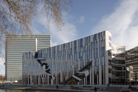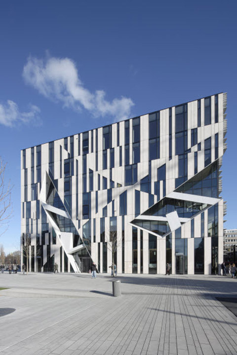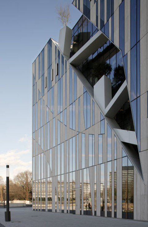 Libeskind’s new complex encompasses two buildings with a total of 36,000 square meters and linked by a suspended bridge. The façade is like a labyrinth. It consists of altogether 2,800 horizontal, vertical and curving elements – a complex special structure of glass panels and Roman travertine. So-called “cuts”, large incisions in the façade, have been landscaped and break up the structure so that the 26-meter-high building blends into the urban environment.