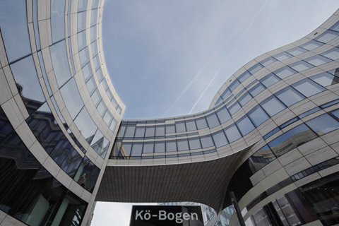 The modular layout inside the building can only be guessed at behind the façade structure of the Kö-Bogen. Photo © Lindner Group, Robert Mehl