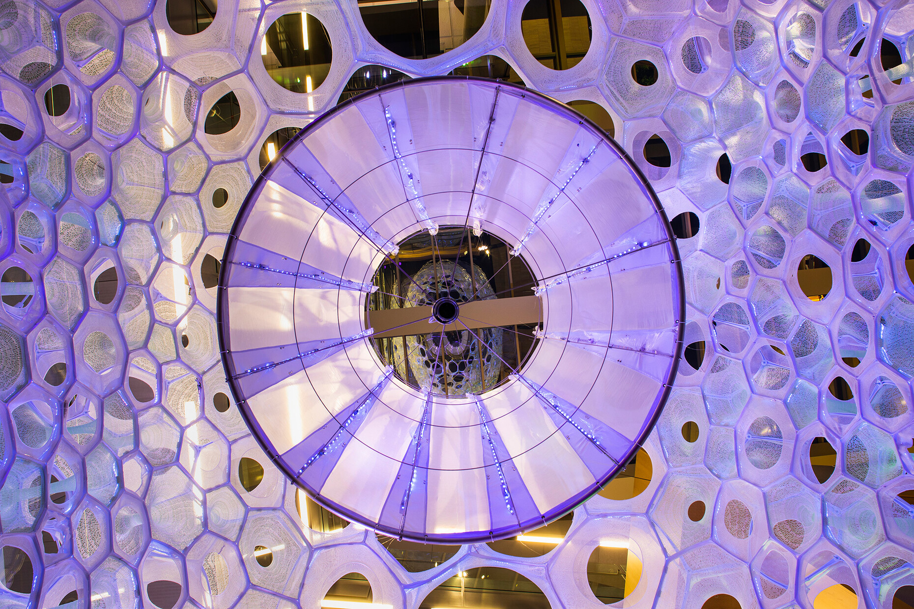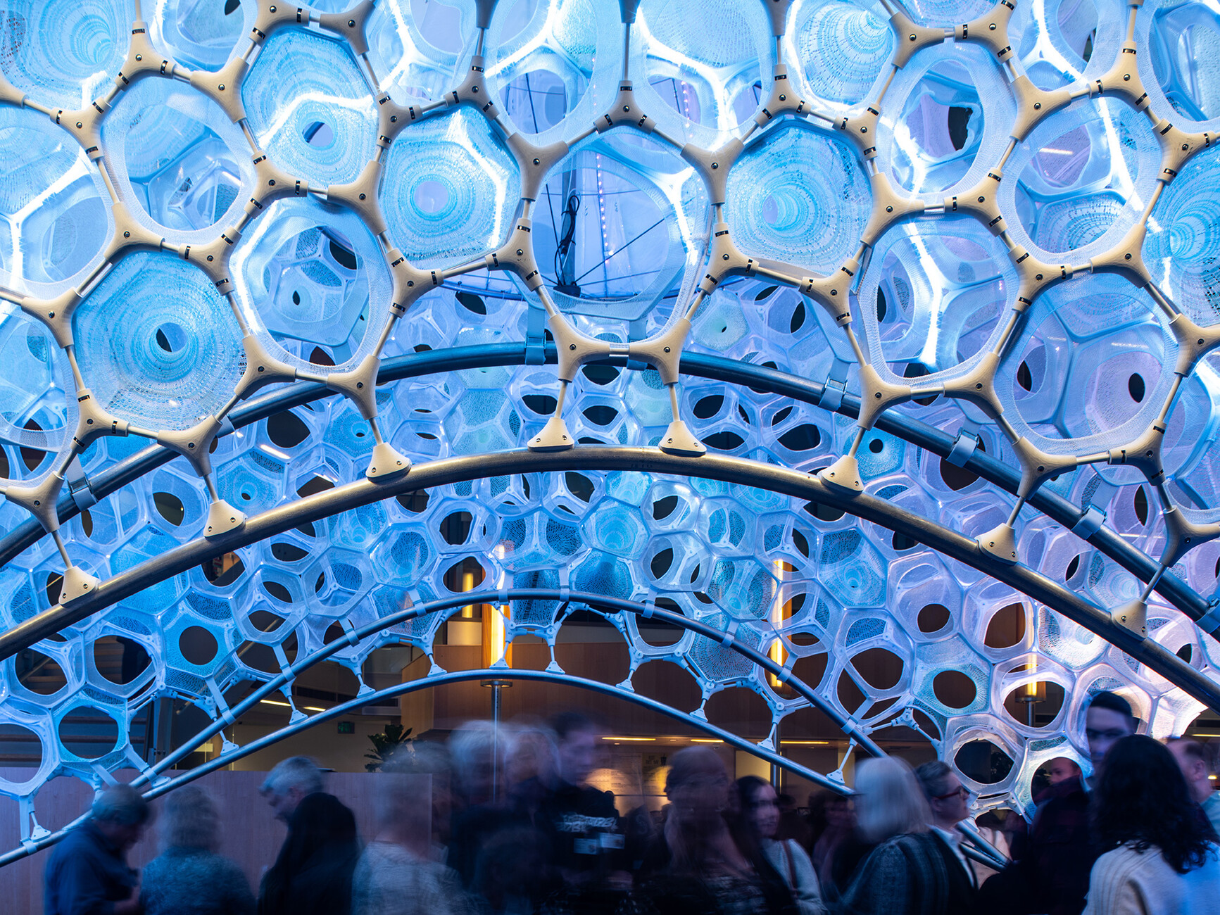 Studies are currently being conducted on a wide range of light-related aspects. For example, in her project “Ada”, architect, designer and artist Jenny Sabin explores light as a medium that brings about an interaction between people and spaces. The experimental architecture “Ada” is a responsive lighting system including a network of addressable LEDs. The latter respond in real time to the continual flows of data and produce emotional data as colors and brightness within the pavilion structure. To this end the pavilion, realized in collaboration with Microsoft, is powered by artificial intelligence. The light fabric-knit structure of data-controlled components uses textiles and photoluminescent fibers that absorb and emit light. In collaboration with researchers and engineers at Microsoft Research, Ada is driven by individual and collective emotional data collected in the Microsoft Research Building 99 in Redmond, Washington. Integrated sensors and cameras mean visitors can interact with Ada since the AI-algorithms process facial movements, voice tones and sounds. Ada celebrates an architecture, which is “happy to see you” and “smiles back at you”.