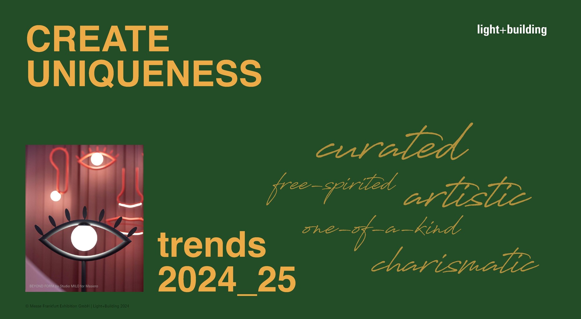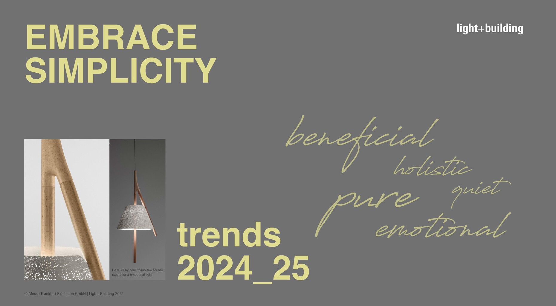 The halls of Messe Frankfurt will soon be all about lighting and building technology again: Light + Building is already in the starting blocks and will present an extensive programme from 3 to 8 March 2024. This includes the trend presentation for 2024/25 by style agency bora.herke.palmisano in the Design Plaza in Hall 3.1. The team has analysed three trends, which will be presented both in the special show and in the lectures – "Welcome Tomorrow", "Embrace Simplicity" and "Create Uniqueness". For the forecast, Claudia Herke, Cem Bora and Annetta Palmisano analysed international trends in interior design, art, lifestyle and fashion. "Welcome Tomorrow" thus describes the combination of craftsmanship and pioneering technologies that result in extraordinary designs. The aesthetics of the design sometimes appear supernatural and offer illusory effects.