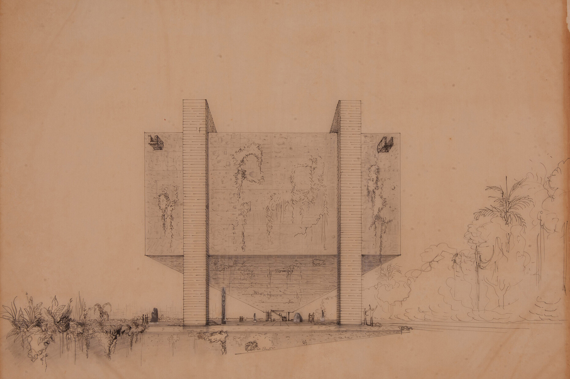 The military coup in Brazil in 1964 initially put an abrupt end to Bo Bardi's work on public commissions. As in Italy, she had also expressed herself politically in Brazil. Three major projects of hers thus remained unbuilt, while she worked mainly on exhibitions, film and theatre projects. Her husband remained director at MASP and Bo Bardi was commissioned in 1977 to demolish the enormous old SESC Pompéia factory in a poor district of São Paulo and build a modern sports and leisure centre in its place. She never considered demolishing the building, however, but instead investigated how this relic could also be preserved with little intervention and transformed into a symbol of change. Next to the enormous chimney, she placed two mighty new buildings with exposed concrete façades: a twelve-storey tower and a roughly ten-storey cuboid with completely irregular window openings that can be closed from the inside with rough sliding, bright red wooden elements. She extended distinctive concrete bridges between the two buildings, on which users of the stacked sports fields and swimming pool can visibly walk back and forth. She filled the remaining halls of the old factory with a spatially distinctively and generous new structure of brick and concrete, into which she inserted all conceivable forms of event halls, stages, meeting places, assembly rooms and a district library. Bo Bardi even designed the poster for the centre's opening in 1986 herself: Flowers now sprouting from an old chimney. From a symbol of industrial labour, she created a building for festive, social togetherness using great imagination and few resources.