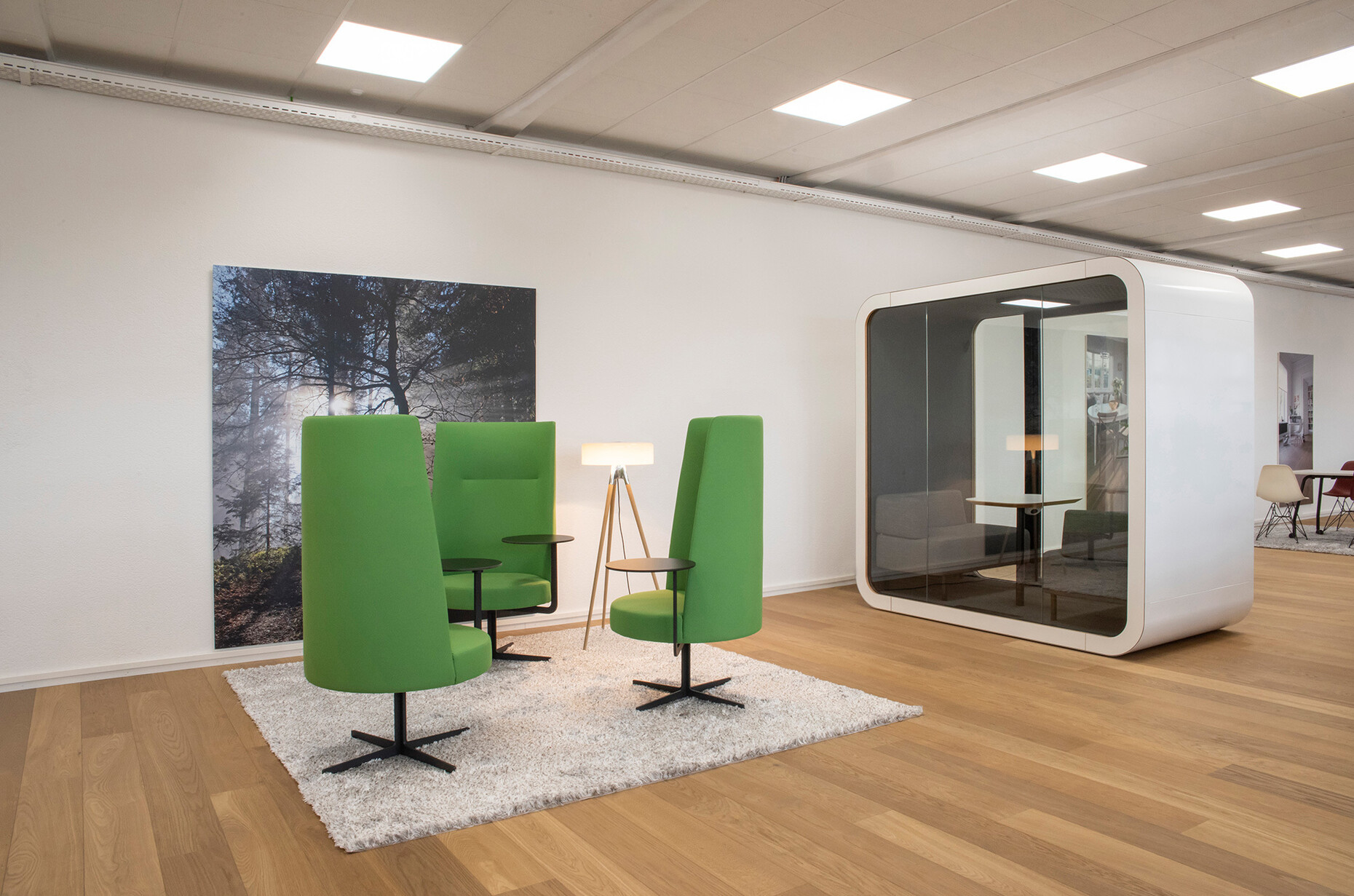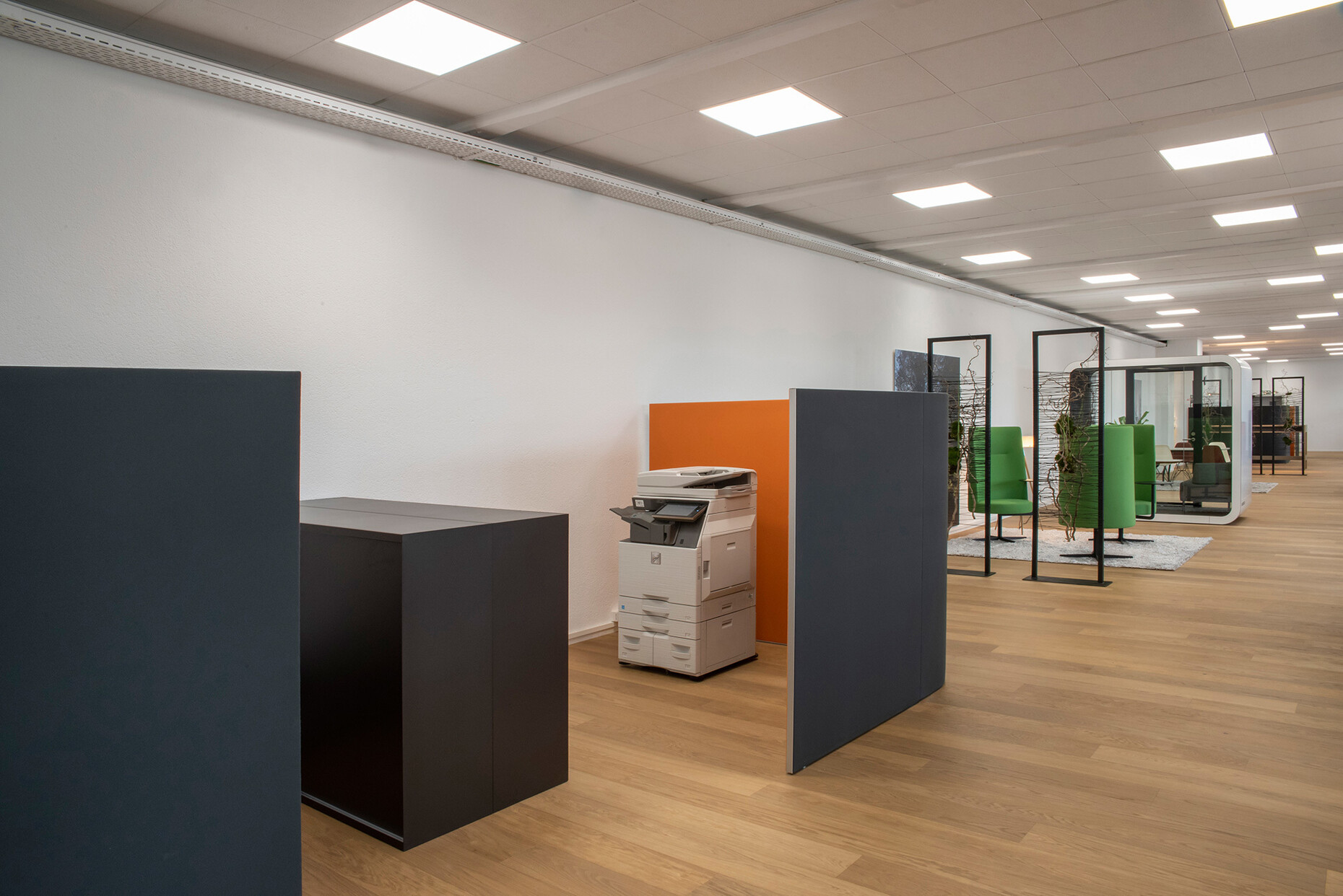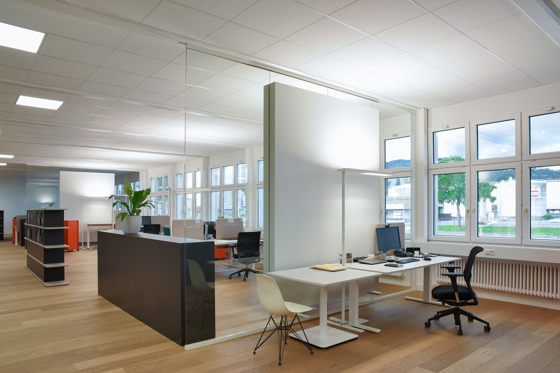 The single largest “furniture item” in terms of area, according to Bauwerk Parkett, is its wooden flooring. Small wonder, then, that the company founded as long ago as 1944 has opted for an open-plan concept for its own premises, which shows off the vitality of wood as a material in the office to particularly pleasing effect. Hence the company now welcomes its customers not only to its in-house showroom, but also behind the scenes to reveal one of its own floors directly in use. The conversion of the 450-square-meter space was preceded by an innovation process in which the longstanding Swiss company reviewed its internal systems and consequentially decided to get rid of the individual offices previously in place. As part of this process, existing hierarchies were consistently called into question, hence the CEO’s office has now also taken on an additional function as a seating area. The aim was to make it easier for employees to communicate and to provide them with a multifunctional environment. At the same time, the company wanted to retain some more private spaces for one-to-one discussions.