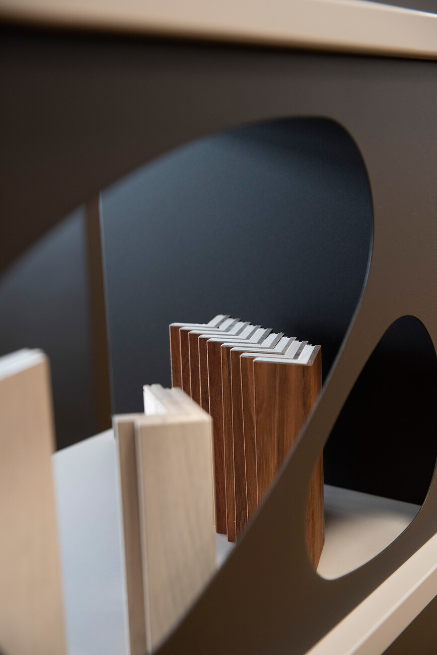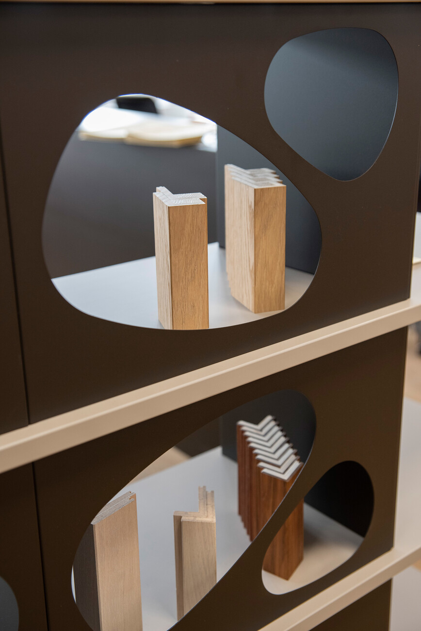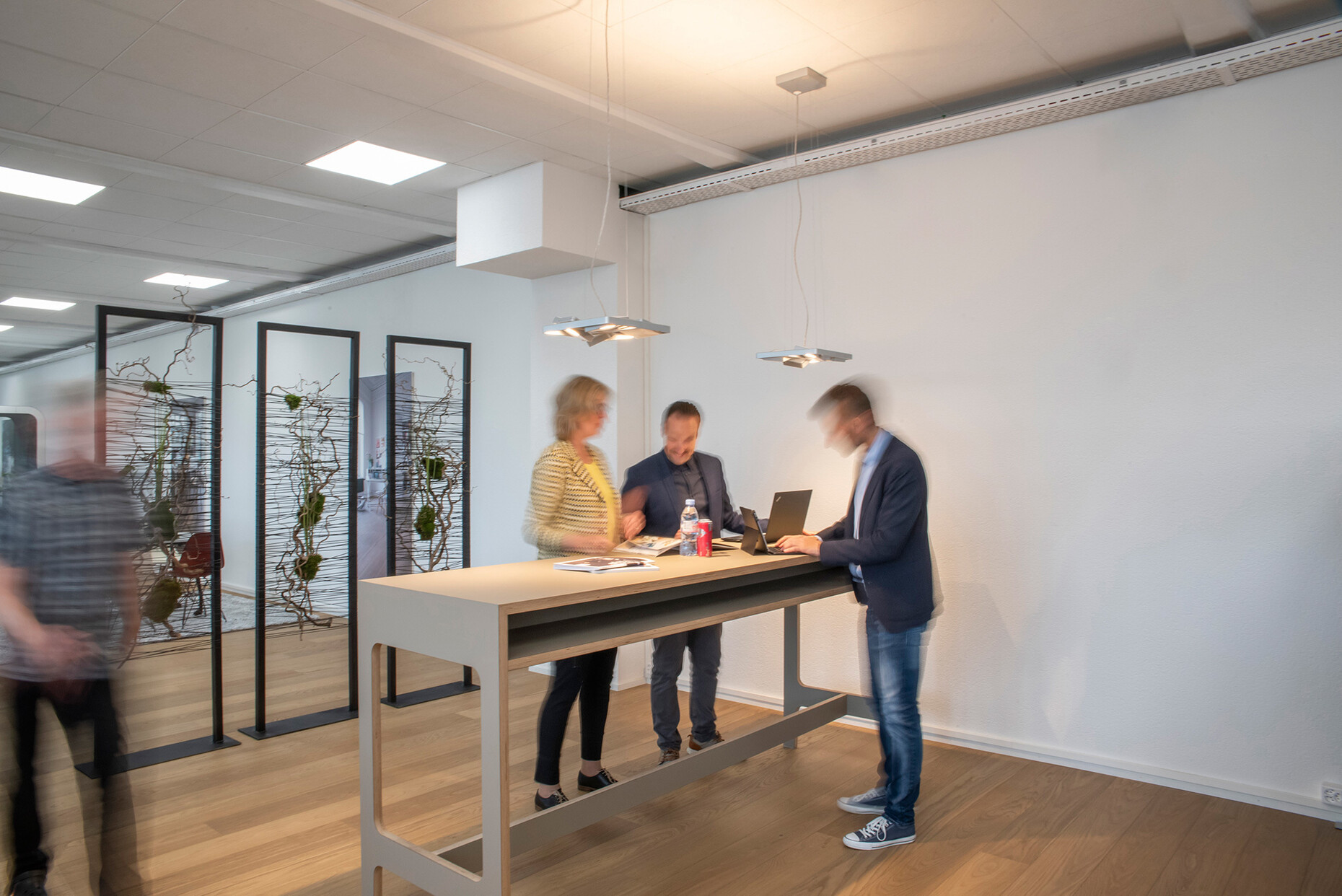 The single largest “furniture item” in terms of area, according to Bauwerk Parkett, is its wooden flooring. Small wonder, then, that the company founded as long ago as 1944 has opted for an open-plan concept for its own premises, which shows off the vitality of wood as a material in the office to particularly pleasing effect. Hence the company now welcomes its customers not only to its in-house showroom, but also behind the scenes to reveal one of its own floors directly in use. The conversion of the 450-square-meter space was preceded by an innovation process in which the longstanding Swiss company reviewed its internal systems and consequentially decided to get rid of the individual offices previously in place. As part of this process, existing hierarchies were consistently called into question, hence the CEO’s office has now also taken on an additional function as a seating area. The aim was to make it easier for employees to communicate and to provide them with a multifunctional environment. At the same time, the company wanted to retain some more private spaces for one-to-one discussions.
