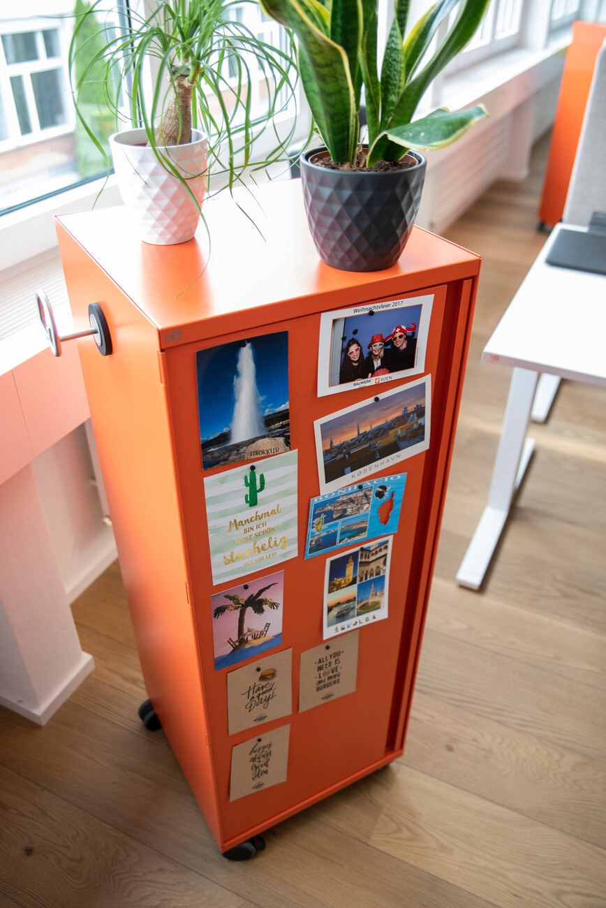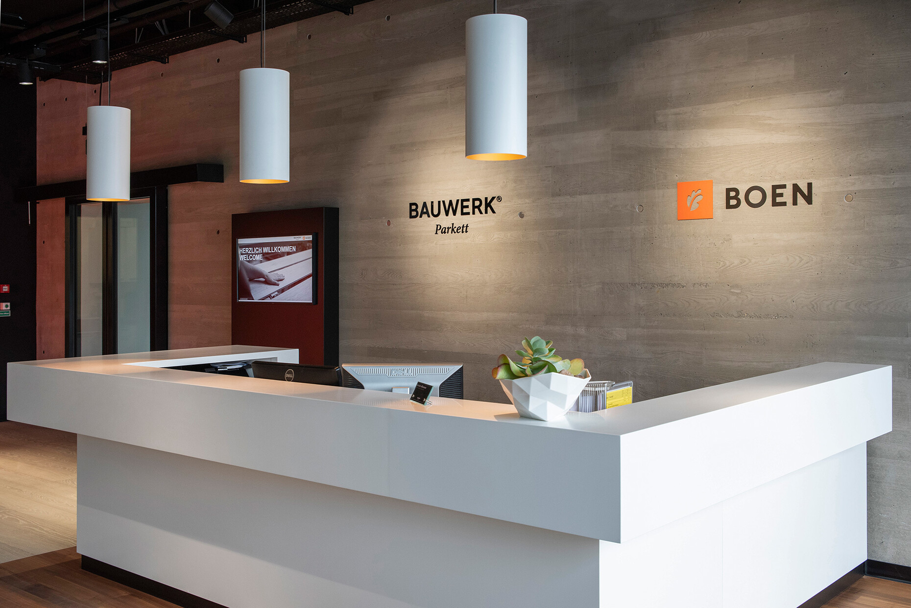 The Swiss furnishing experts at Lista Office LO were at hand to help. Their furniture systems score points not only for the excellent production quality and top-notch materials, but also for their flexibility. The LO Next shelving system, which won the Red Dot Award for product design, divides the office spaces along their long axis and maintains sufficient openness so that the division of meeting and work areas does not disrupt the flow of the room. The LO One cupboard family delivers additional enclosed spaces, forming the backs of the individual workstations and creating ample possibilities for storage space with options like sliding doors, roller shutters, drawers, open shelving, folding doors and even a coatrack. Further stowage space is provided by the LO Caddies / LO Korpusse, which are available in different sizes and colors. At Bauwerk Parkett, the roller containers are tailored to match the LO tables and cupboard systems, creating a splash of orange along the window and adding a playful lightness to the space. For the tables, the company opted for the models LO Extend and LO Motion. Thanks to its electrical height adjustment, the former can be used as a desk for sitting or standing and forms the center of the relevant workstation. Similar flexibility is found in the LO Motion family of tables, from which the Bauwerk Parkett conference table comes and which are available in extra-large sizes of up to 3200 x 1200 millimeters. Space for everyone, therefore, and not just the CEO.