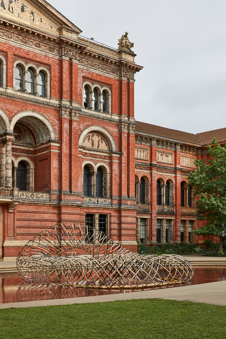 To conclude our tour around London, we return to the Victoria & Albert Museum to see Kengo Kuma’s “Bamboo Ring”. The sculpture takes the form of a ring curving upwards and was realized in line with the architect’s instructions using a combination of bamboo and carbon fibers. In his choice of materials Kuma, who designed the V&A museum in Dundee which opened last year, combines Japanese high-tech with Japanese tradition. Nevertheless, his sculpture remains a little incoherent. Yes, it takes the form of the small basin in which it stands, and yes, it brings a vertical thrust to the Madejski Garden. Ultimately though, the form of the large-scale sculpture is just too banal to be poetic.