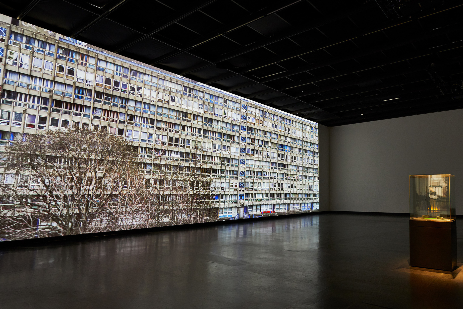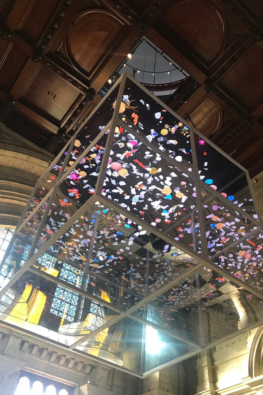 This cannot be said, however, of “Sea Things” by Sam Jacob, an enormous, transparent cube that hangs in the museum’s magnificent entrance hall. Jacob’s installation addresses the issue of marine pollution. He does this in such a highly aesthetic way that the message behind the beauty of the object is barely perceptible: Within the cube colorful animations of rubbish floating in the sea are projected onto the walls. Through manifold reflection, these images are given a distant, intangible quality, becoming almost decorative and ornamental. Incidentally, Jacob leaves his trace as an architect in the reduced form of the glass cube with its delicate steel profiles – a homage to Ray and Charles Eames, he explains.