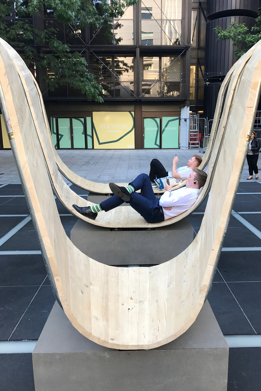 The trail continues to London’s East End, namely Shoreditch, the location for the giant “Please be Seated” bench sculpture by Paul Cocksedge: three concentric rings of wide benches, each of which forms waves that are as even as they are dynamic. The installation has been placed in the new Finsbury Avenue Square, which took shape as part of the redevelopment of the Liverpool Street Station area to create an office district. The sculpture is designed to serve as a place for lunchbreaks for staff in the surrounding buildings, but one that will not get in the way of passers-by making their way to the neighboring station. Its innovative shape makes it possible to walk under the “crests” of the waves and to sit or lie in their “troughs”. “It occupies the square without blocking it,” says Cocksedge, describing the essence of his installation.