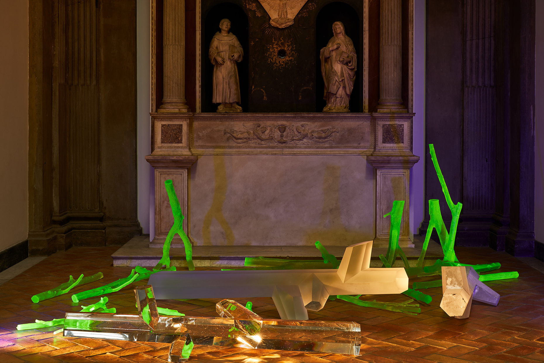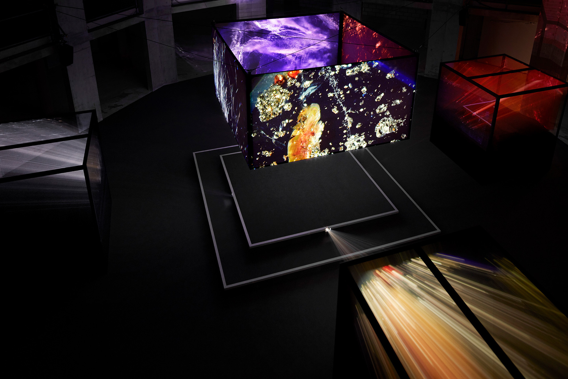 Staying in East London: An extraordinary location is the setting for the light installation “Void”, which designer Dan Tobin Smith, who works primarily as a photographer, has developed together with “The Experience Machine”, a studio specializing in light art and projections. In a backyard in the borough of Islington, “Void” fills the shell of an underground theater that was never finished. The latter was supposed to resemble the shape of Shakespeare’s famous Globe Theatre and therefore consists of a round atrium surrounded by galleries. At the center of this ghost development, made of bare concrete and devoid of daylight, the designer places a cube of canvas and uses projections to transform it into a magic lantern that bathes the otherwise pitch-black gallery levels in a multicolored, shimmering light. Here, the images appearing abstractly on the cube become almost incidental. In fact, they are photomicrographs of various precious stones. Anyone who doesn’t know this might easily believe they are looking into outer space or the deep blue sea.