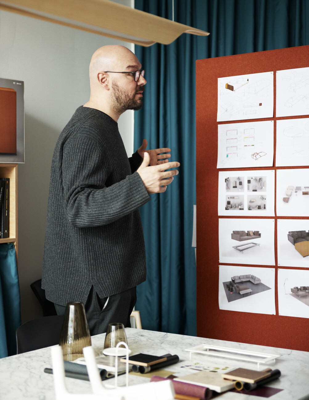 Luca Nichetto: I always try to enrich a large piece of furniture like this sofa with smaller designs that lend the overall idea a slightly different spin. Together with the upholstered elements, we have designed two tables that use the same design language and materiality as the sofa. Our coffee table, for example, rests on a frame derived from the substructure of the sofa. In contrast, a small side table, which also has a metal frame, adds a somewhat playful note to the collection.