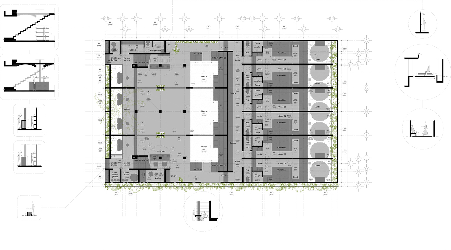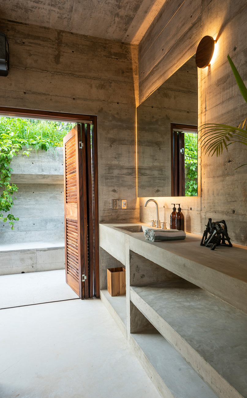 For the structure of the house, he used two historic hydraulic buildings as models: the Cisterna Basilica in Istanbul and the Hornsey Wood Reservoir in Finsbury Park, London. It allows for an interplay of privacy and light, of architecture and nature. Tropical climbing plants, fruit trees with bananas and passion fruit partially overgrow the walls, into the 600 square metre interior of the hotel. Six suites on the ground floor have private gardens, while three on the upper floor are equipped with an outdoor bathtub.