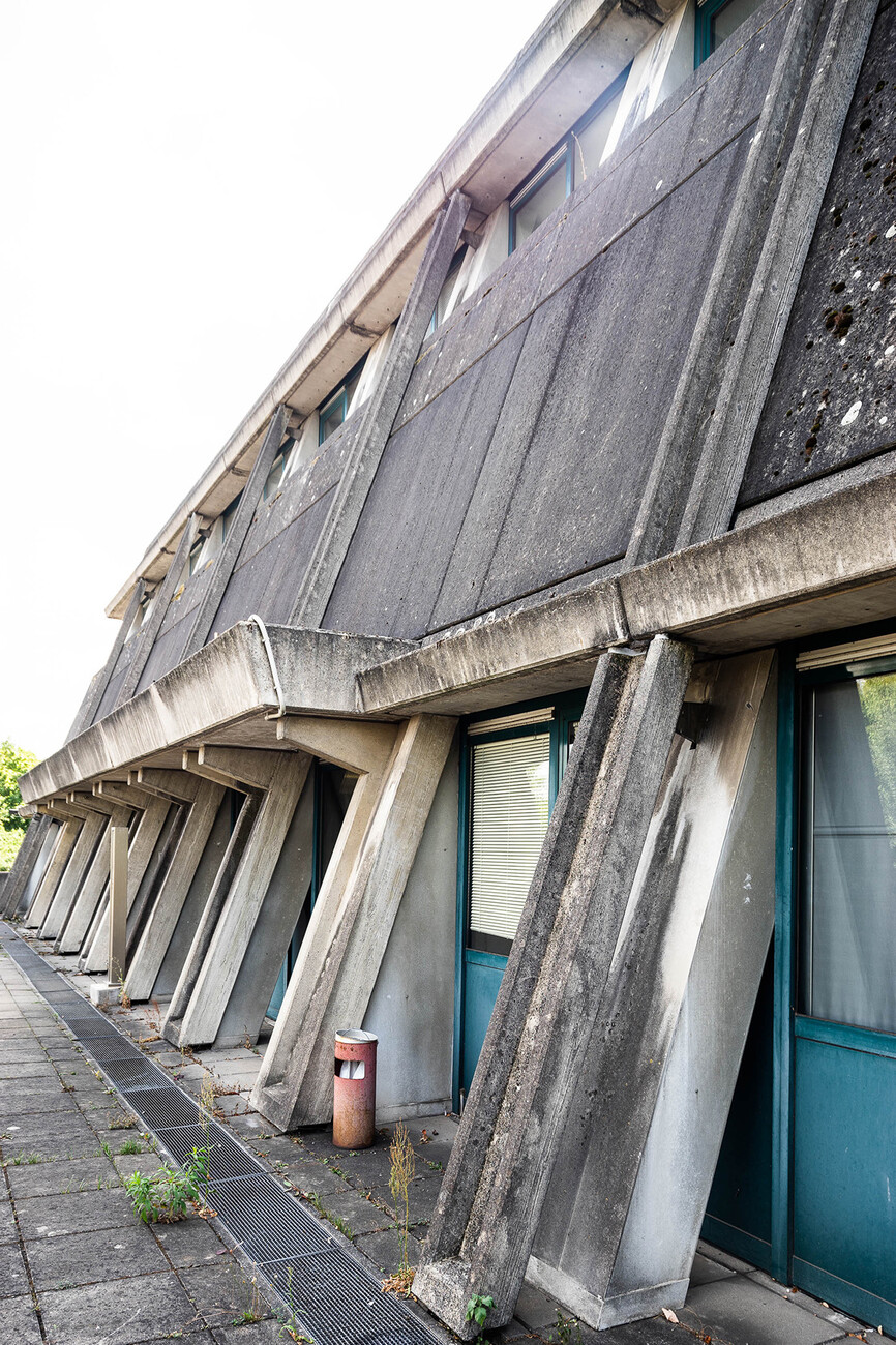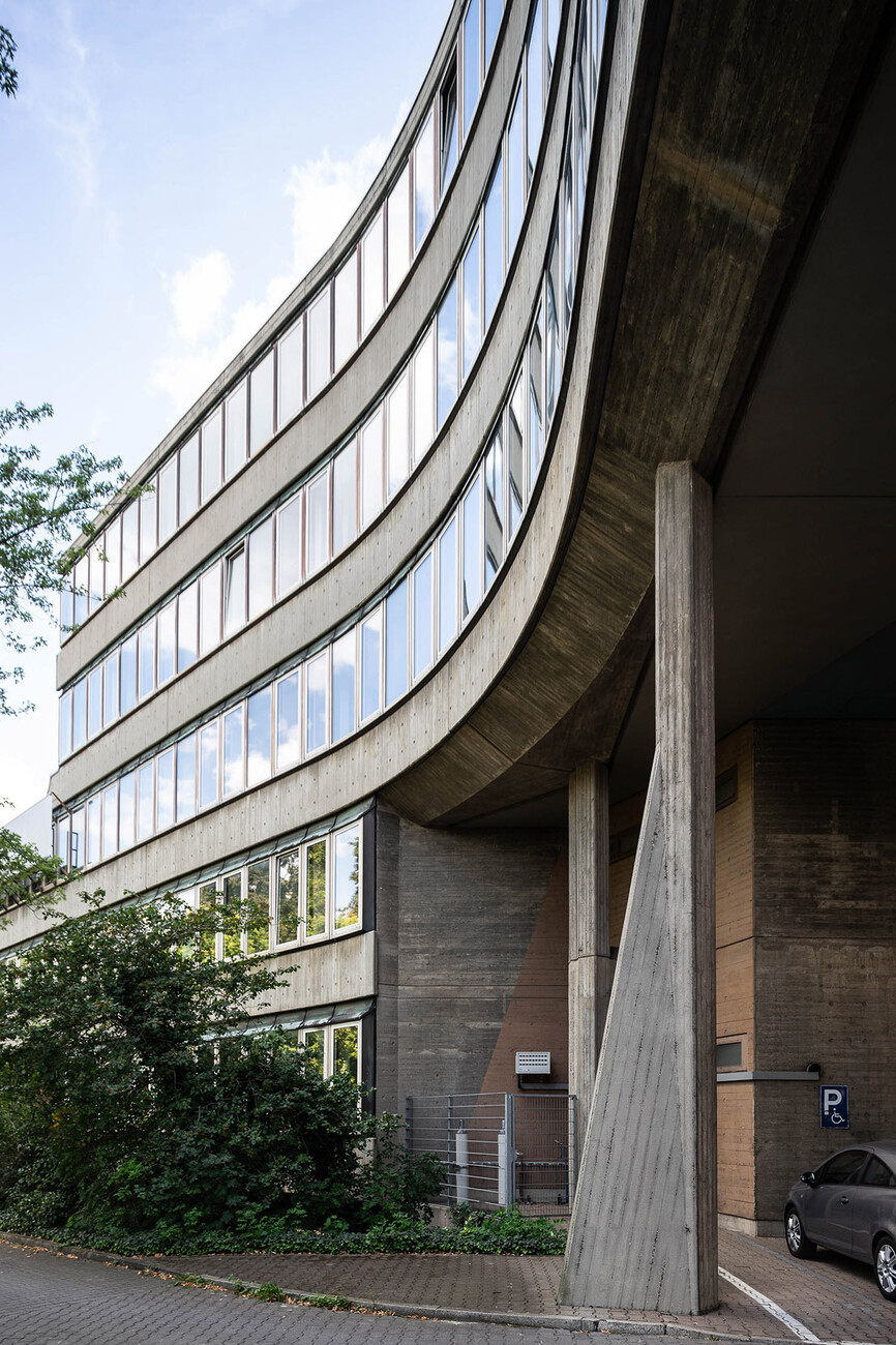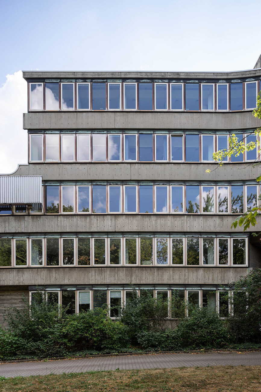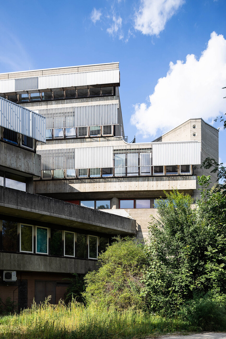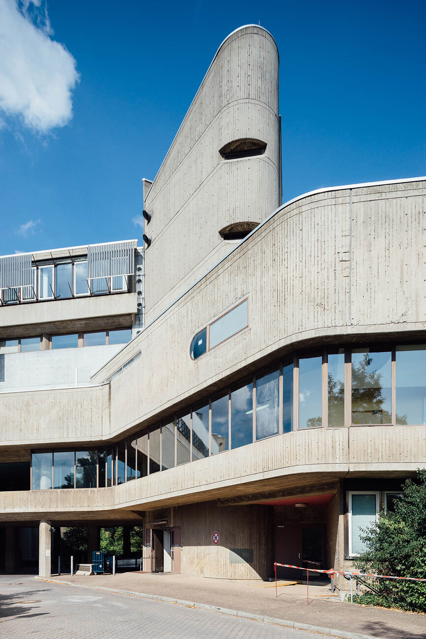 The research institute for experimental medicine at the Berlin Charité teaching hospital, fondly referred to as the mice bunker, and the Institute for Hygiene and Microbiology, located opposite on Krahmerstrasse, are presumably the most prominent sections of the Benjamin Franklin campus in Berlin’s Lichterfelde district. Not far from the Teltow canal, the "mice bunker" was, albeit with interruptions, from the mid-1960s until 1980 the Central Animal Lab at Berlin’s Free University designed and realized by Magdalena and Gerd Hänska as well as Kurt Schmersow, whereas the Brutalist structure opposite was masterminded and executed between 1966 and 1974 by Hermann Fehling and Daniel Gogel.