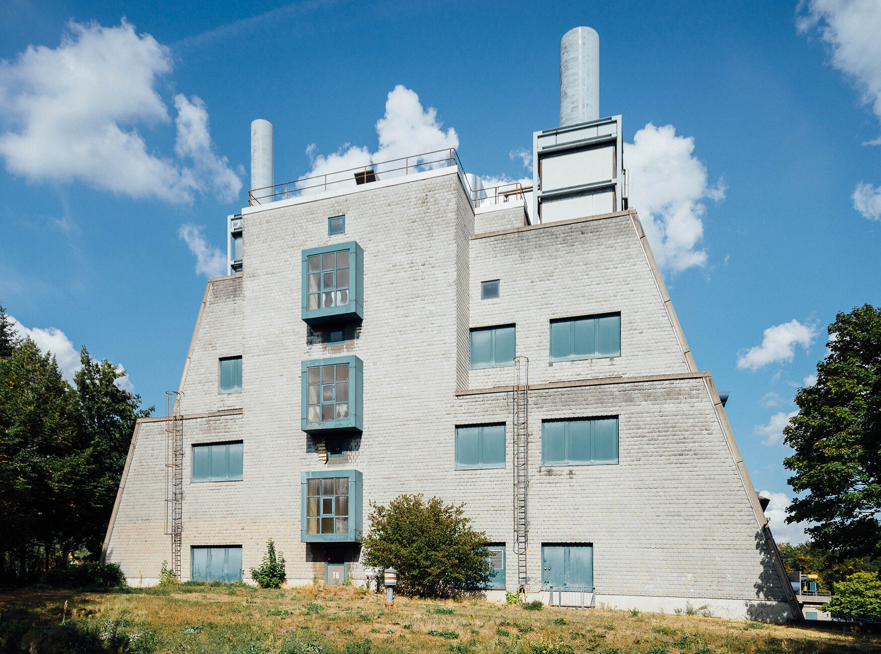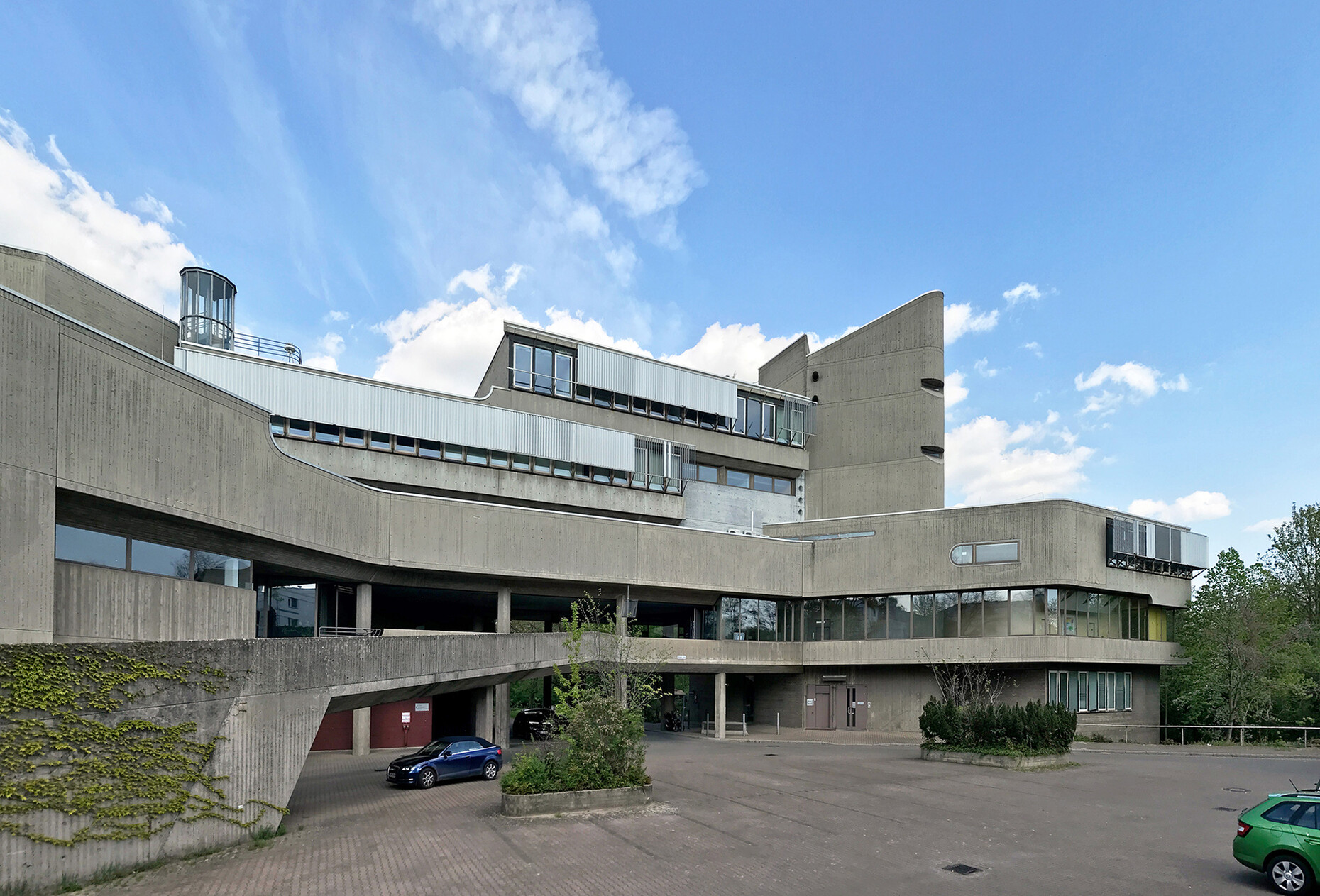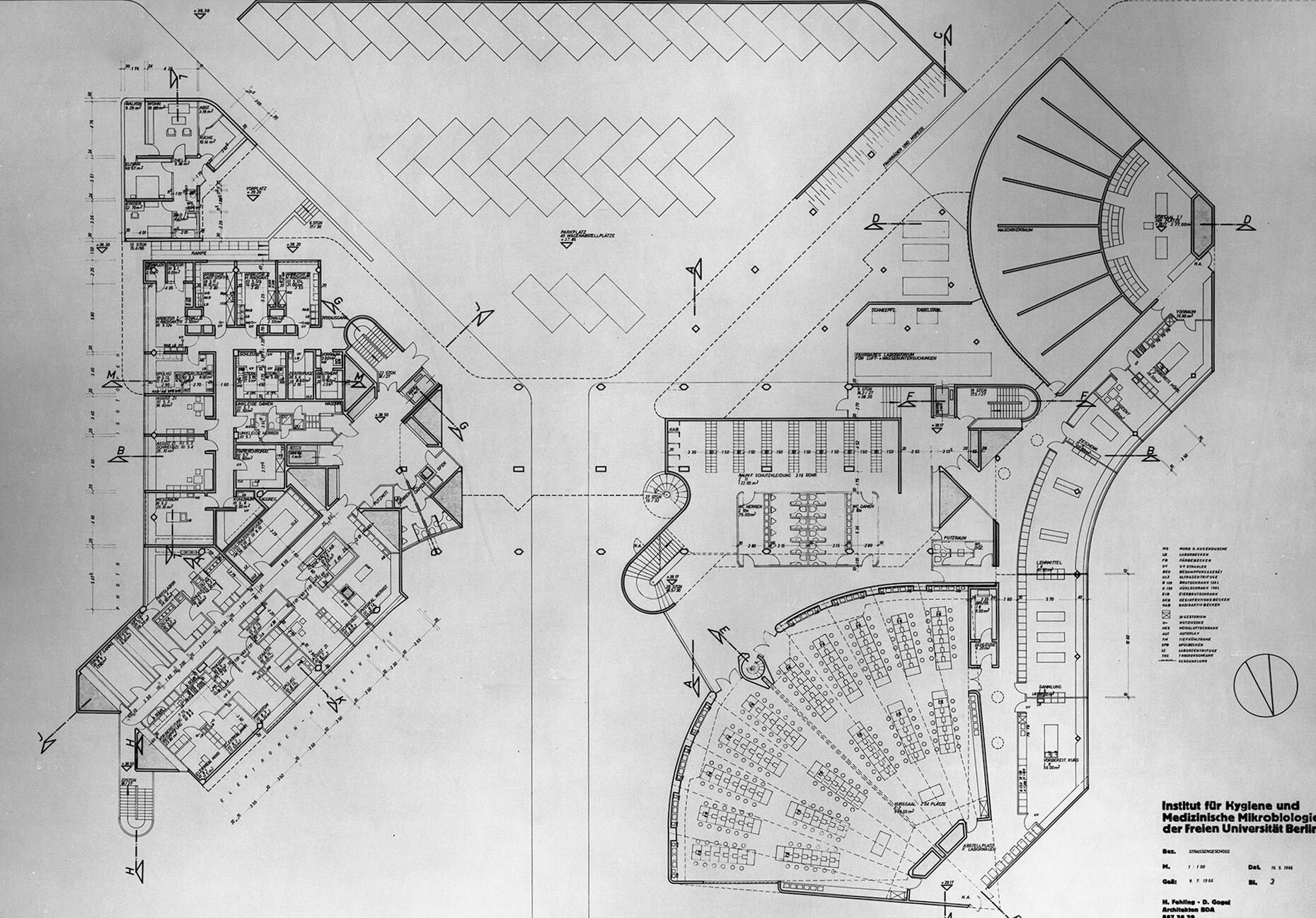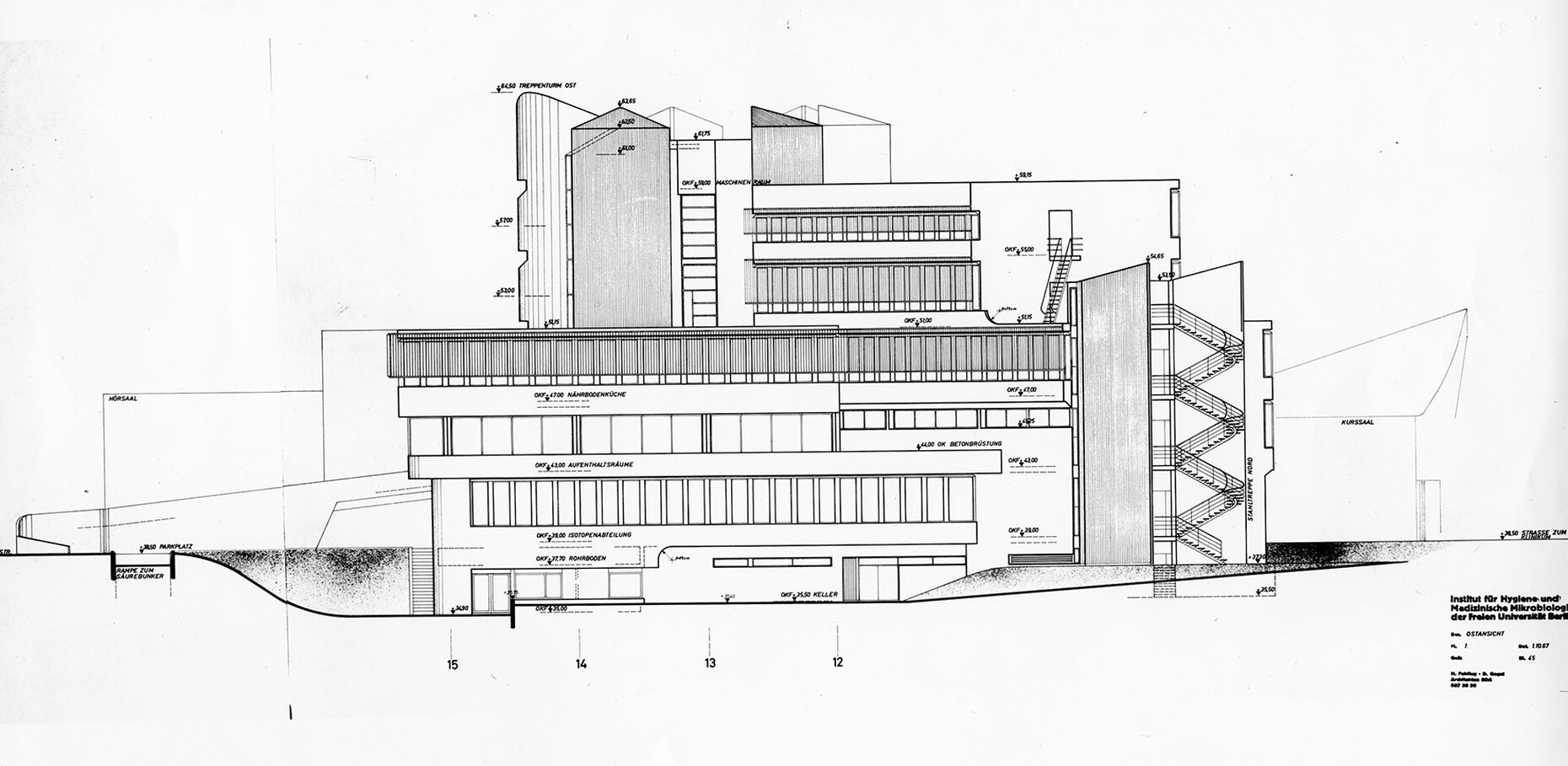 The research institute for experimental medicine at the Berlin Charité teaching hospital, fondly referred to as the mice bunker, and the Institute for Hygiene and Microbiology, located opposite on Krahmerstrasse, are presumably the most prominent sections of the Benjamin Franklin campus in Berlin’s Lichterfelde district. Not far from the Teltow canal, the "mice bunker" was, albeit with interruptions, from the mid-1960s until 1980 the Central Animal Lab at Berlin’s Free University designed and realized by Magdalena and Gerd Hänska as well as Kurt Schmersow, whereas the Brutalist structure opposite was masterminded and executed between 1966 and 1974 by Hermann Fehling and Daniel Gogel.