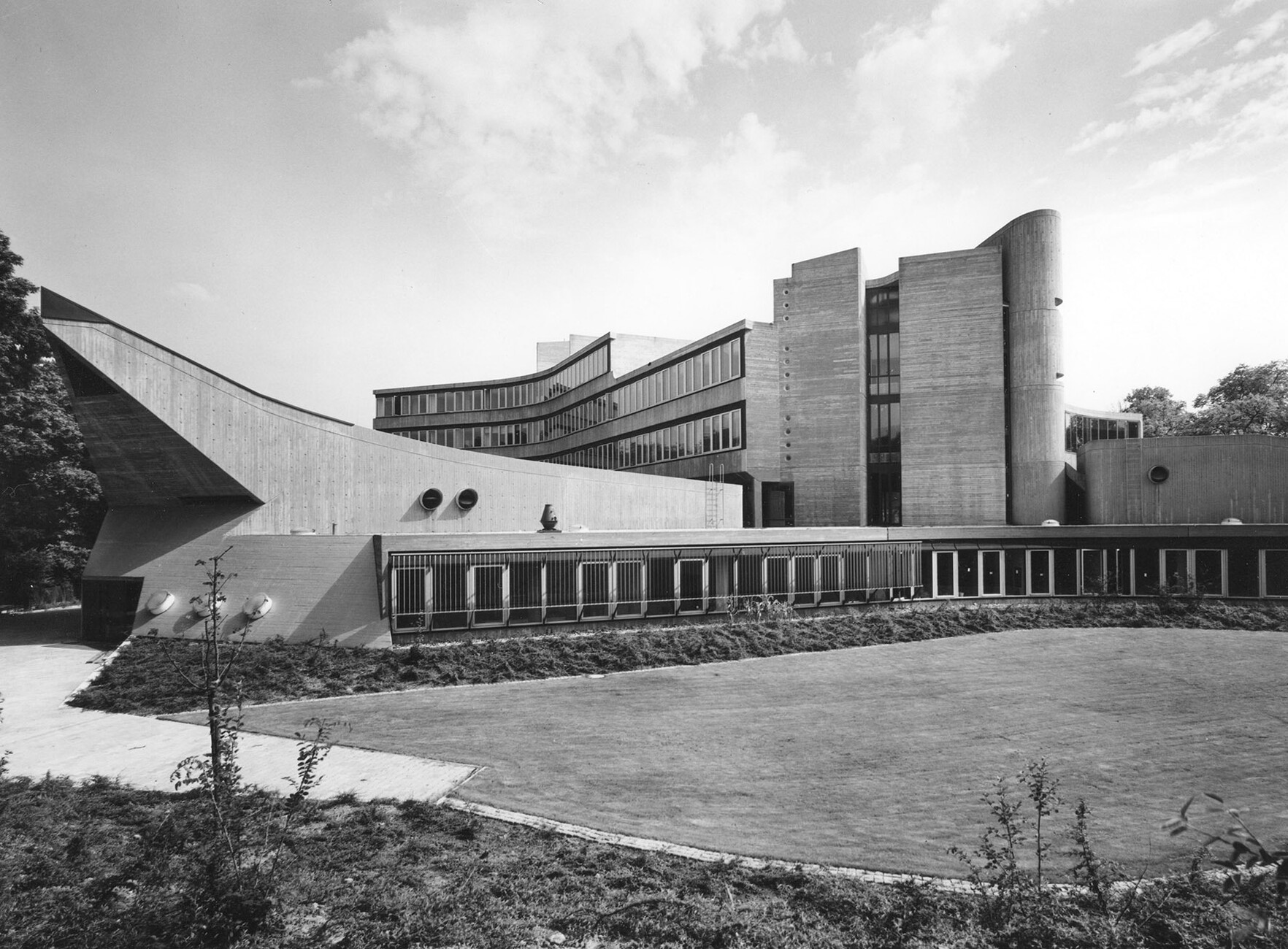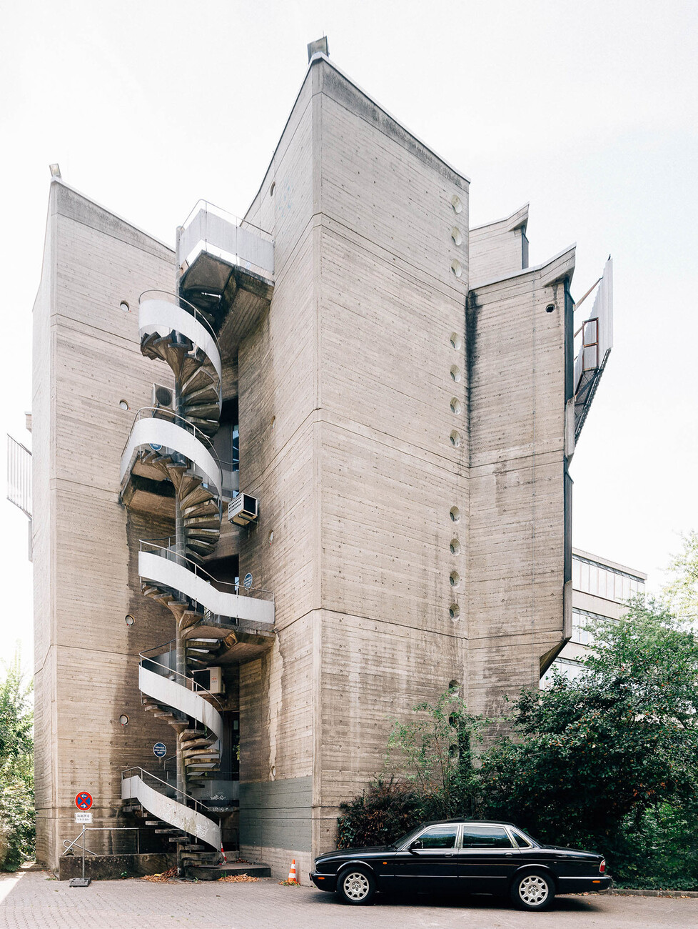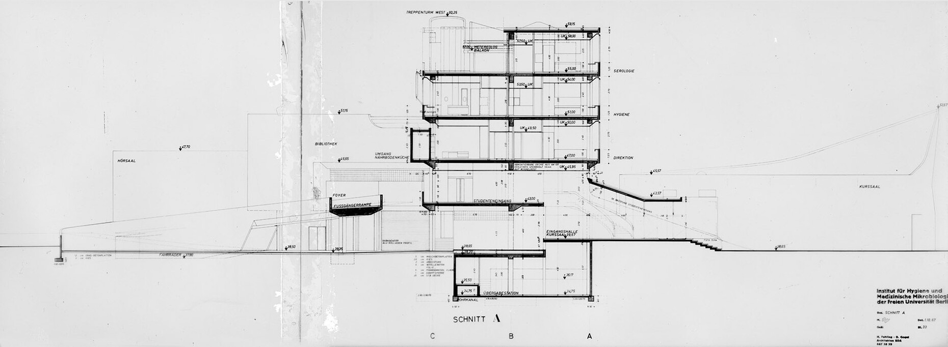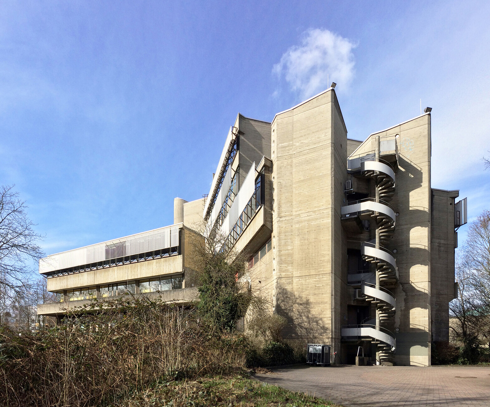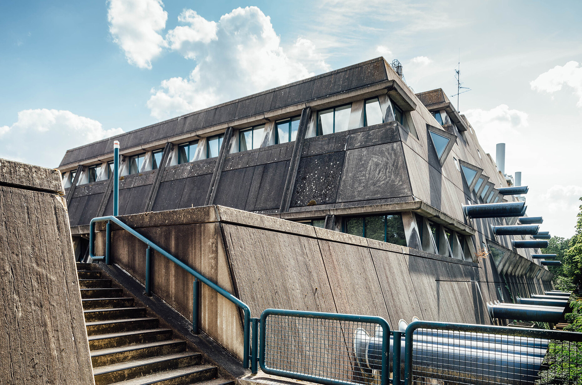 The research institute for experimental medicine at the Berlin Charité teaching hospital, fondly referred to as the mice bunker, and the Institute for Hygiene and Microbiology, located opposite on Krahmerstrasse, are presumably the most prominent sections of the Benjamin Franklin campus in Berlin’s Lichterfelde district. Not far from the Teltow canal, the "mice bunker" was, albeit with interruptions, from the mid-1960s until 1980 the Central Animal Lab at Berlin’s Free University designed and realized by Magdalena and Gerd Hänska as well as Kurt Schmersow, whereas the Brutalist structure opposite was masterminded and executed between 1966 and 1974 by Hermann Fehling and Daniel Gogel.