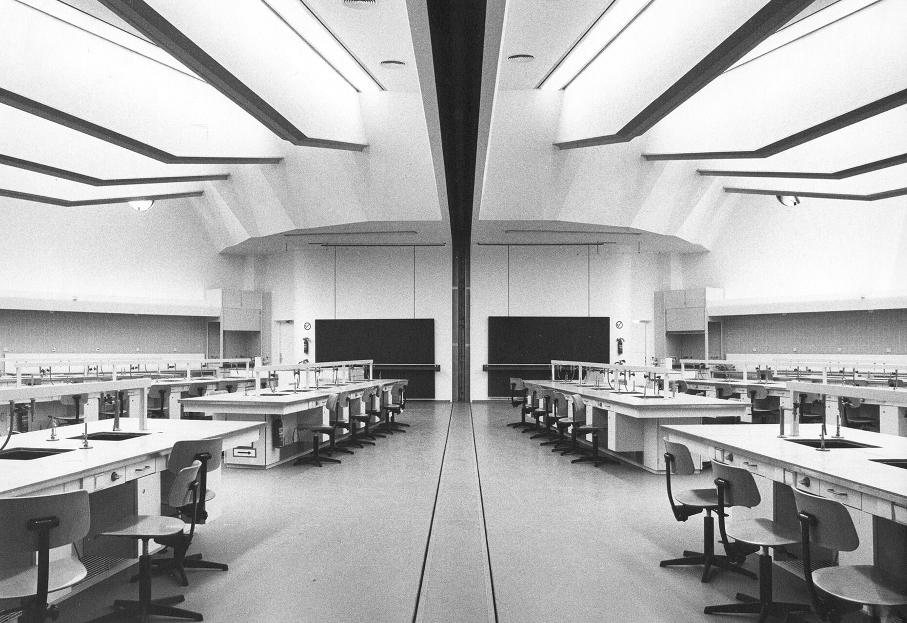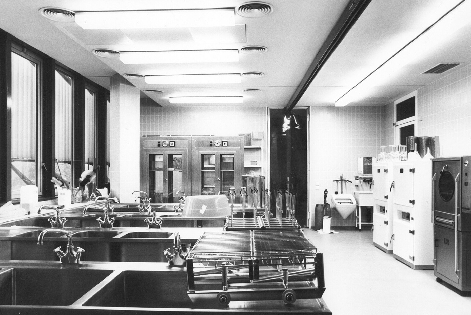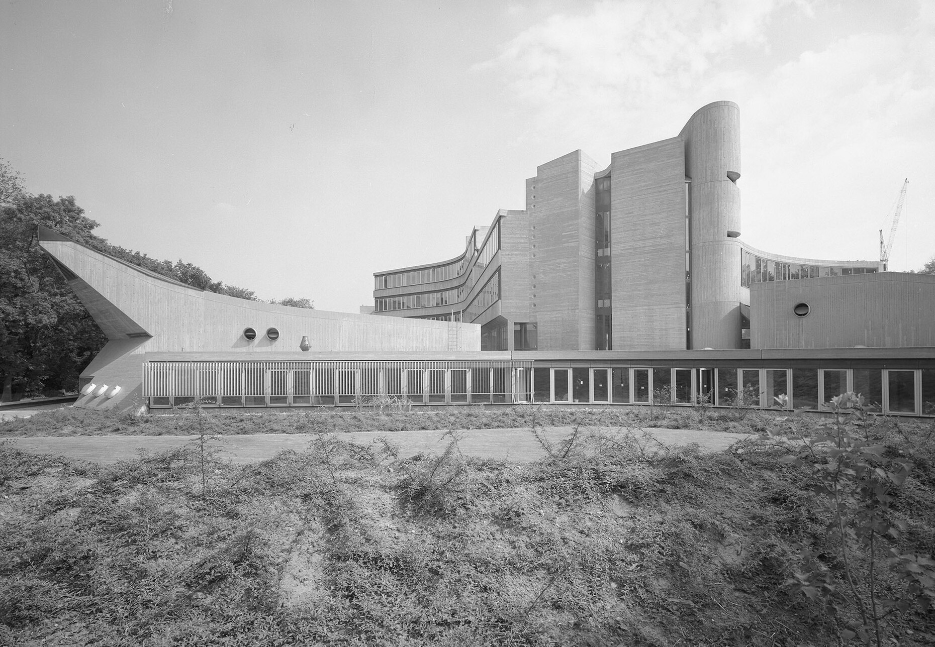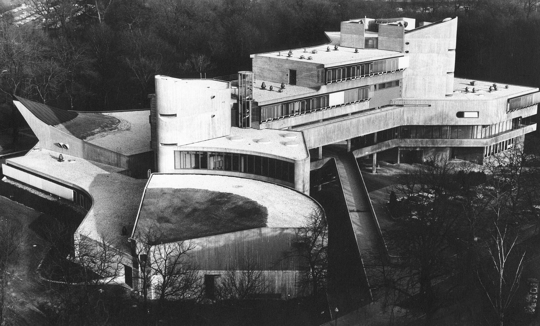 The research institute for experimental medicine at the Berlin Charité teaching hospital, fondly referred to as the mice bunker, and the Institute for Hygiene and Microbiology, located opposite on Krahmerstrasse, are presumably the most prominent sections of the Benjamin Franklin campus in Berlin’s Lichterfelde district. Not far from the Teltow canal, the "mice bunker" was, albeit with interruptions, from the mid-1960s until 1980 the Central Animal Lab at Berlin’s Free University designed and realized by Magdalena and Gerd Hänska as well as Kurt Schmersow, whereas the Brutalist structure opposite was masterminded and executed between 1966 and 1974 by Hermann Fehling and Daniel Gogel.